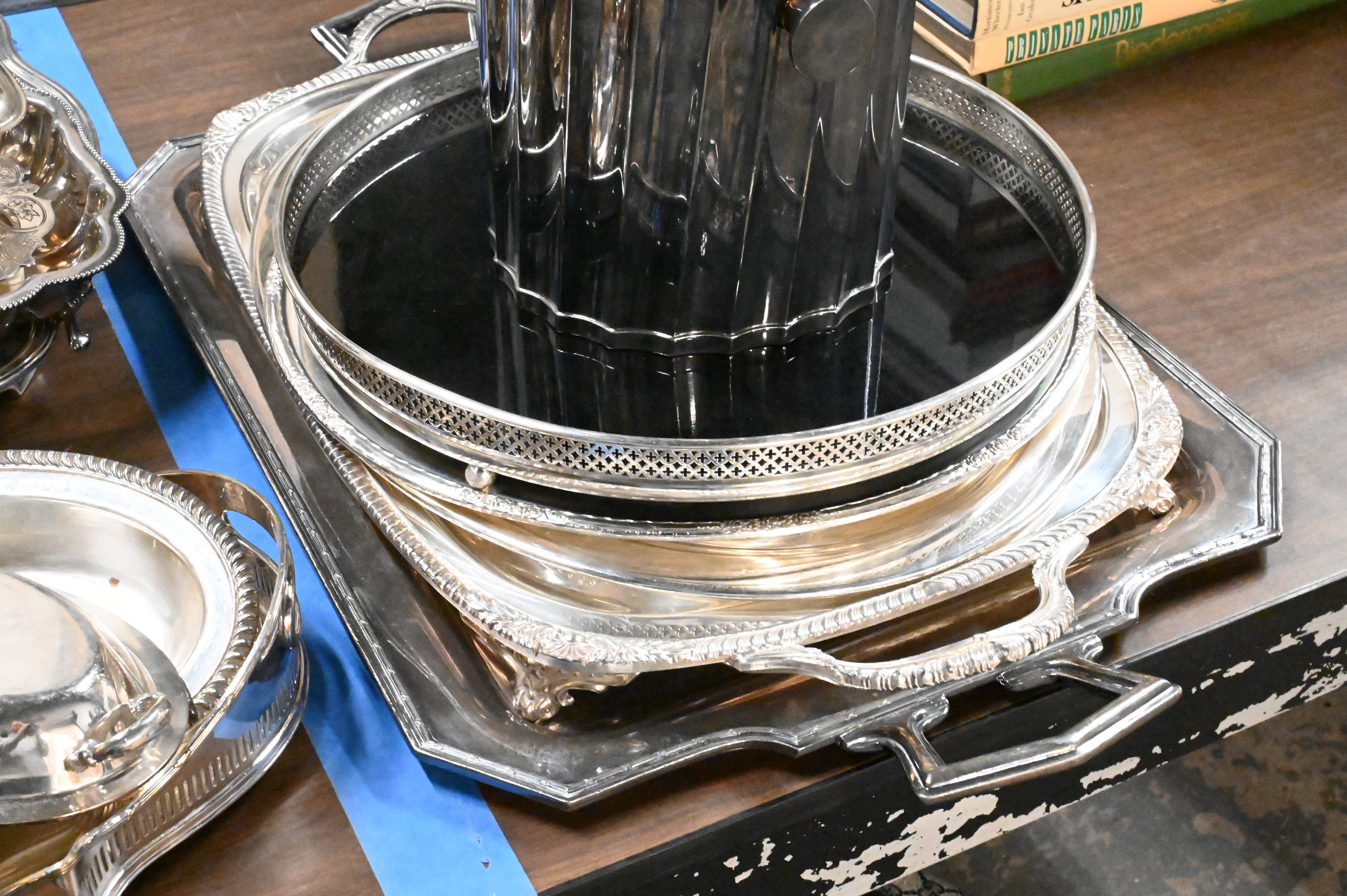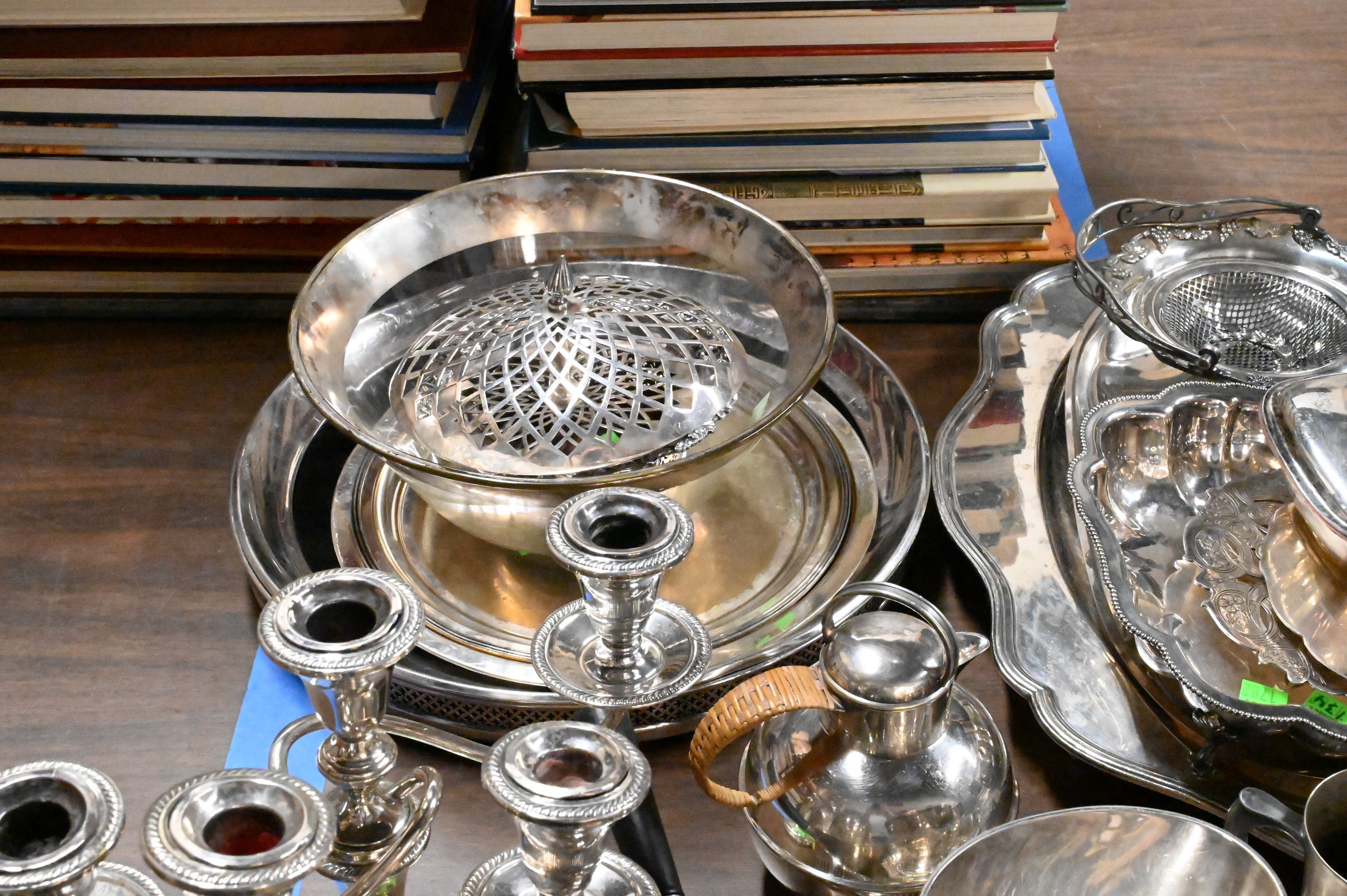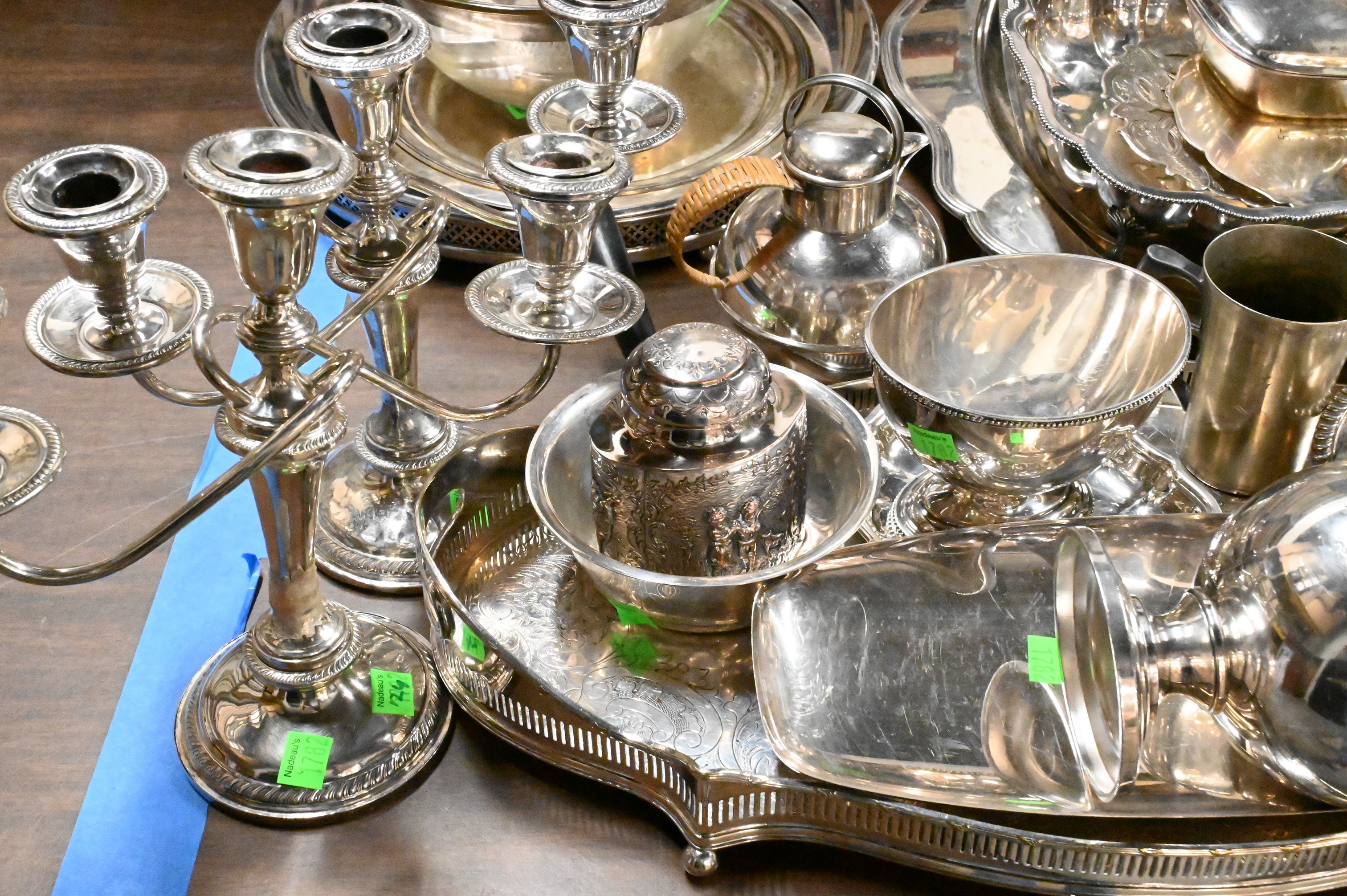 to include pair of weighted sterling candelabras (as is), along with silver plated trays, bowls, flask, etc.