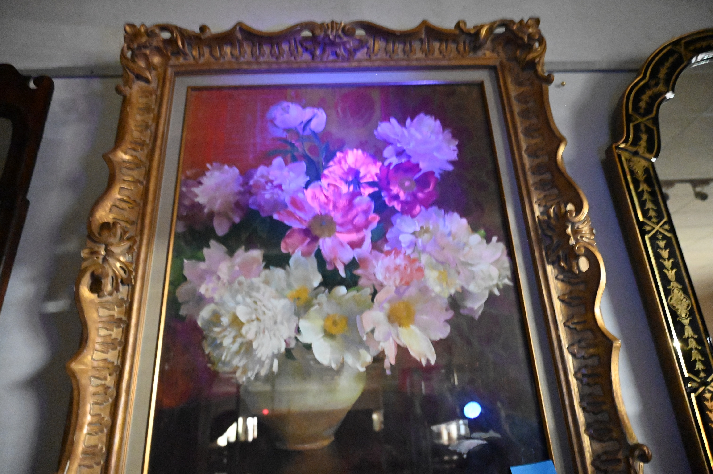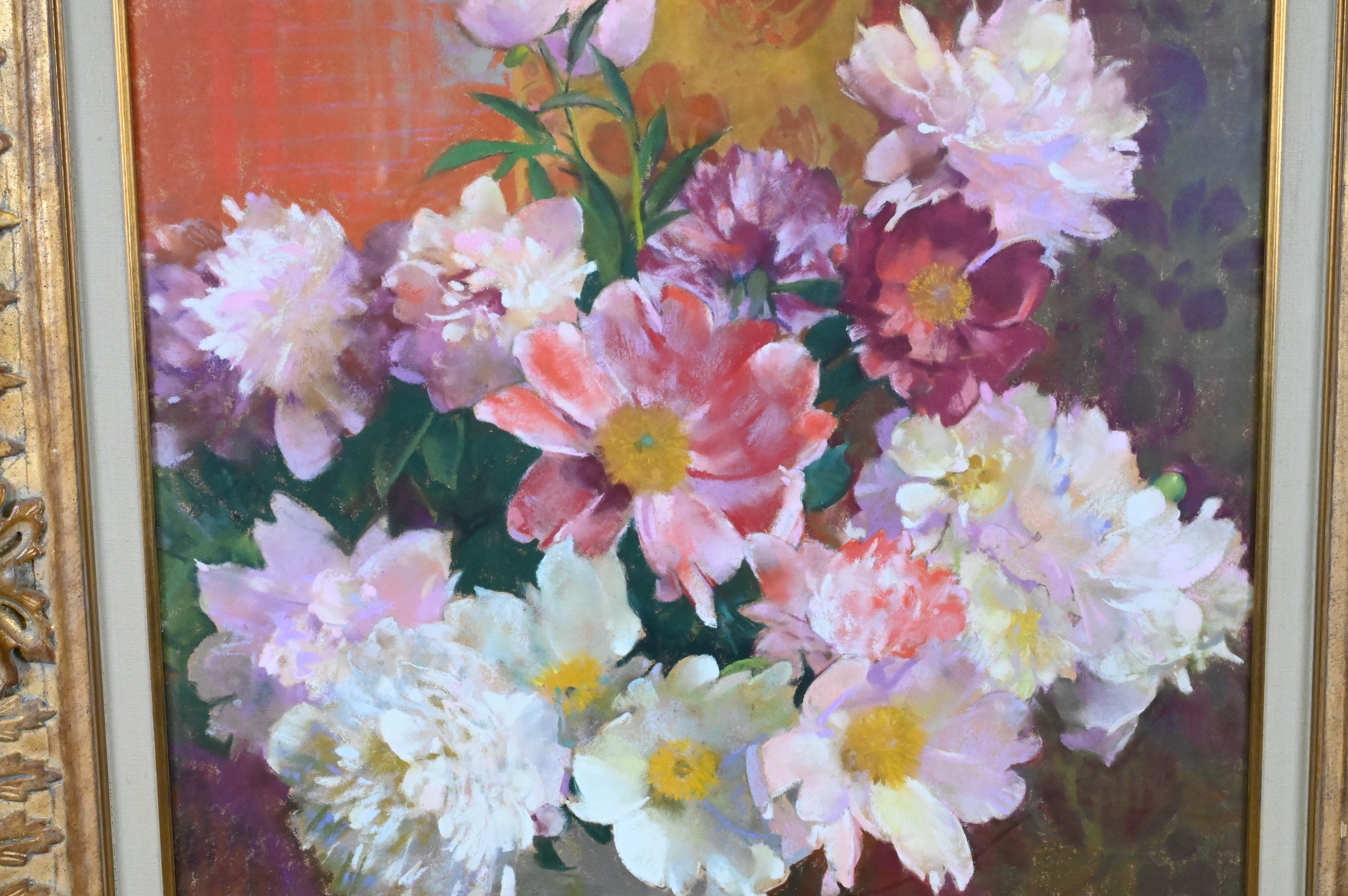 Still Life of Pink Peony Flowers in a Vase with Orange Wallpaper
