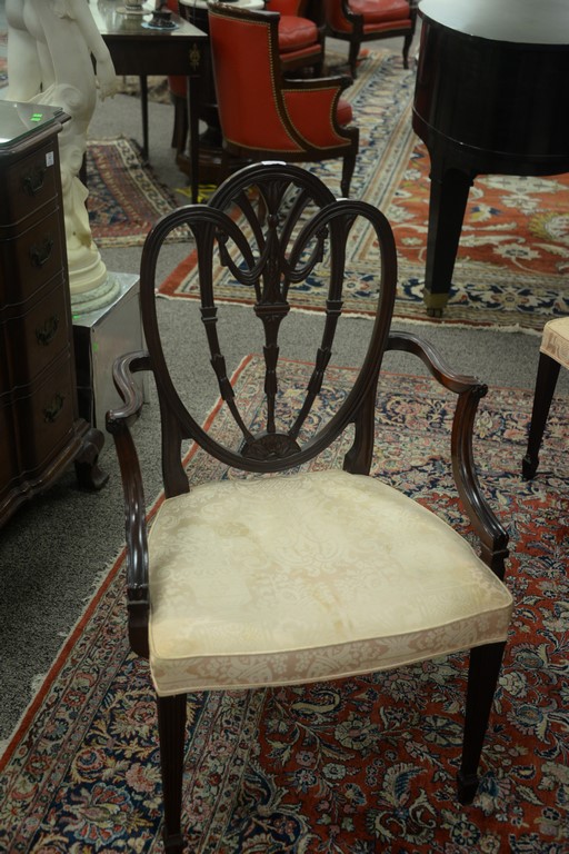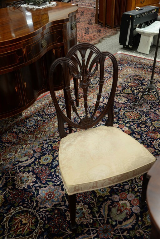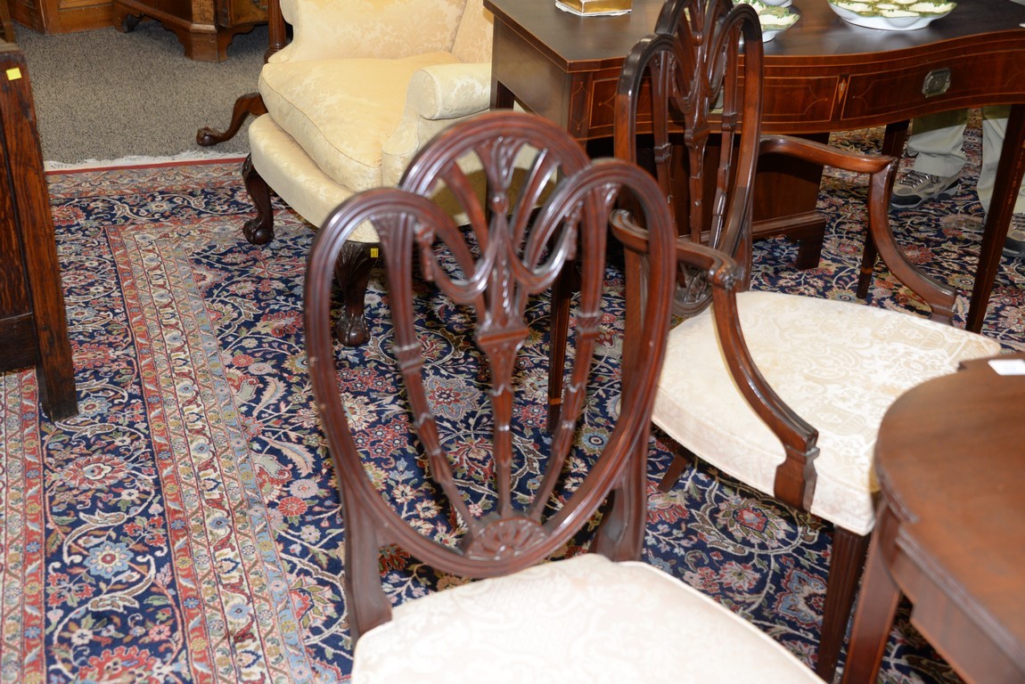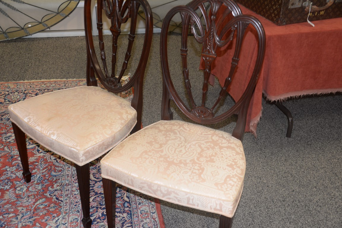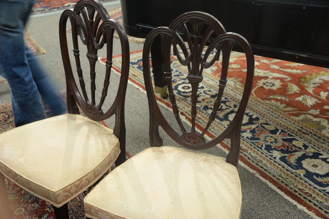 Lot 422: Margolis mahogany set of six dining chairs with pierce carved backs and upholstered seats, all set on square tapered and fluted legs…