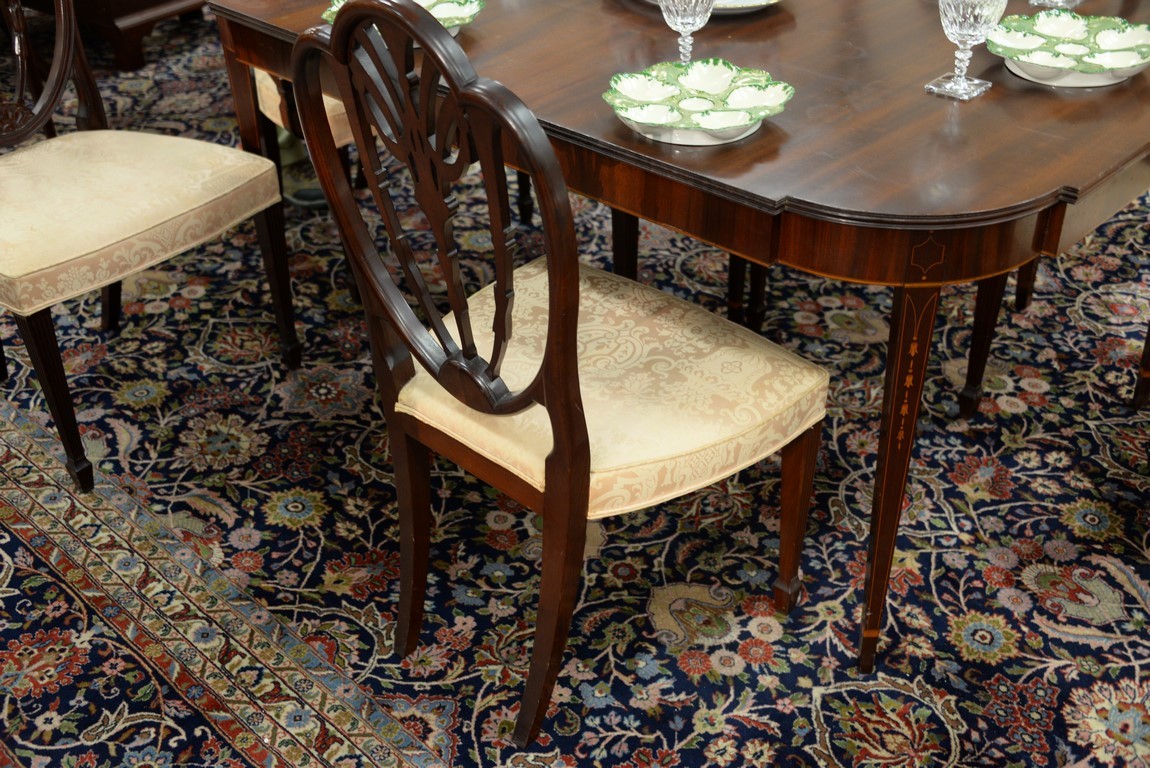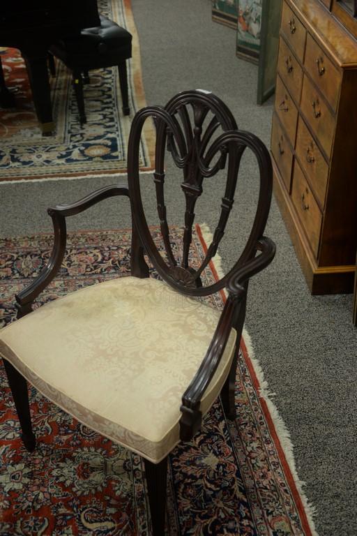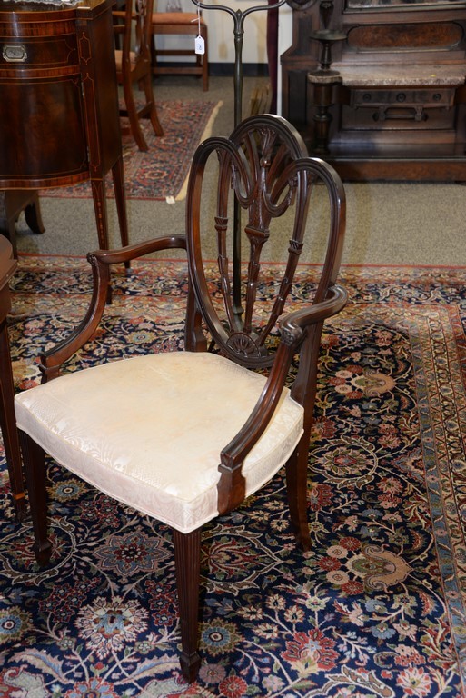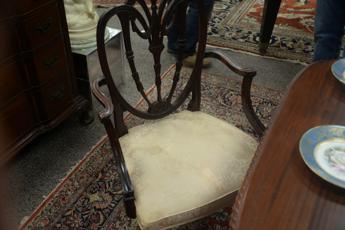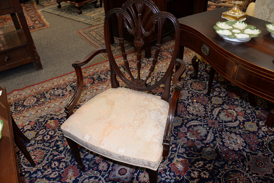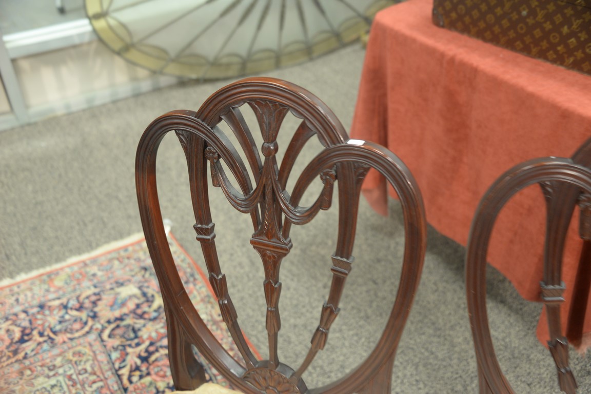 Lot 422: Margolis mahogany set of six dining chairs with pierce carved backs and upholstered seats, all set on square tapered and fluted legs…