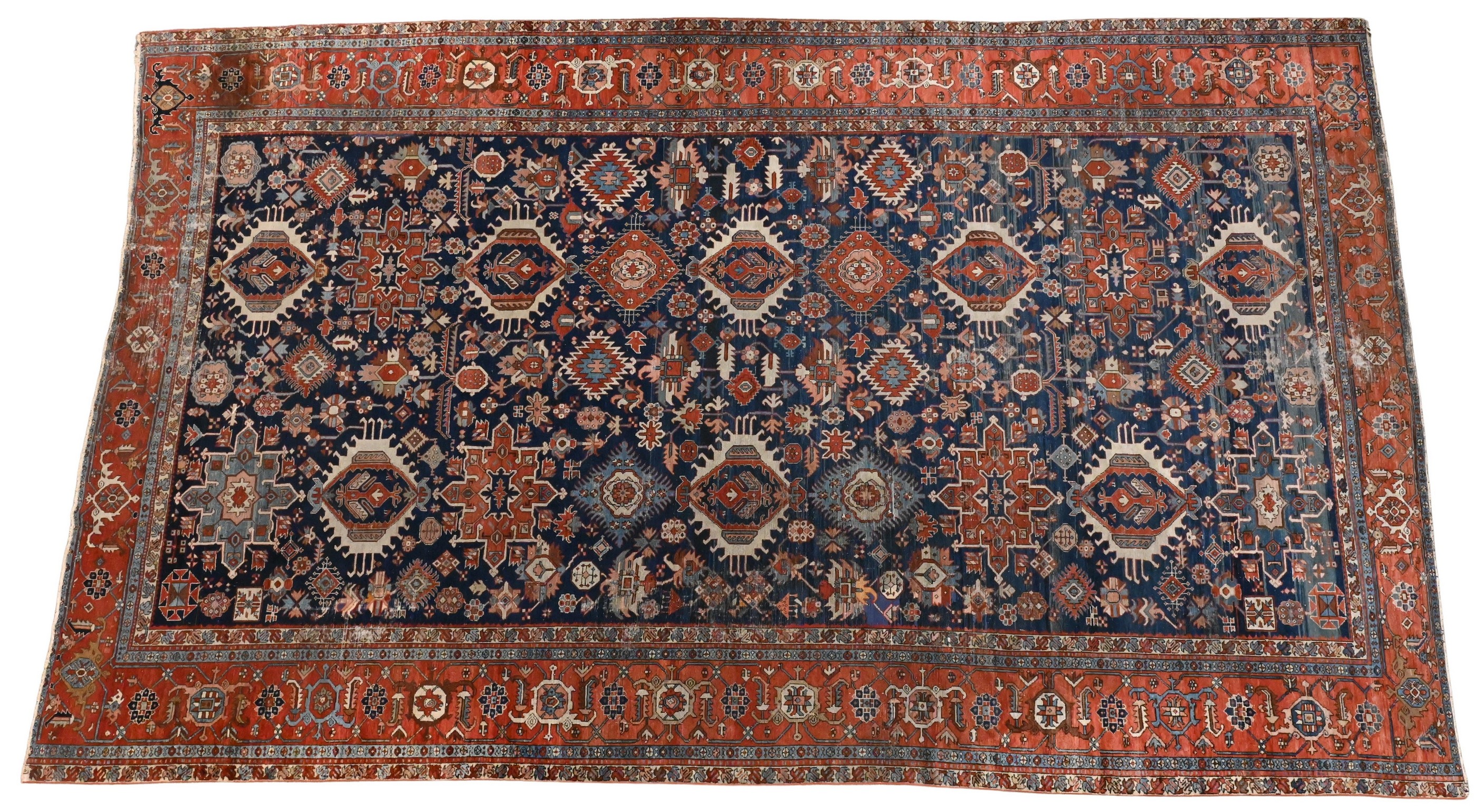 medium blue ground having two rows of eight varying latch hooked medallions incorporating and surrounded by geometric rosettes, within a wide outer border of large water bug medallions on a claret ground