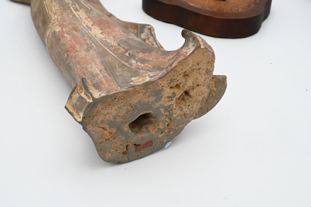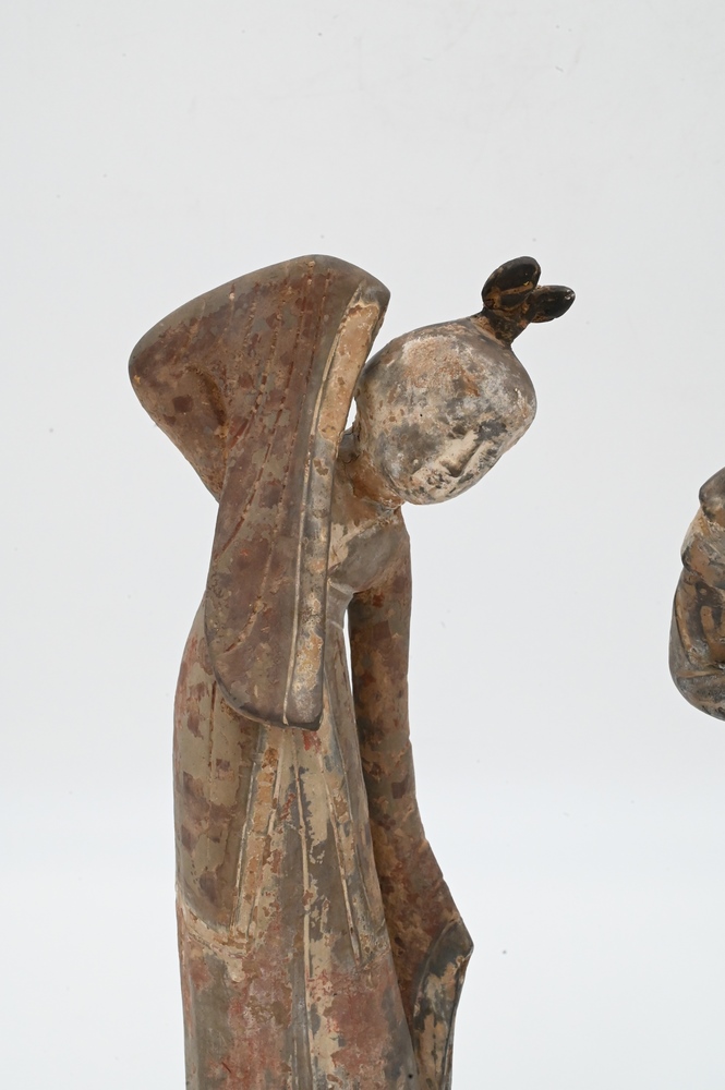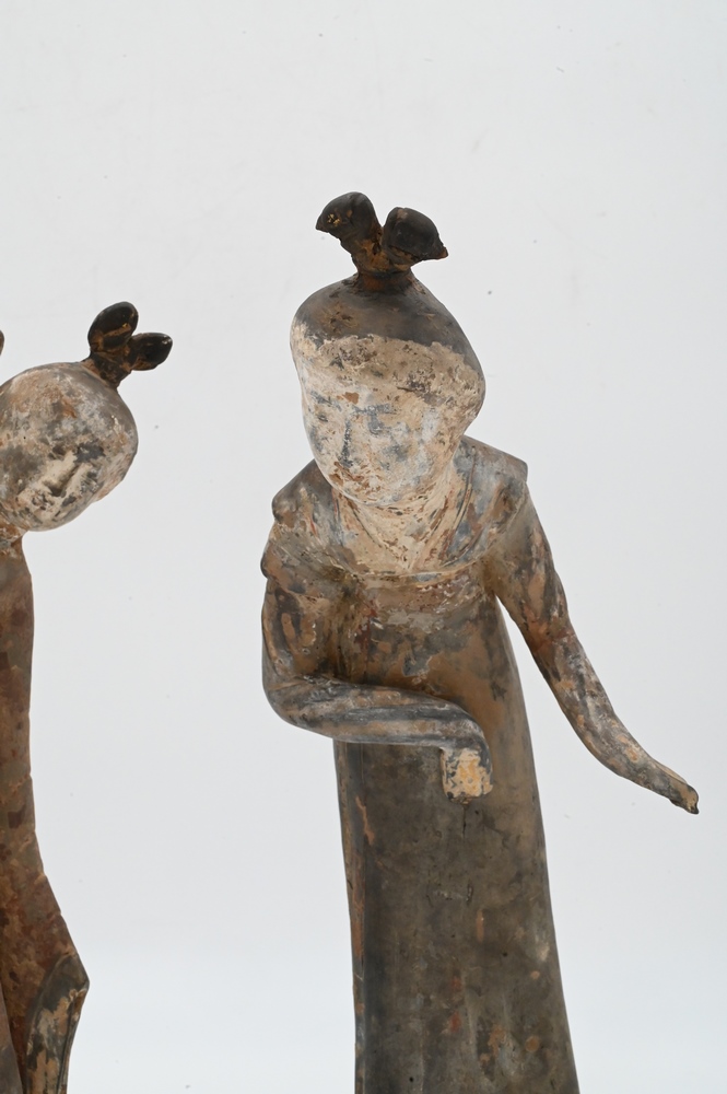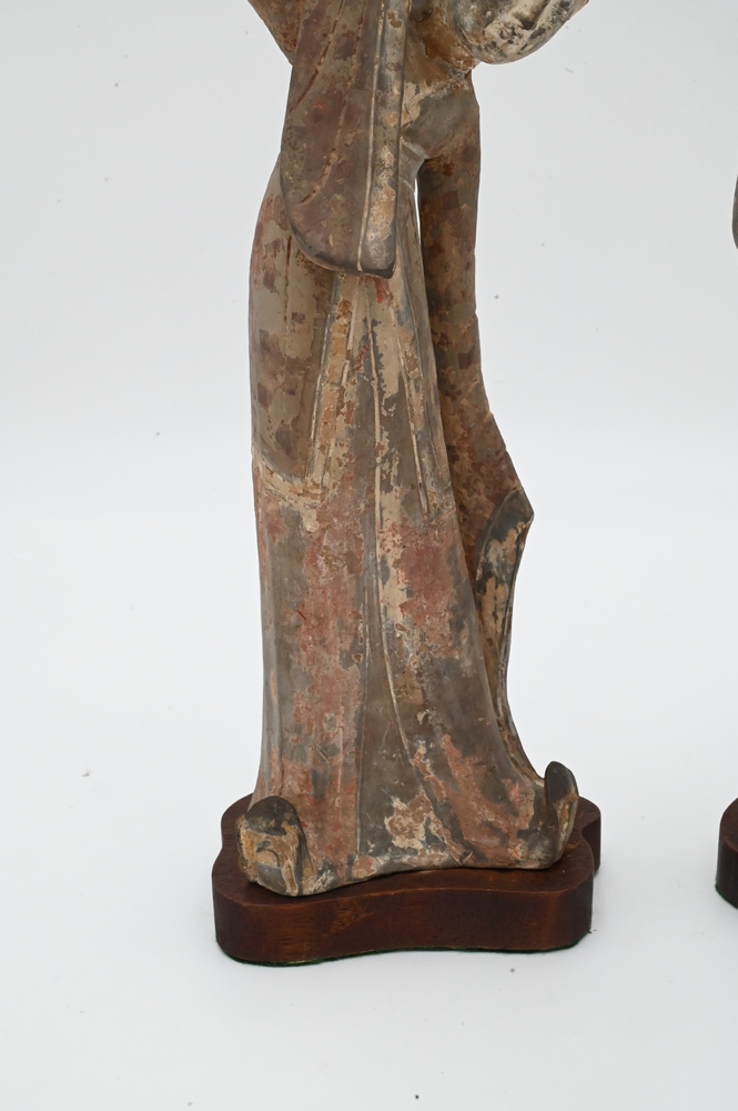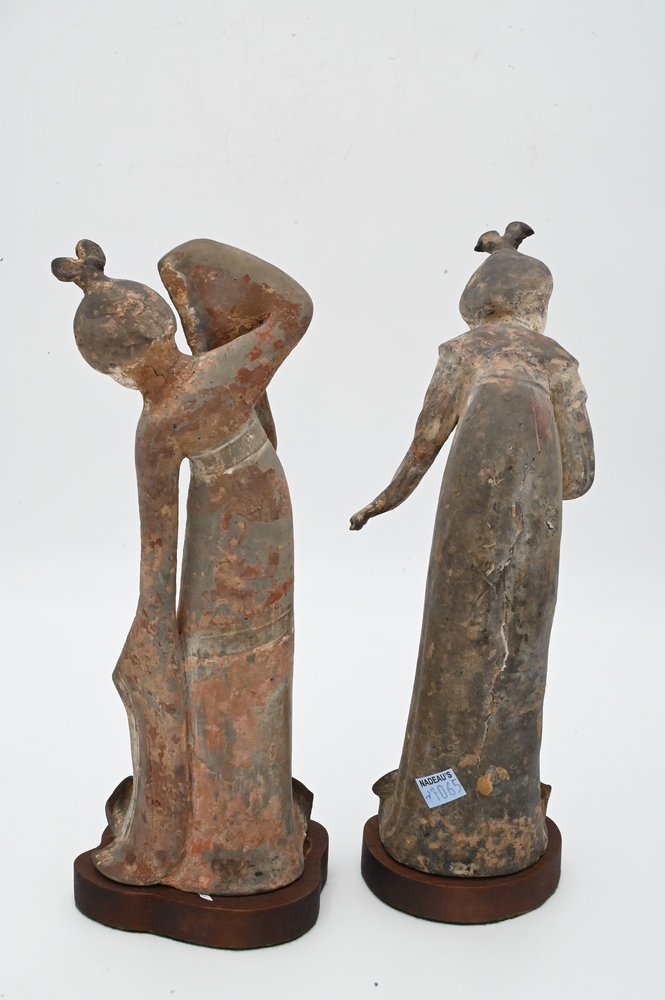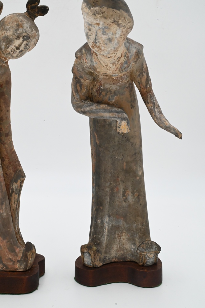 Lot 422: Pair of Clay Tomb Figures of Female Dancers, Tang Dynasty (618 – 907), both on custom wooden stands, height 12 3/4 inches. Provenance: Estate of Mary C. Rockefeller, Fifth Avenue, New York City.