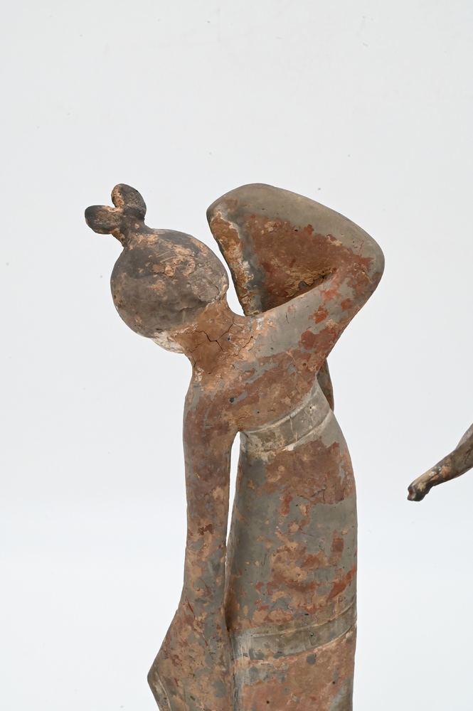 Pair of Clay Tomb Figures of Female Dancers, Tang Dynasty (618 – 907), both on custom wooden stands, height 12 3/4 inches. Provenance: Estate of Mary C. Rockefeller, Fifth Avenue, New York City.