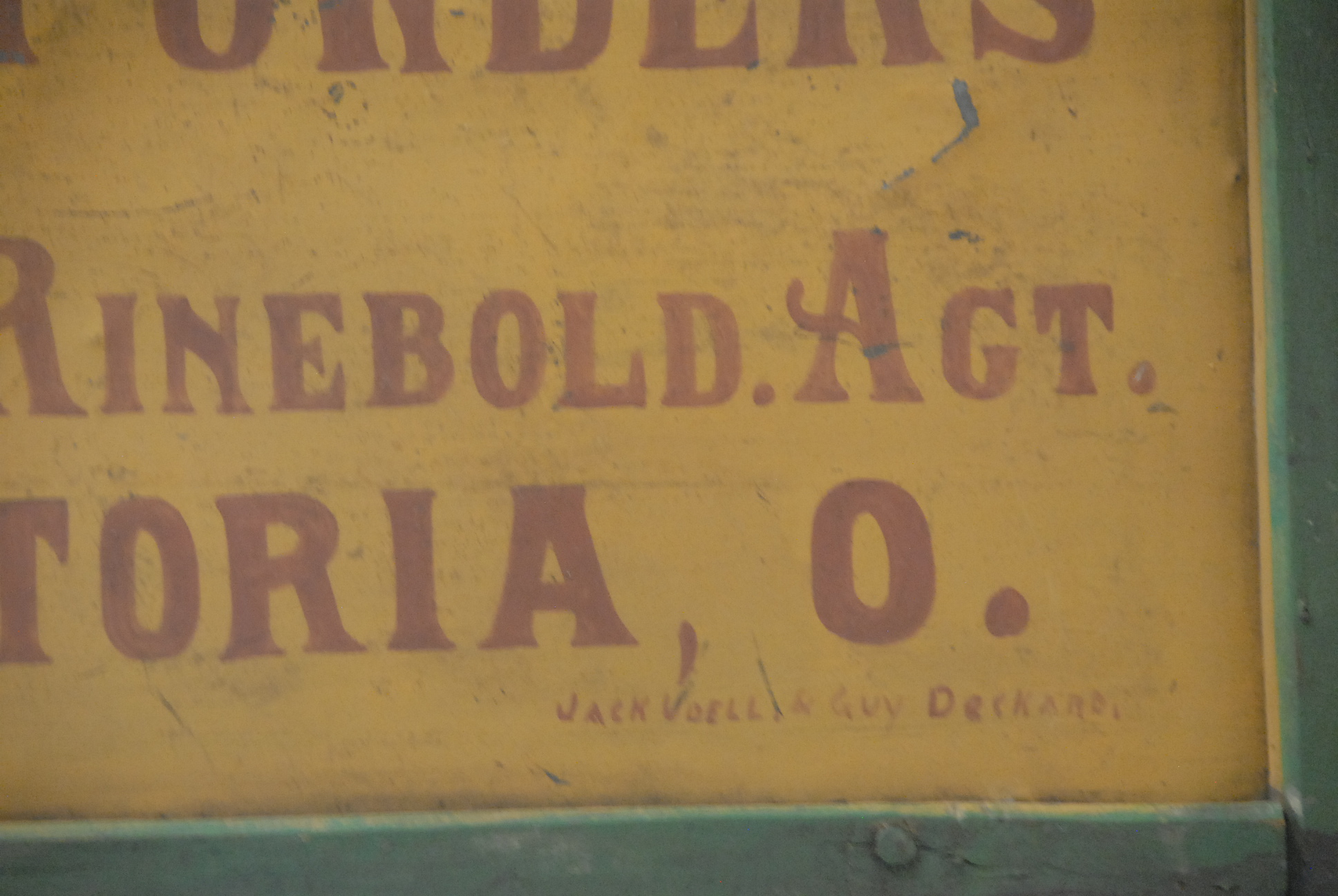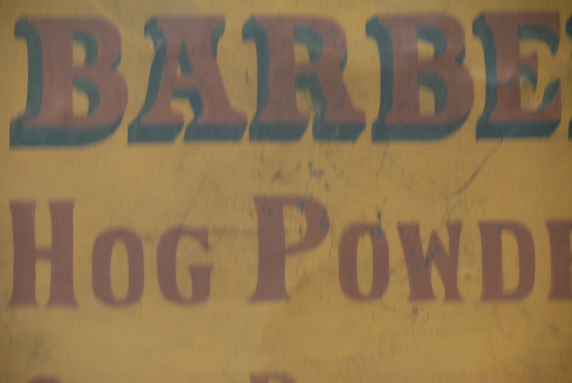 Primitive sign, Barbers Hog Powders Owen Rinebold. Agt. Fostoria O. on metal signed Jack Voell & Guy Deckardt.