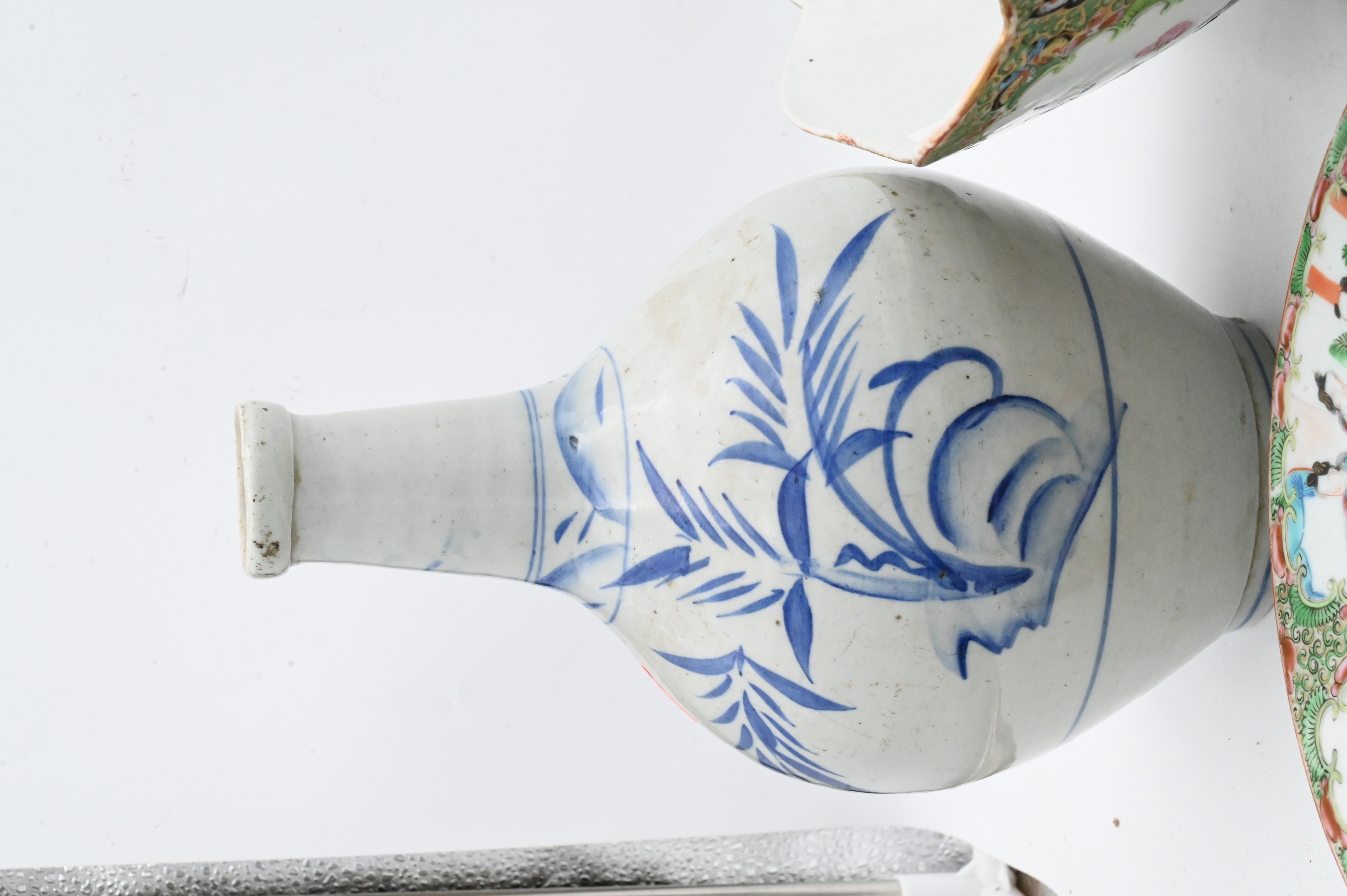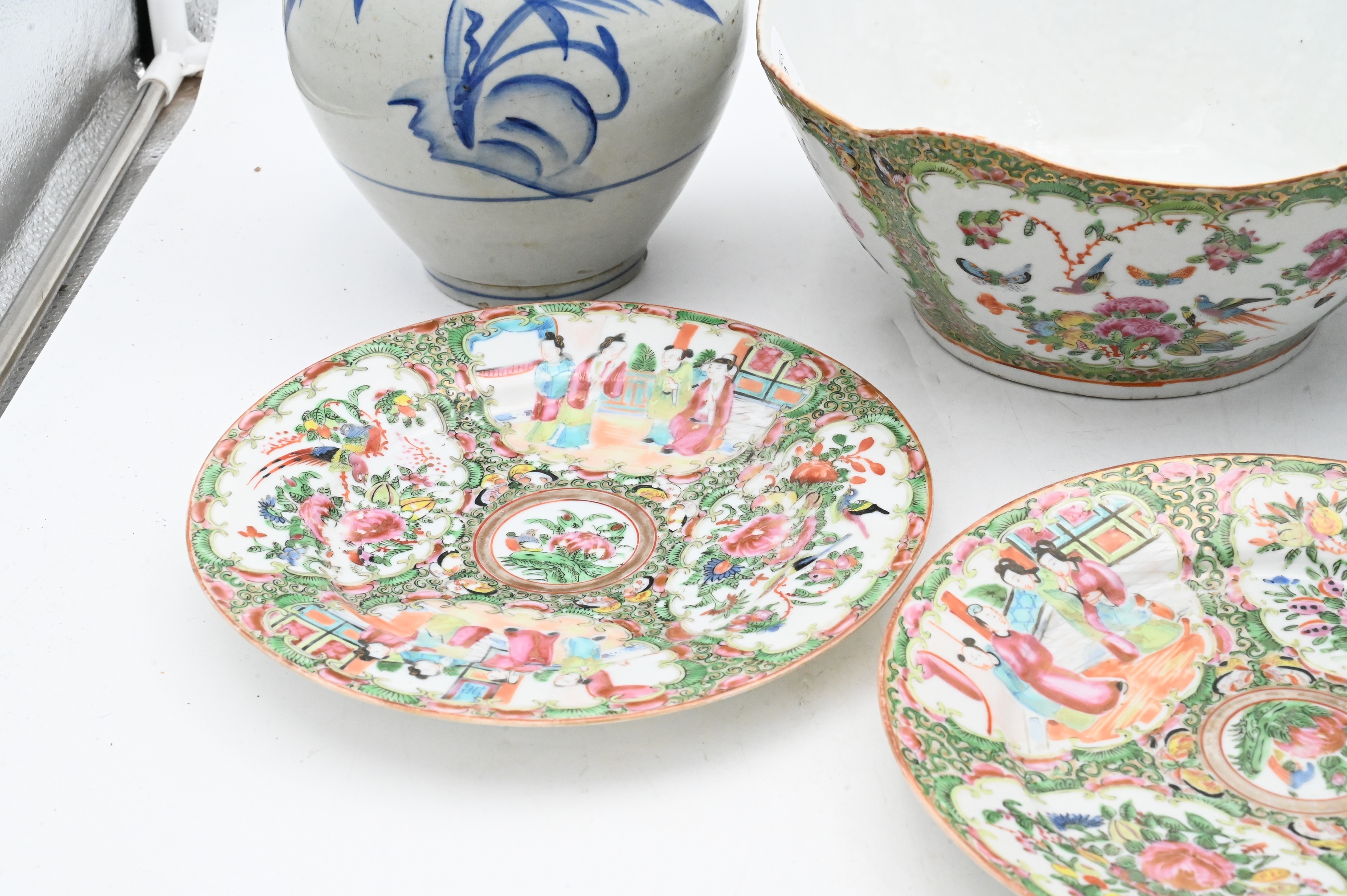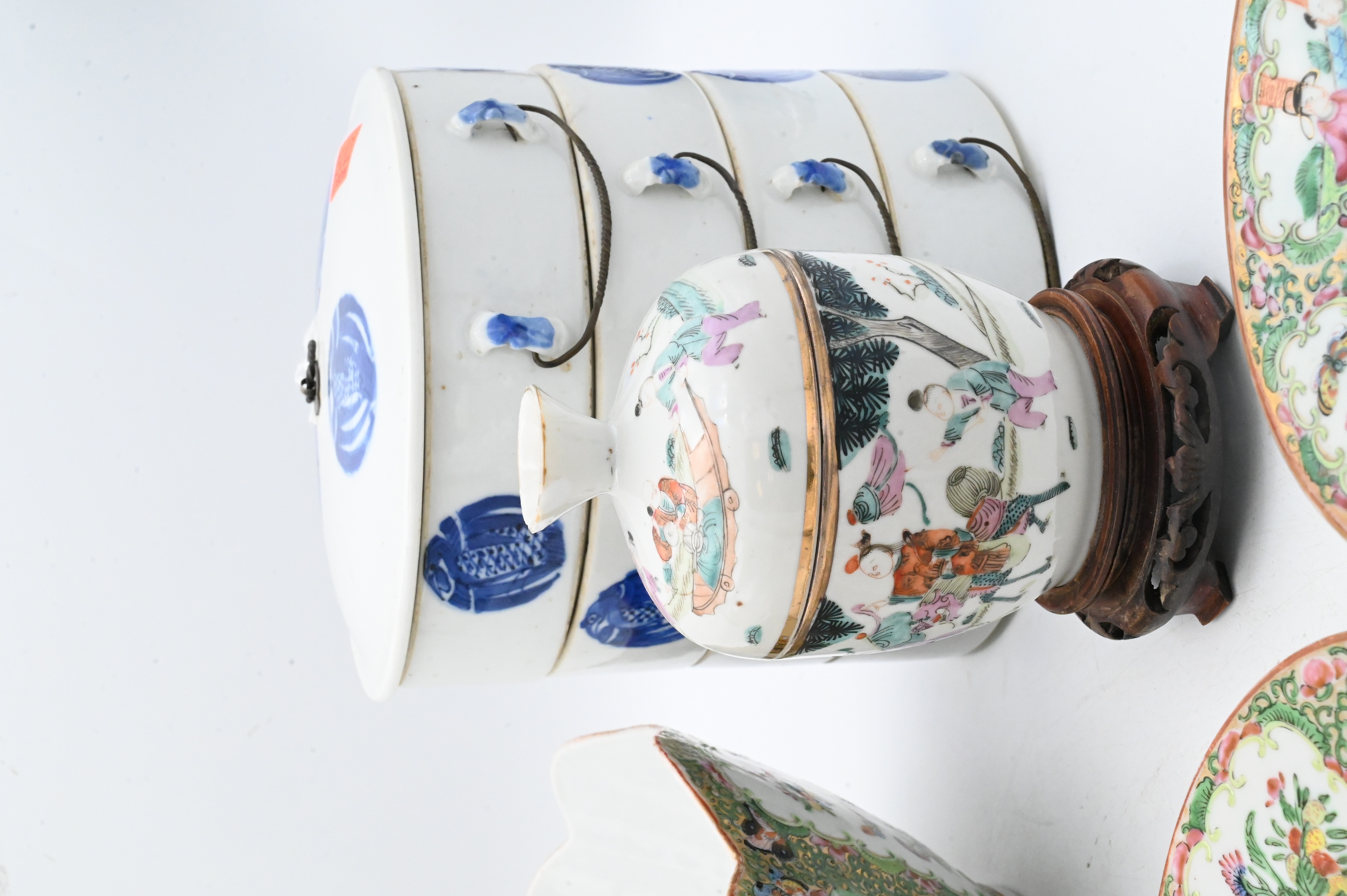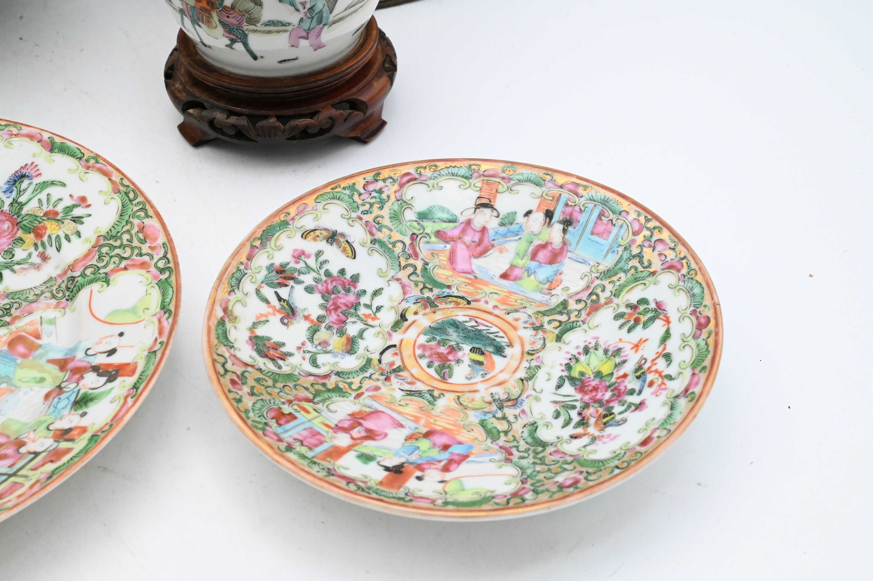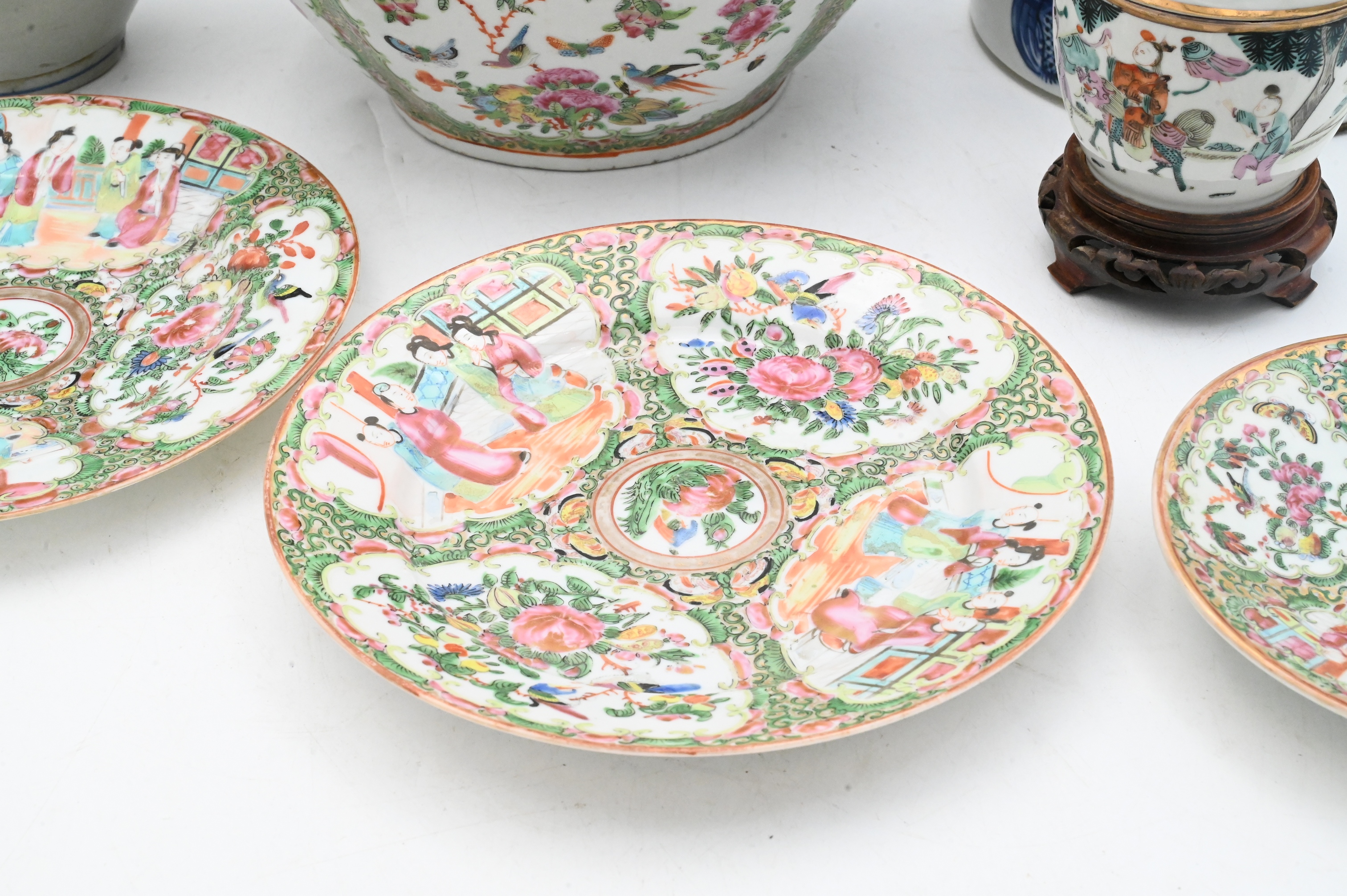 Including a lobed rose medallion bowl decorated with figural panels and central peony, a blue and white bottle vase with bamboo decoration; a set of stacking blue and white covered bowls with crest decoration, a small famille rose covered jar; and a group of rose medallion saucers and small plates