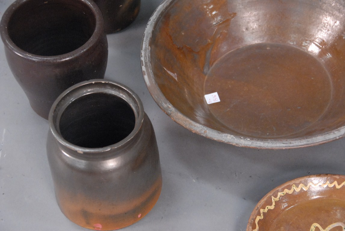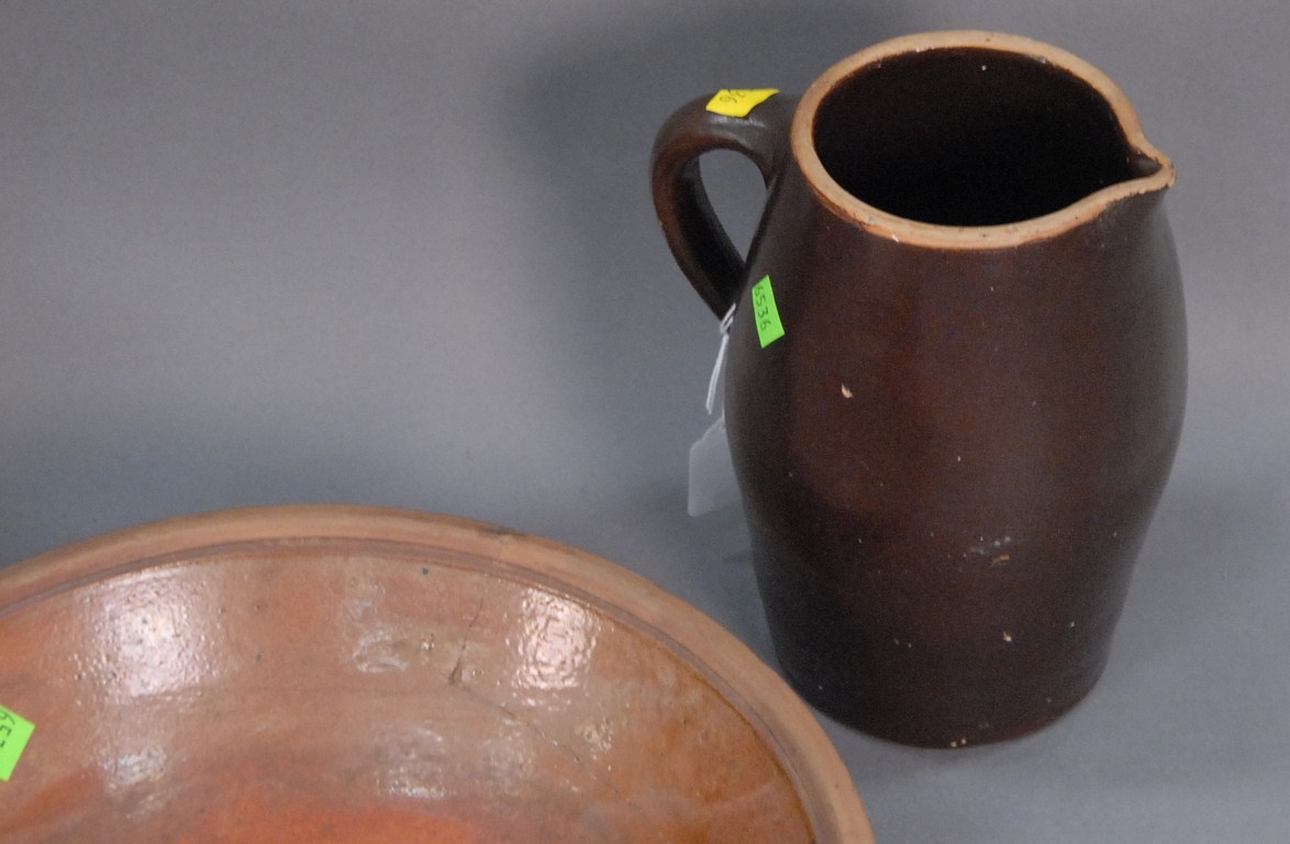 Lot 422: Ten piece lot of brownware, redware, crocks, bowls, and pitchers. Being sold to benefit a Connecticut Museum