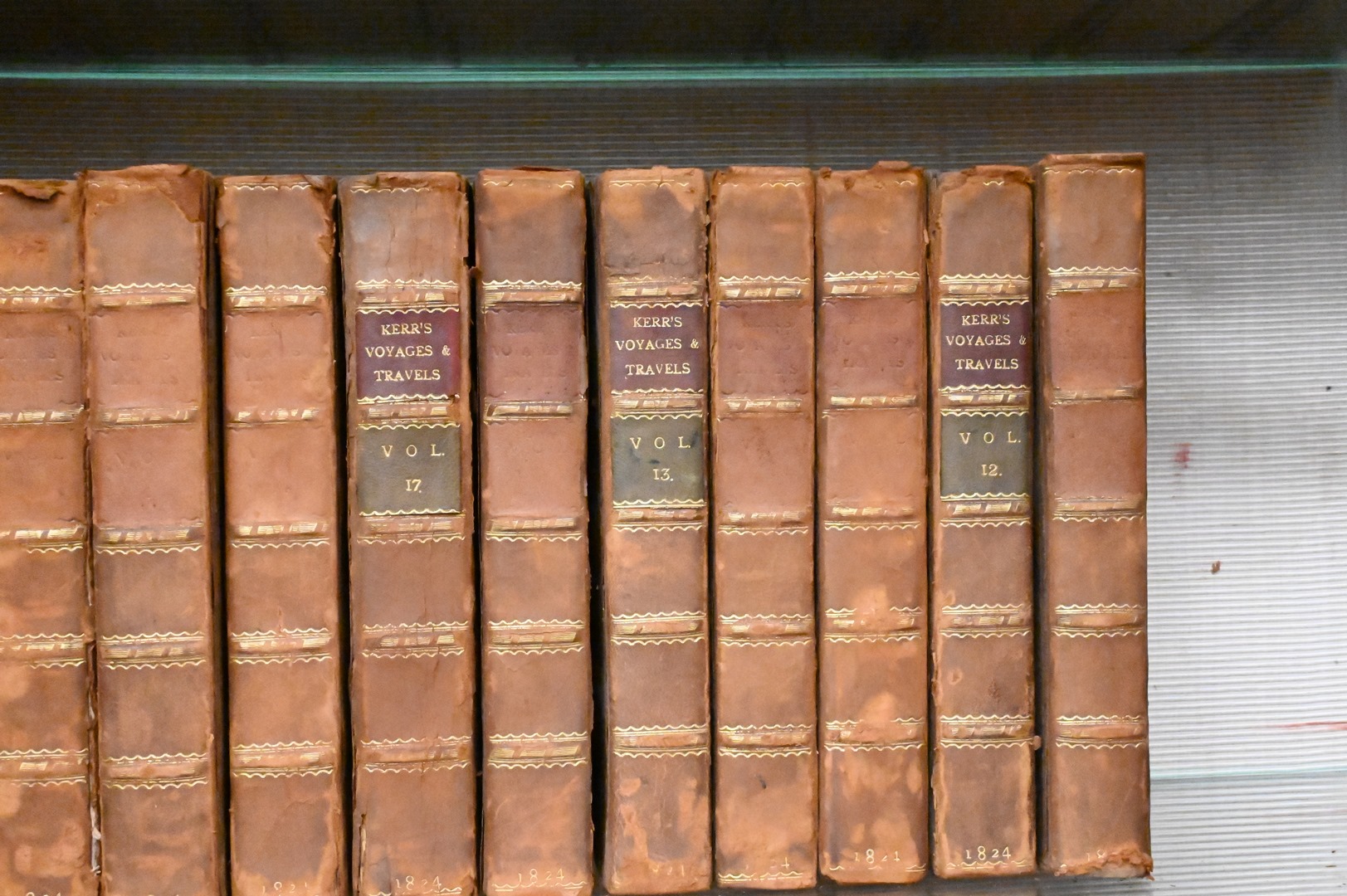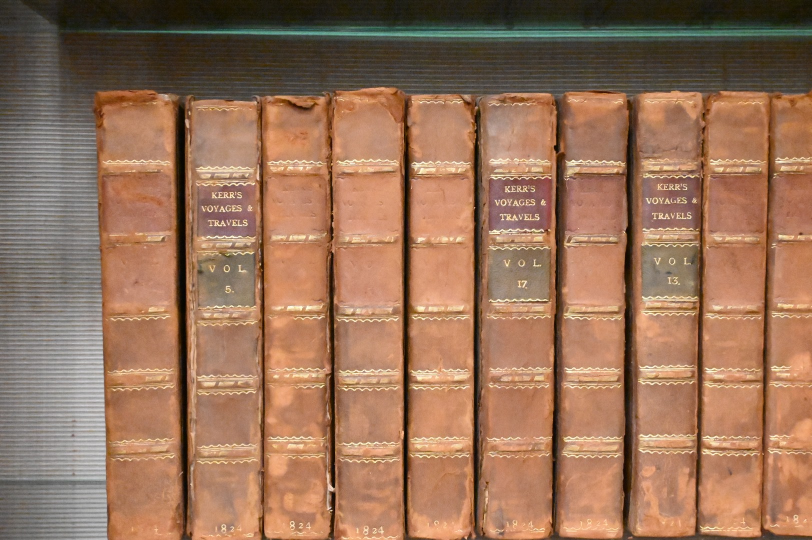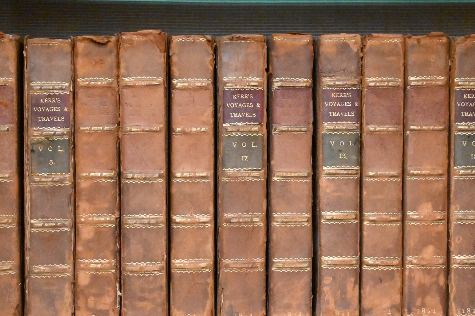 Two Sets of Leather Bound Books, to include 12 volumes of Robert Kerr’s “A General History and Collection of Voyages and Travels”, published in 1824; along with 11 volumes of “Pantologia: A New Cyclopaedia”, published in 1813, Provenance: Estate of Cyril H. Moore Jr, Kent, Connecticut.