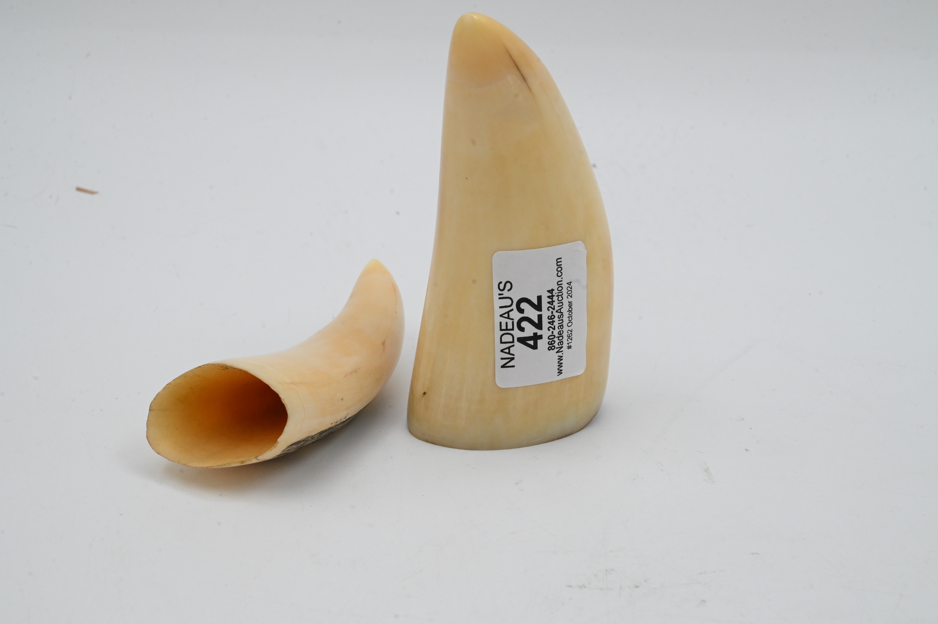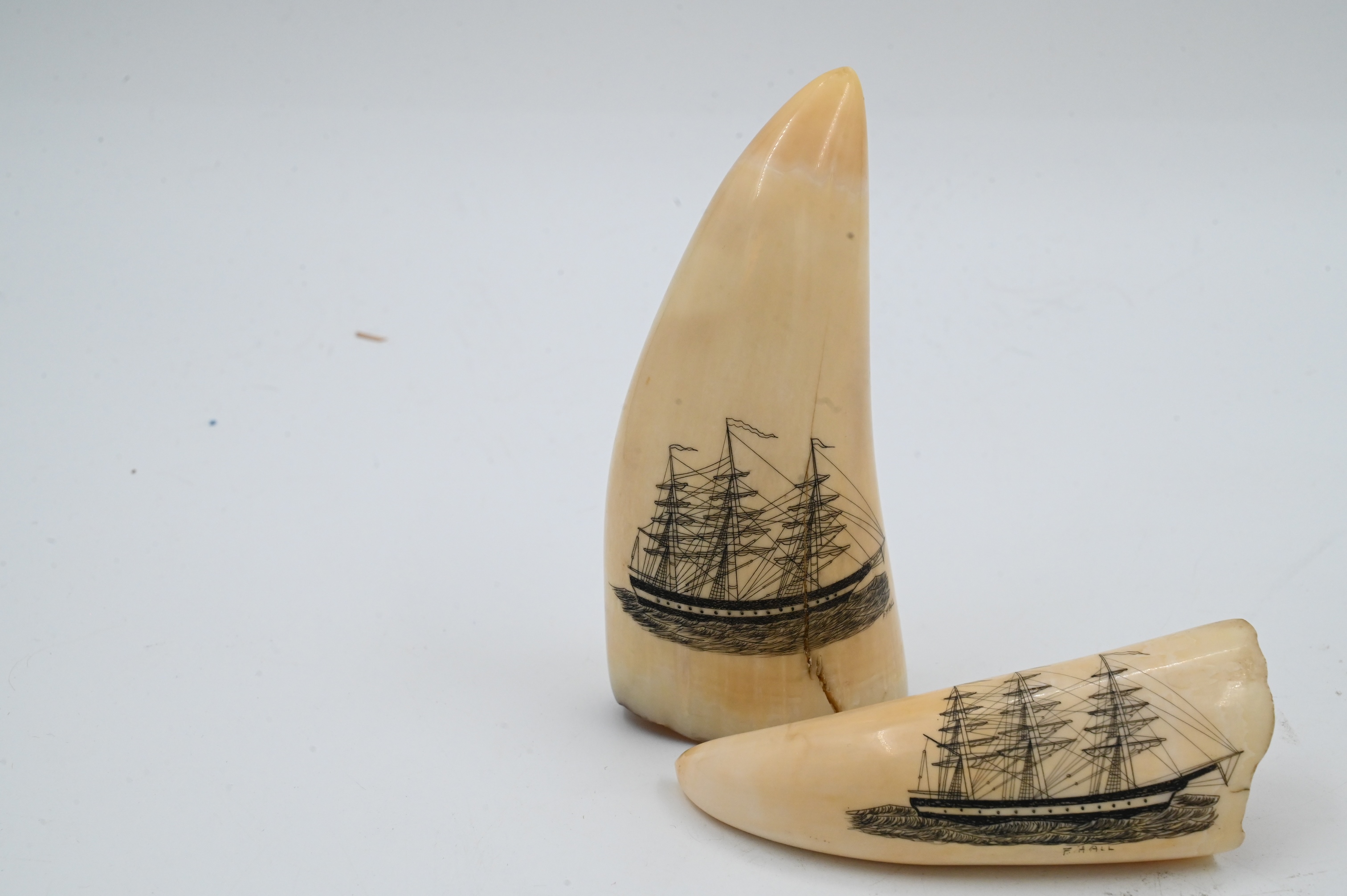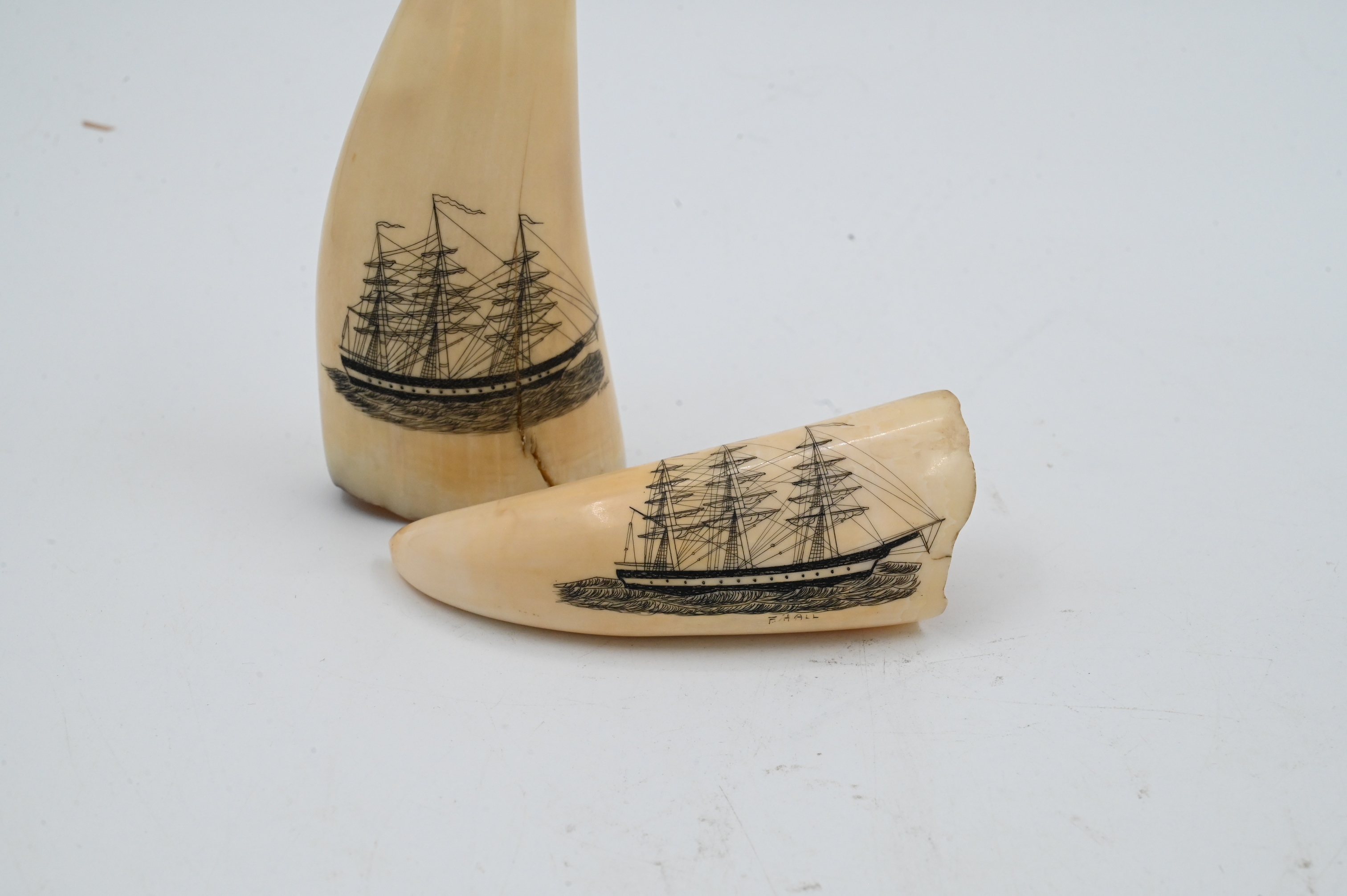 Lot 422: Two Whale Teeth having Newer Scrimshawed Ships