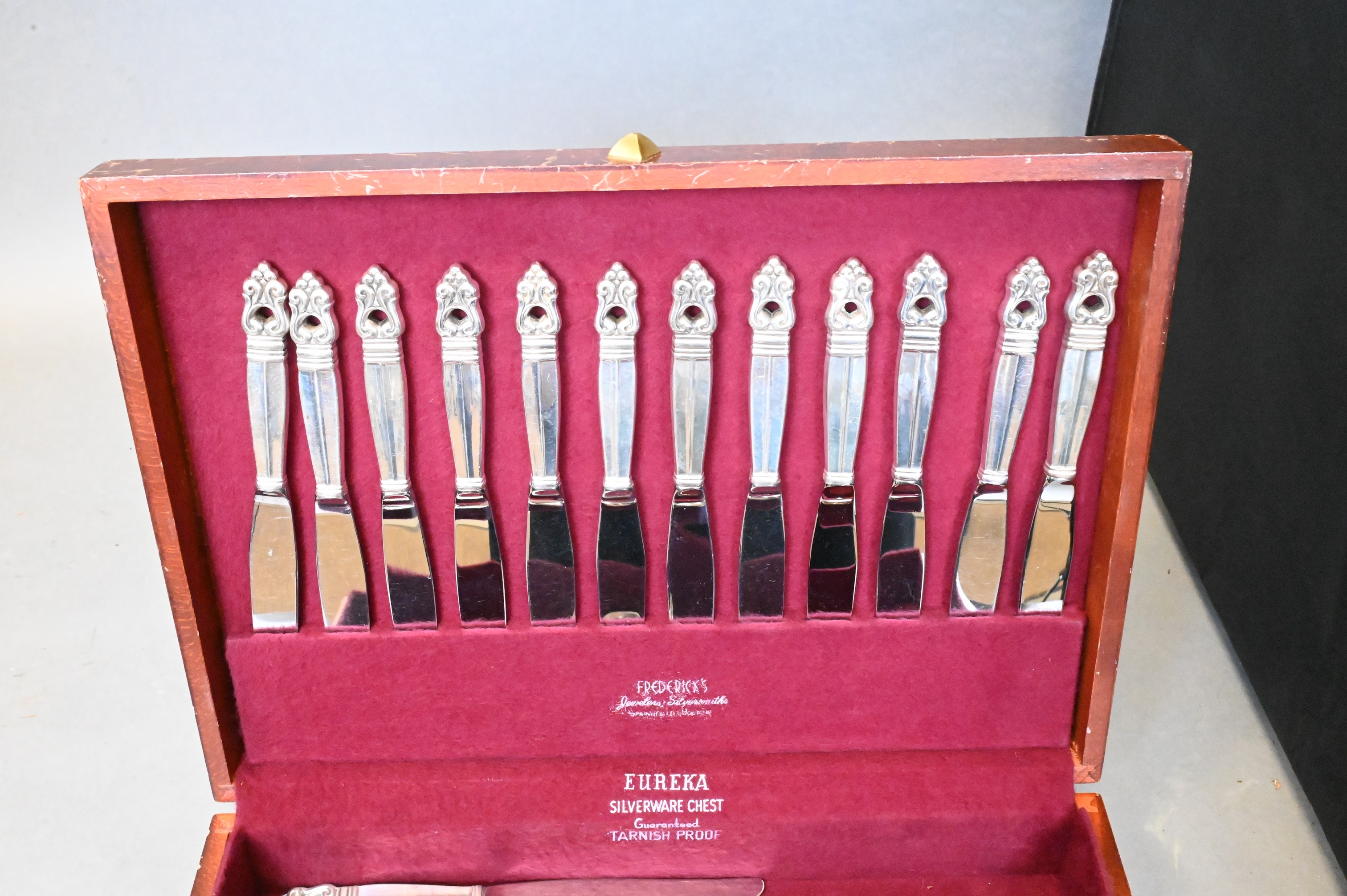 to include 7 soup spoons, 8 iced tea spoons, 1 jelly spoon, 1 sugar spoon, 8 cocktail forks, 1 sugar tong, 16 dinner knives, 4 sterling blade butter knives, 1 asparagus fork, pair of wood salad tongs