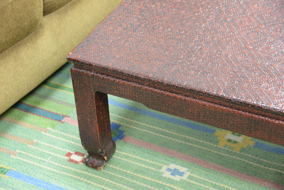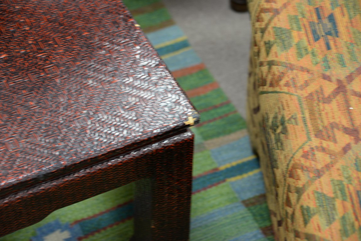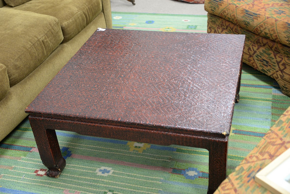 Chinese style coffee table, woven finish minor imperfections. ht. 17 in. 36 x 36