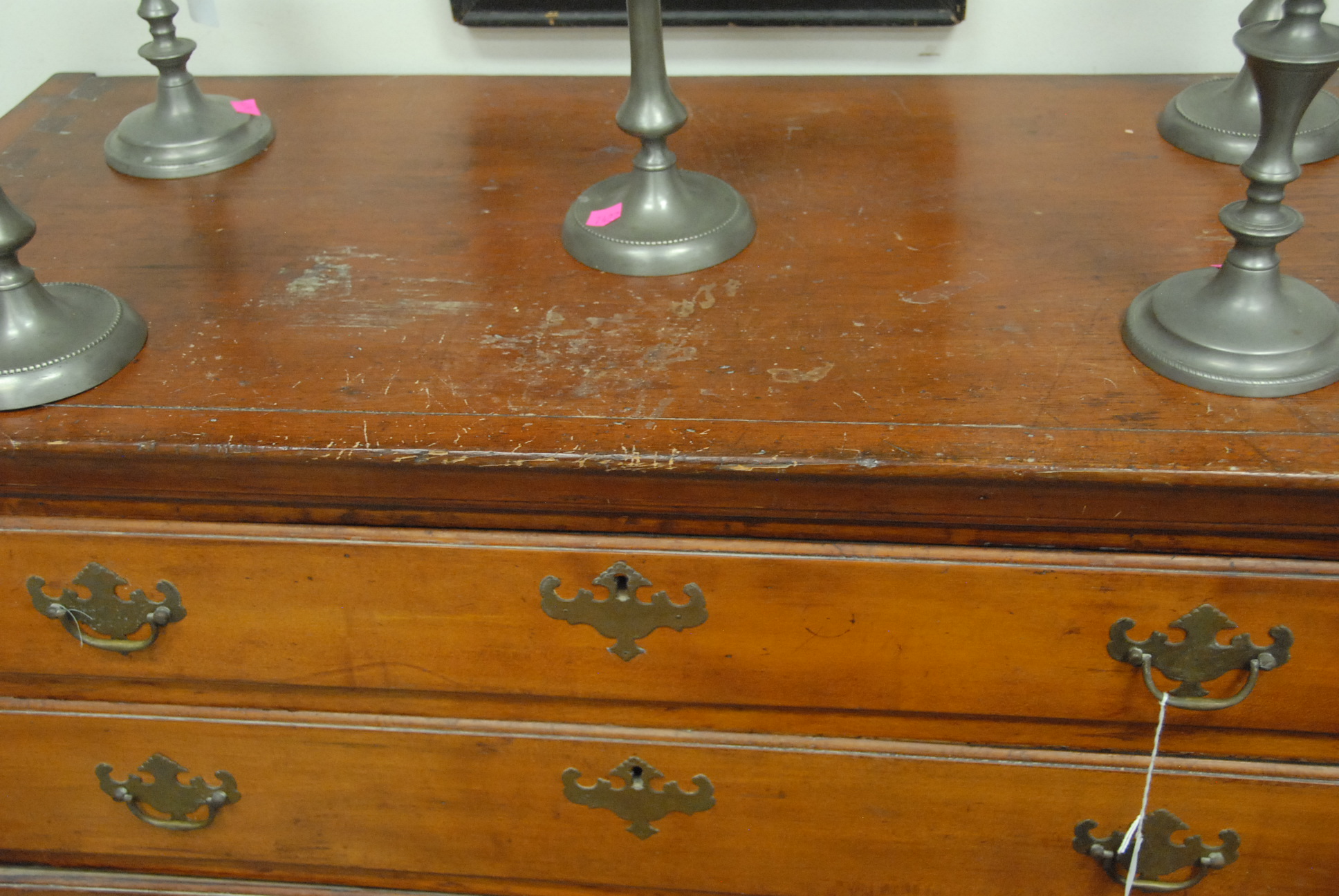 Lot 423: Chippendale cherry five drawer chest on cut out bracket base. ht. 42 1/2 in. wd. 36 1/2 in. Provenance: Property from The Estate of Margaret Oliphant of Old Lyme, Connecticut