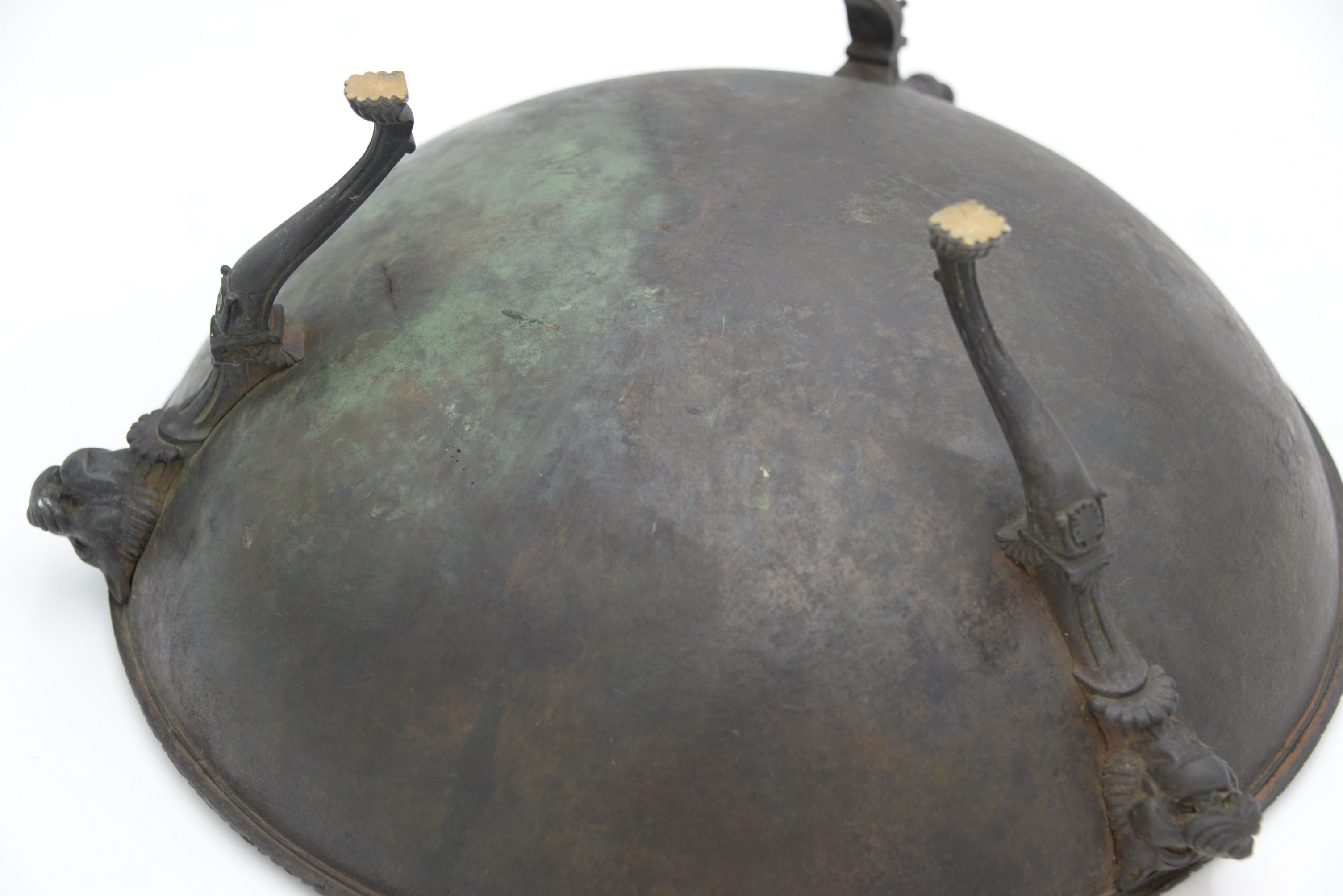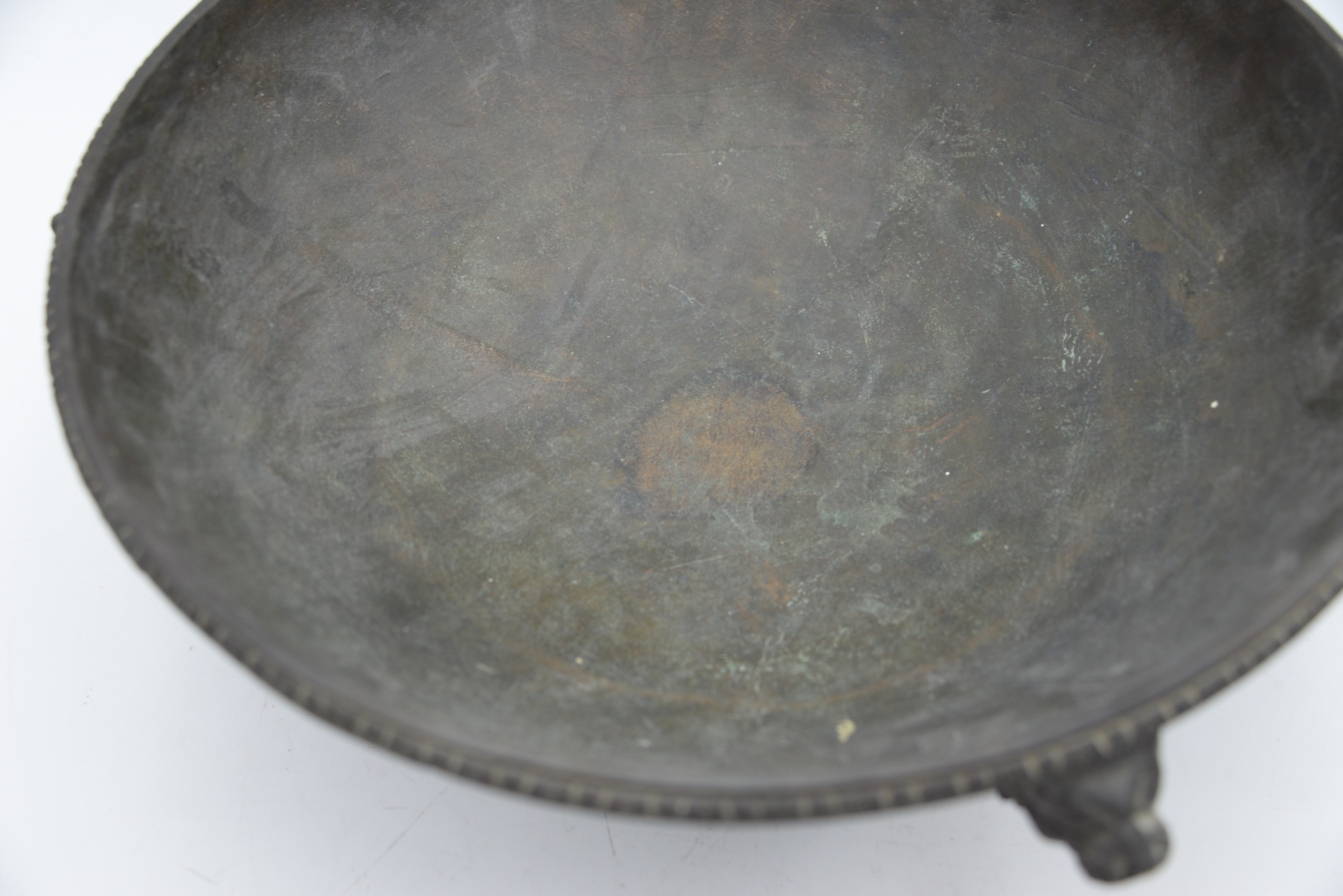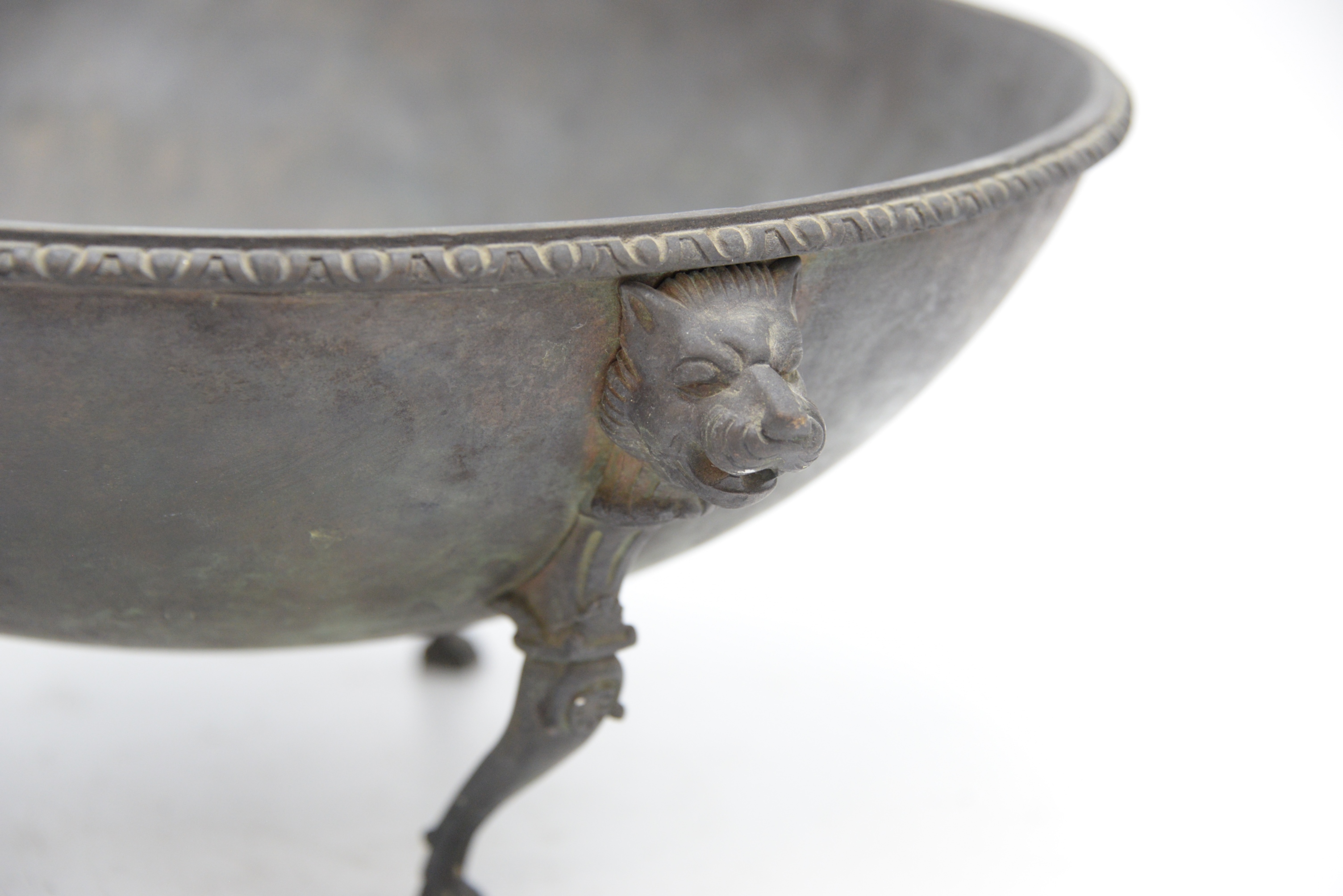 Early Bronze Ceremonial Feast Bowl, sitting on three legs, each topped with lion and masks, possibly 18th century or earlier, height 6 3/4 inches, diameter 15 1/4 inches.