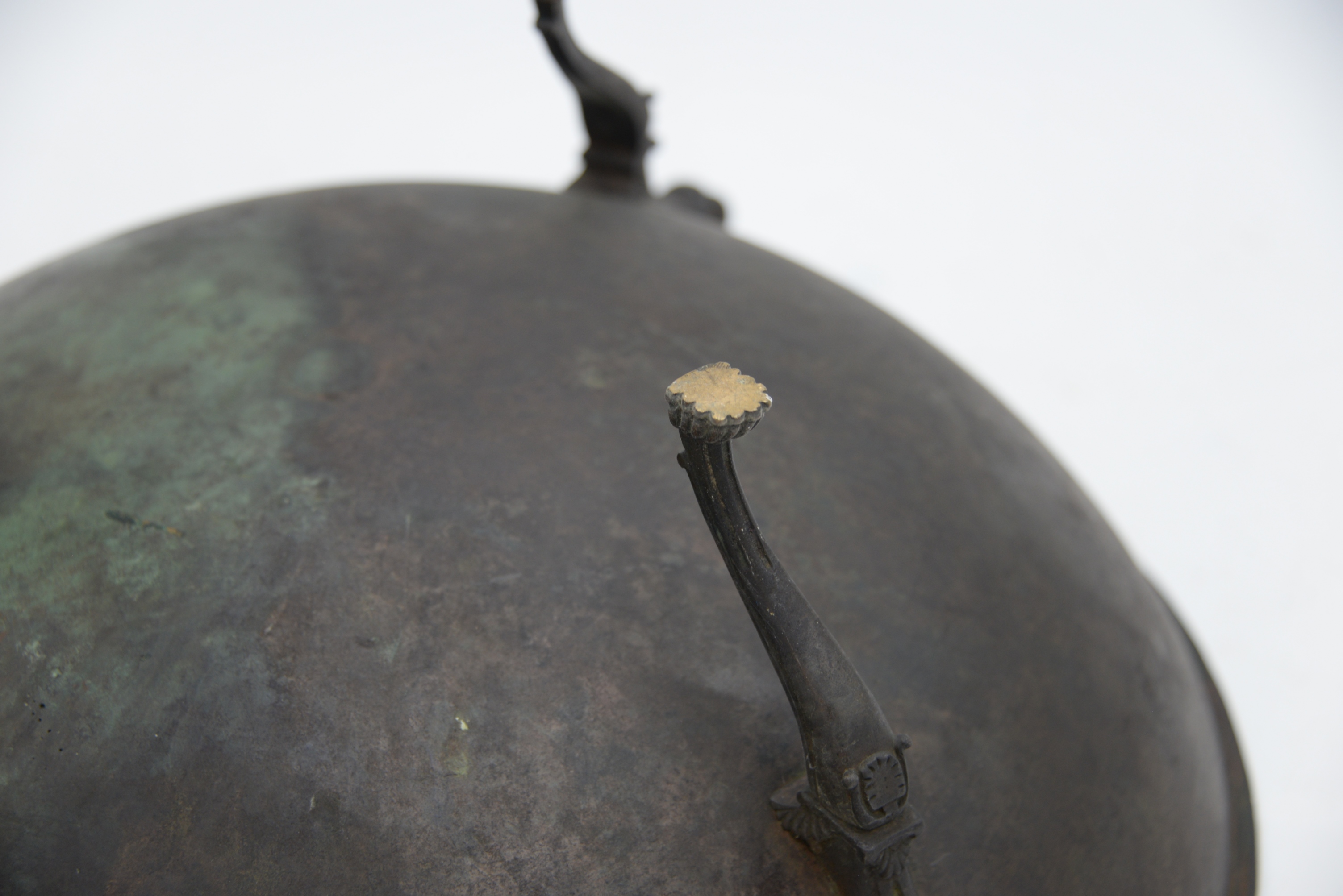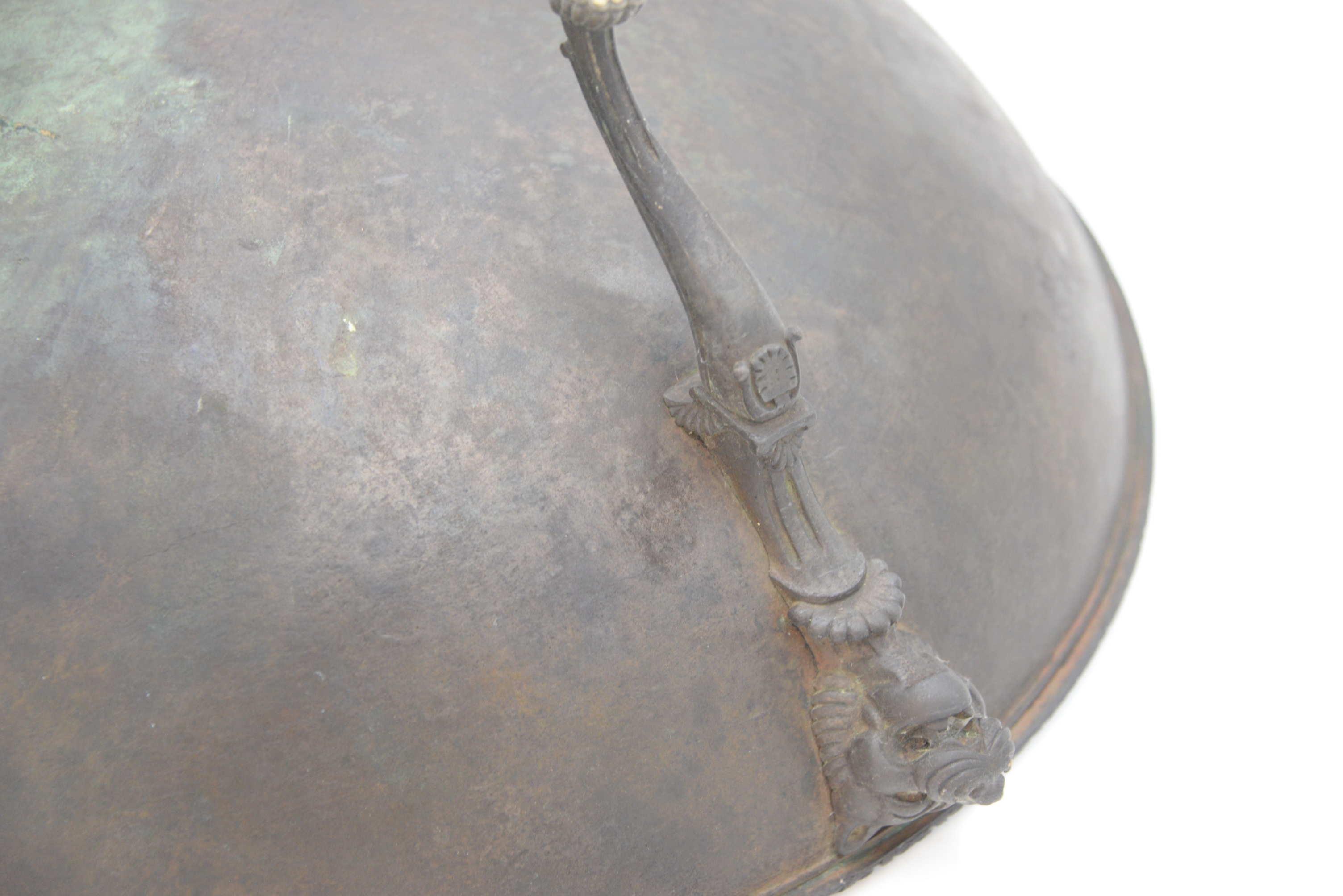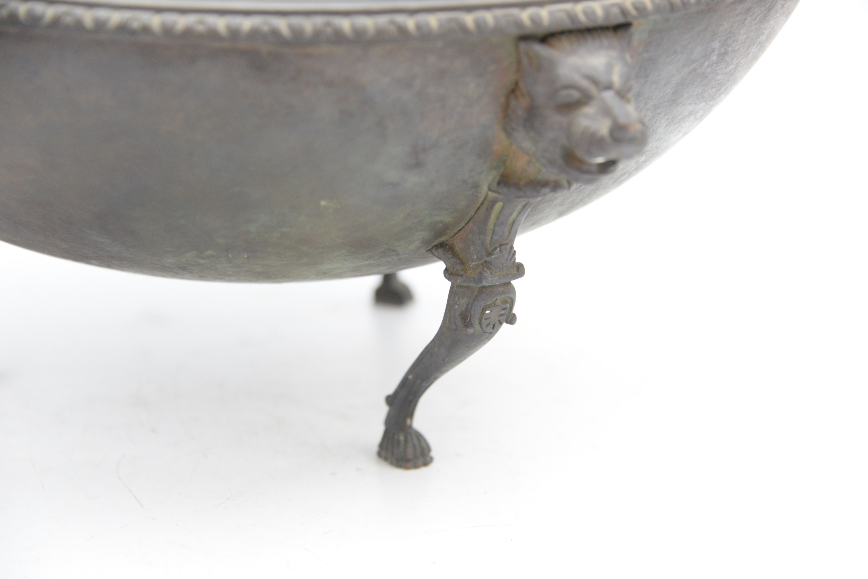 Early Bronze Ceremonial Feast Bowl, sitting on three legs, each topped with lion and masks, possibly 18th century or earlier, height 6 3/4 inches, diameter 15 1/4 inches.
