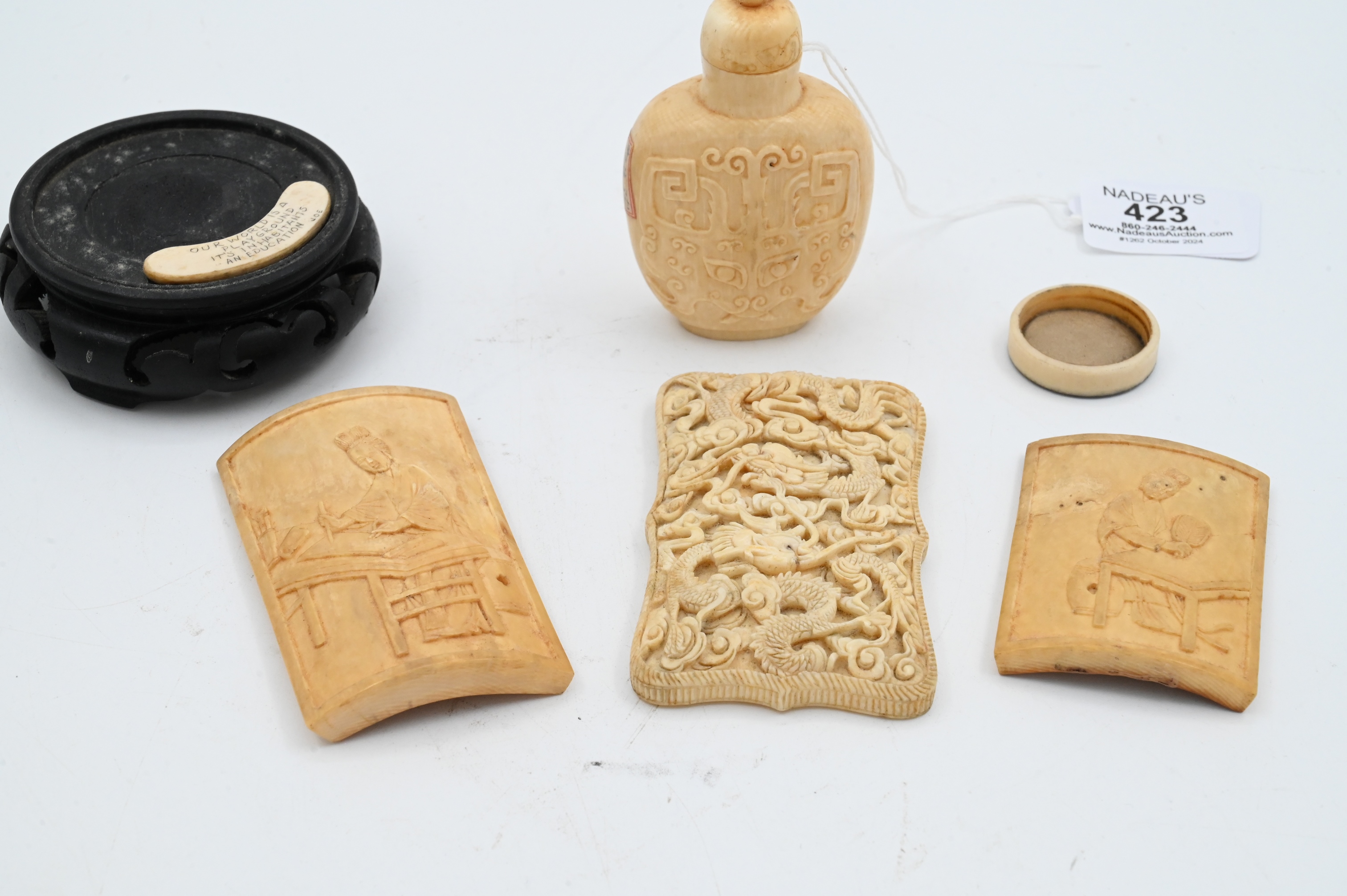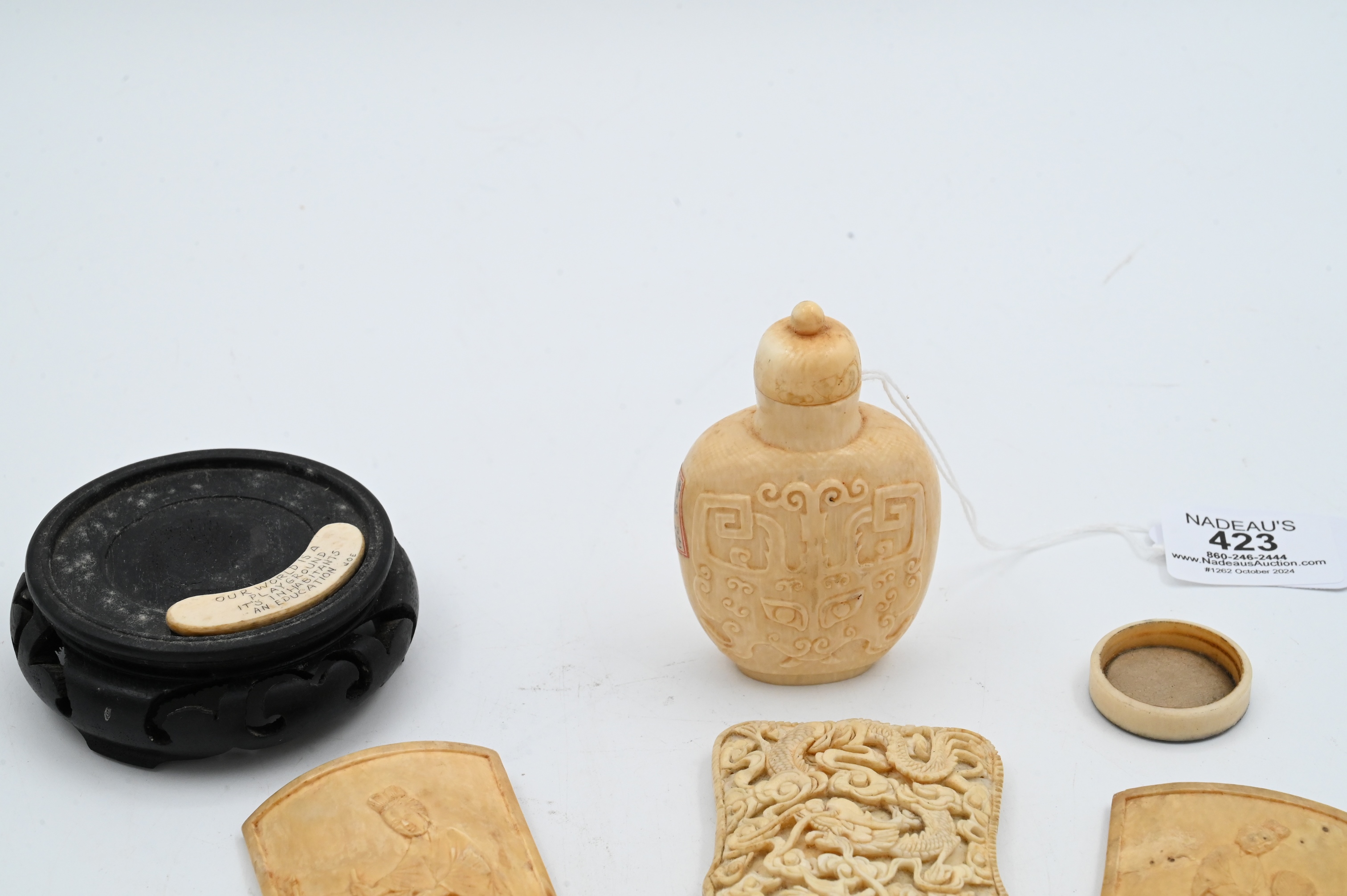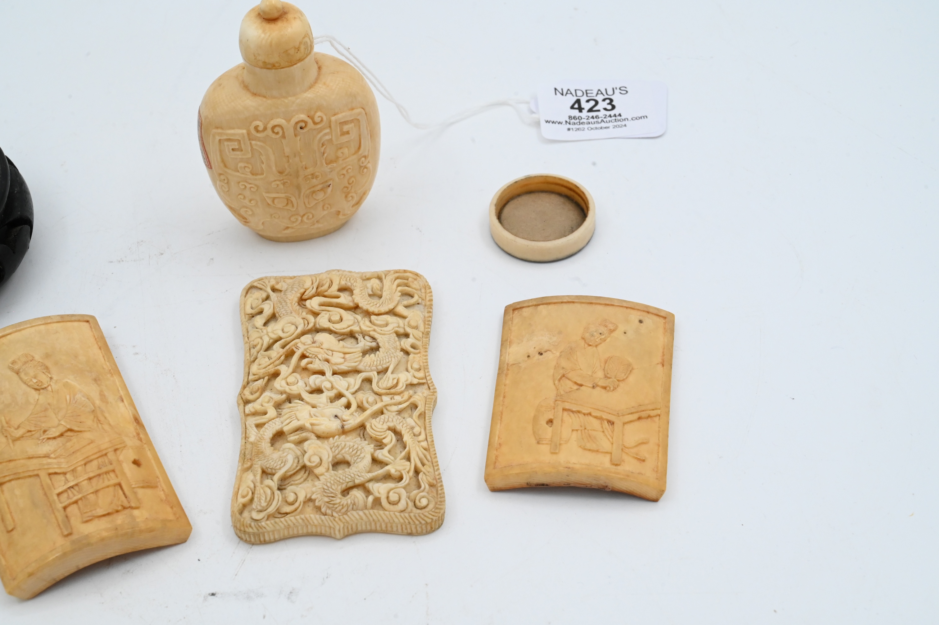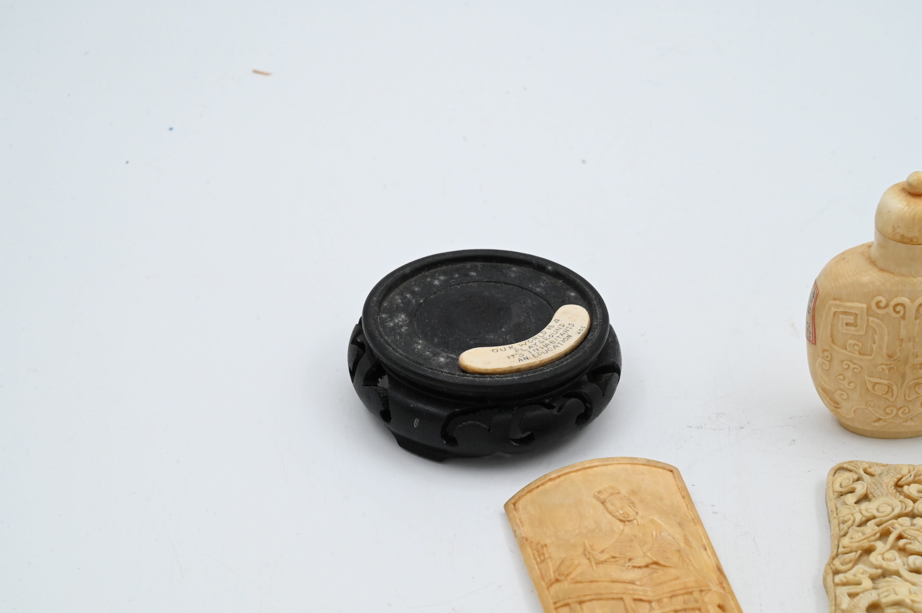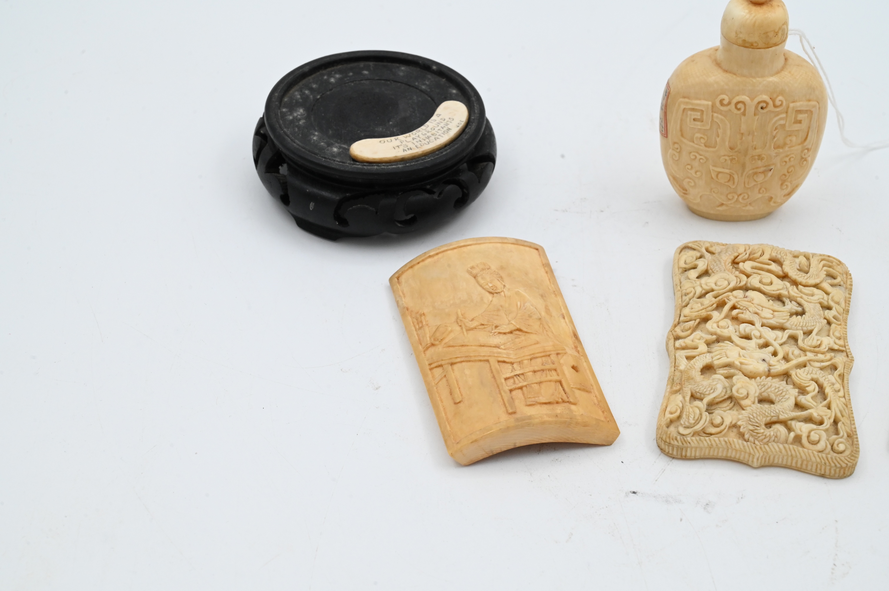 to include two carved panels, one snuff bottle, one card case, all 19th century or earlier