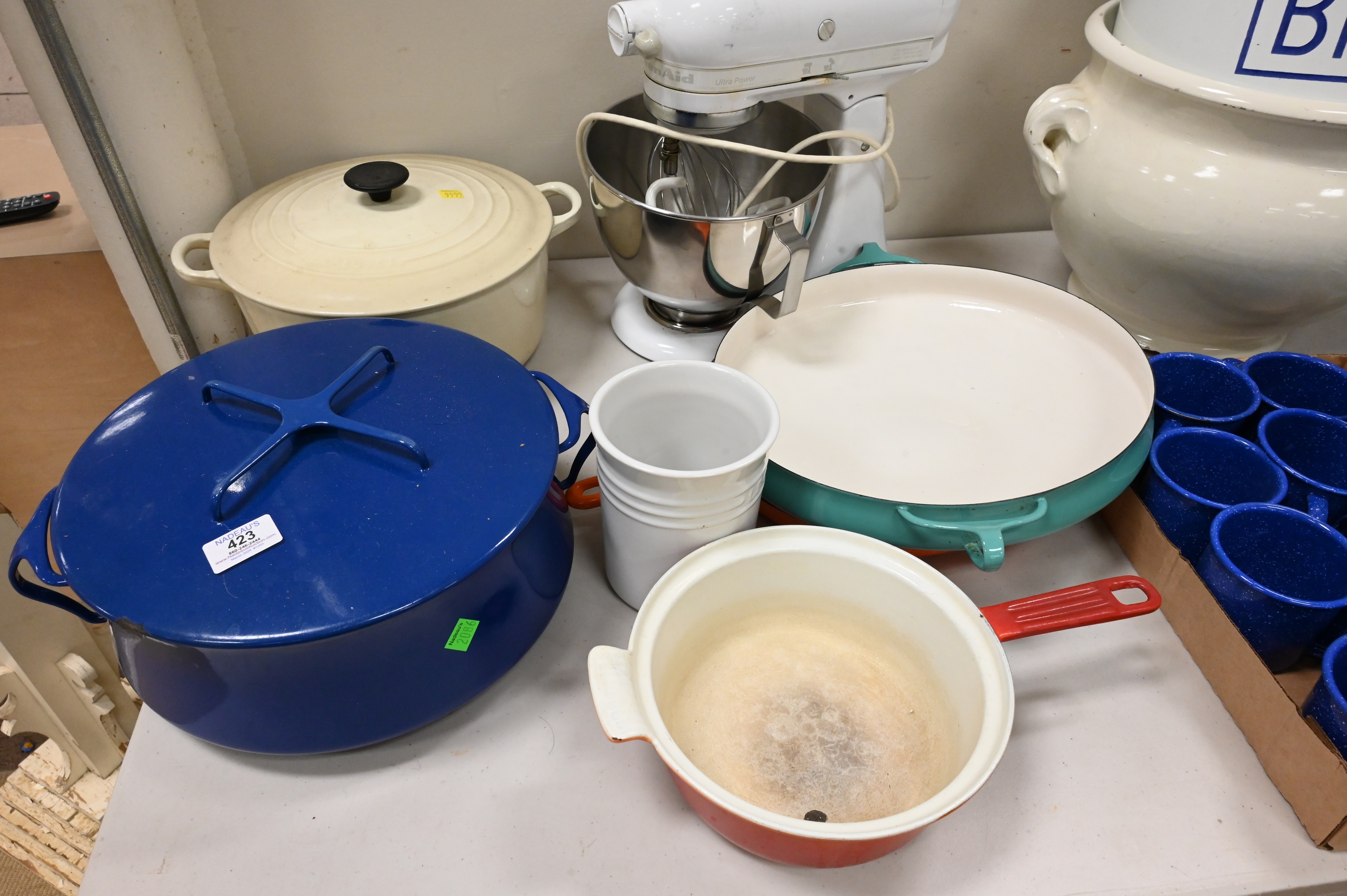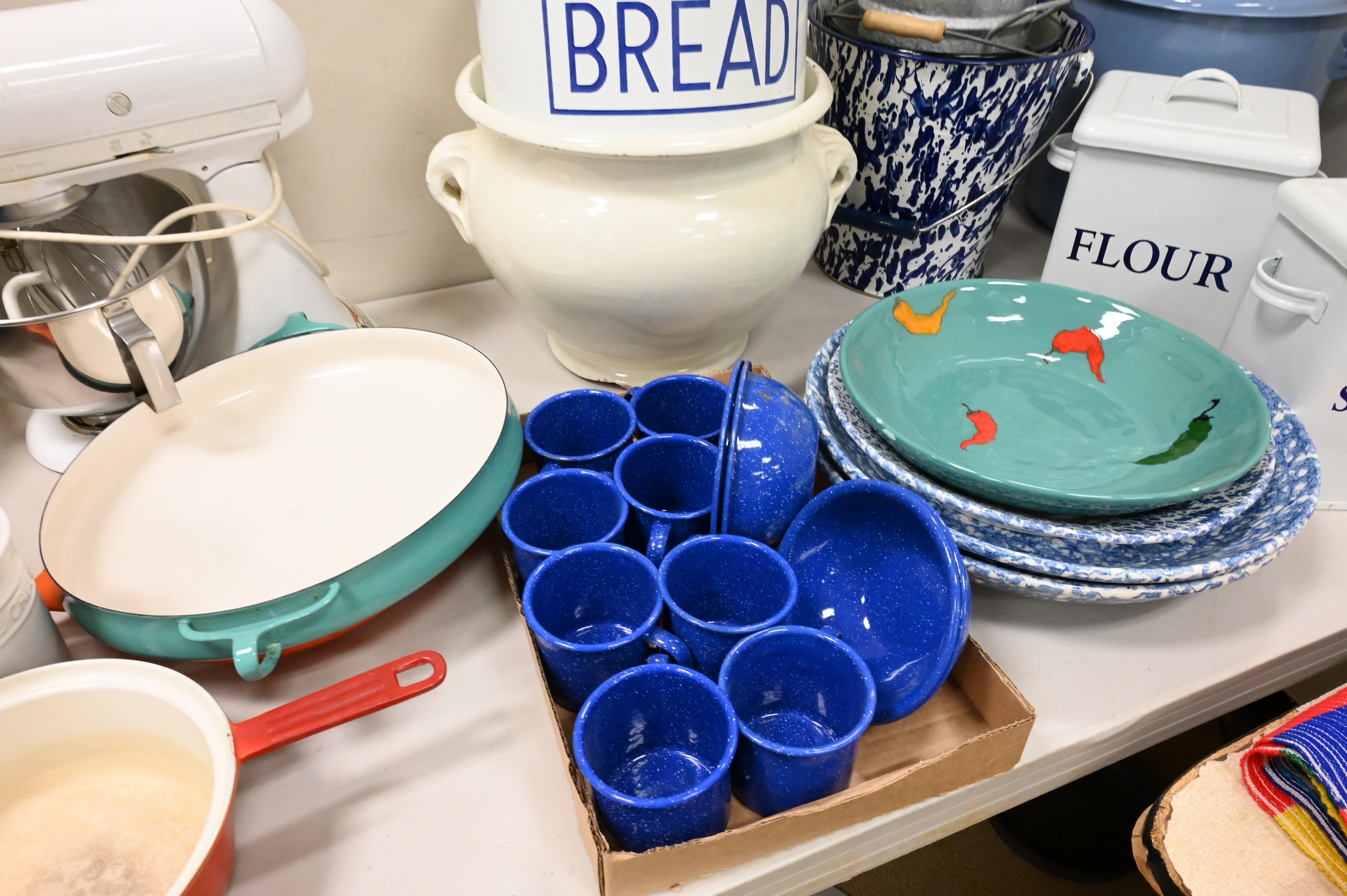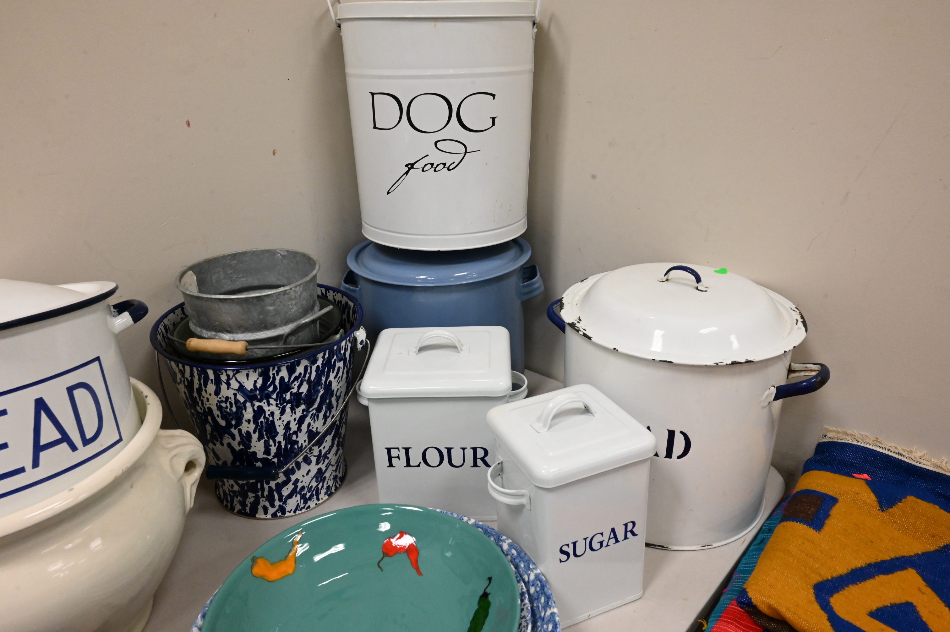to include flour and sugar canisters from Restoration Hardware, two bread canisters, three buckets one having graniteware, dog food canister, lobster pot, camp cups and bowls, cookware, along with Kitchenaid mixer