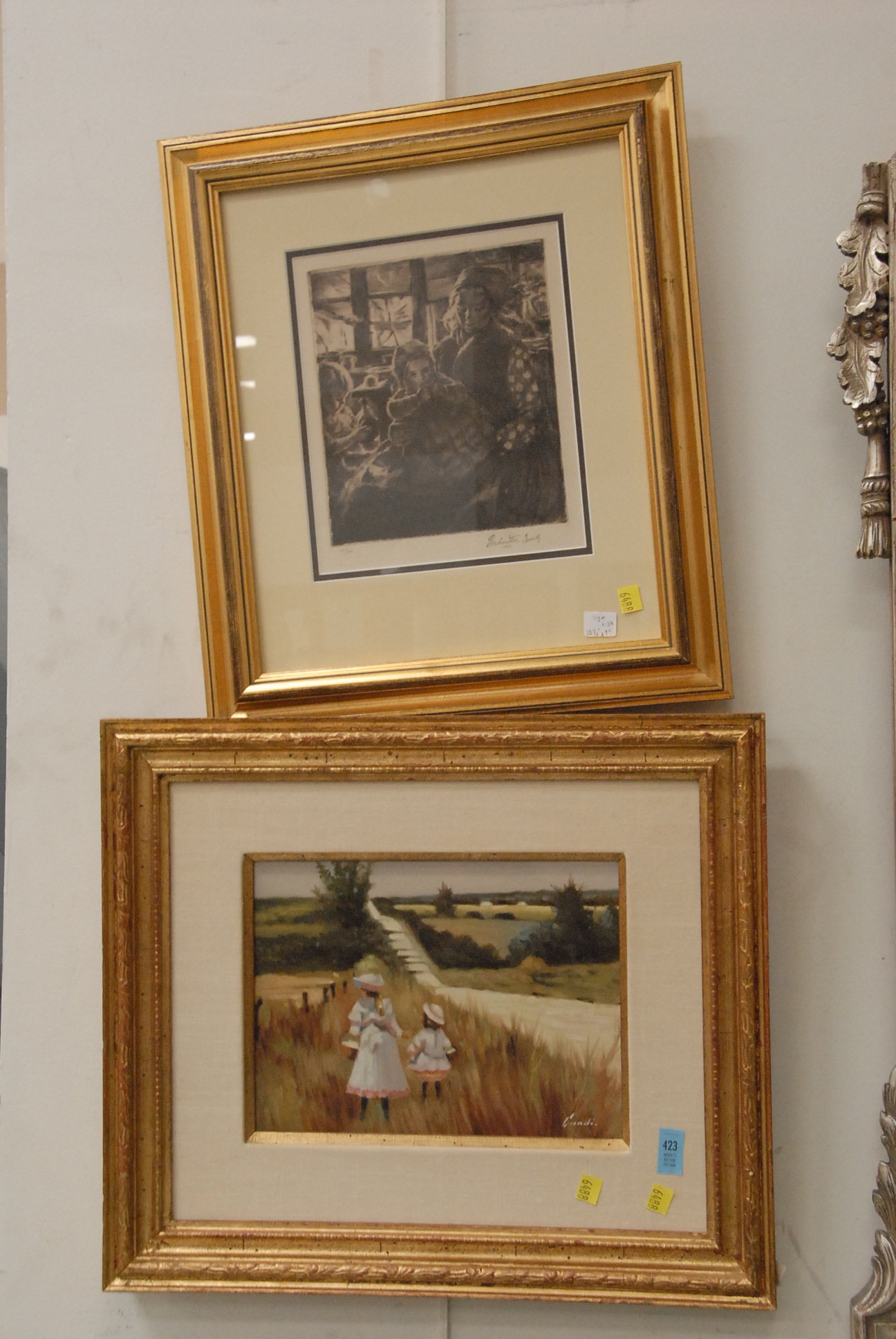 Group of five prints and painting to include Paul Zimmerman 1921-2007 watercolor landscape, 11 1/2 x 15, decorative of of chickens, etching signed Perh , 1906, 15/50, 10 1/2 x 9, Oil on canvas signed lower right Candies, and a small watercolor of a house. Provenance: Estate of Judy Gengras McDonough of West Hartford, CT.