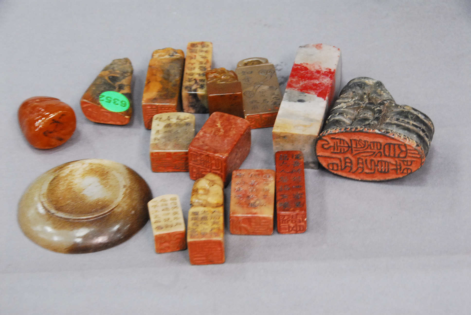 Lot 423: Large group lot of soap stone and jade items to include seals, small dish, and jade ring, 22 pieces, hts. 1 to 4.