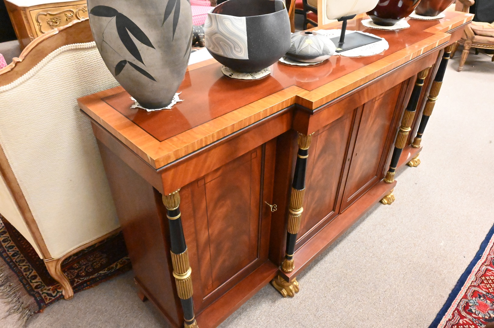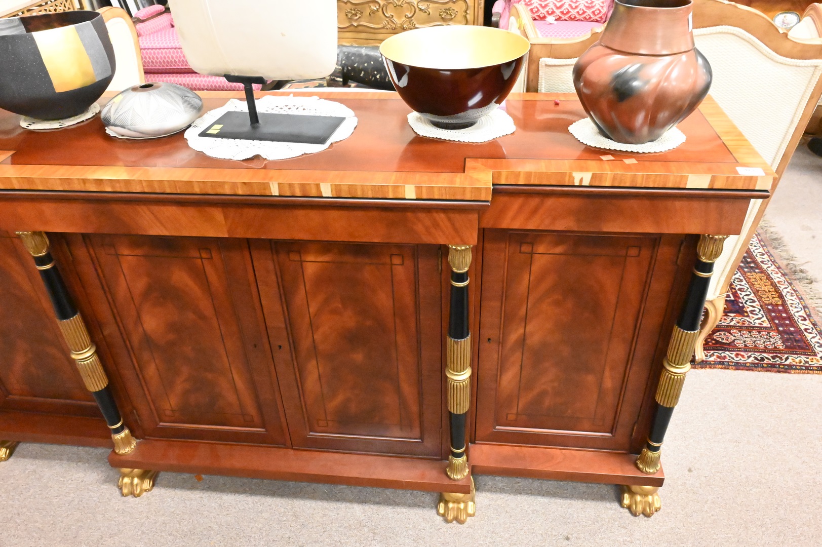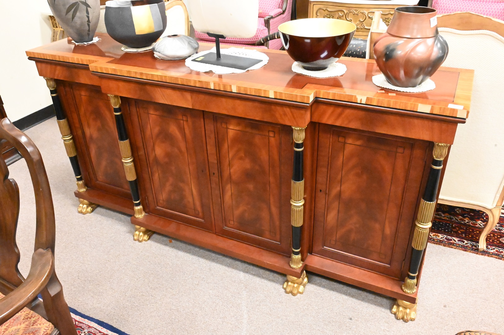 Neoclassical Style Inlaid Server, having two center doors flanked by side doors over paw feet, veneer chips, height 36 inches, top 17 1/2″ x 72″