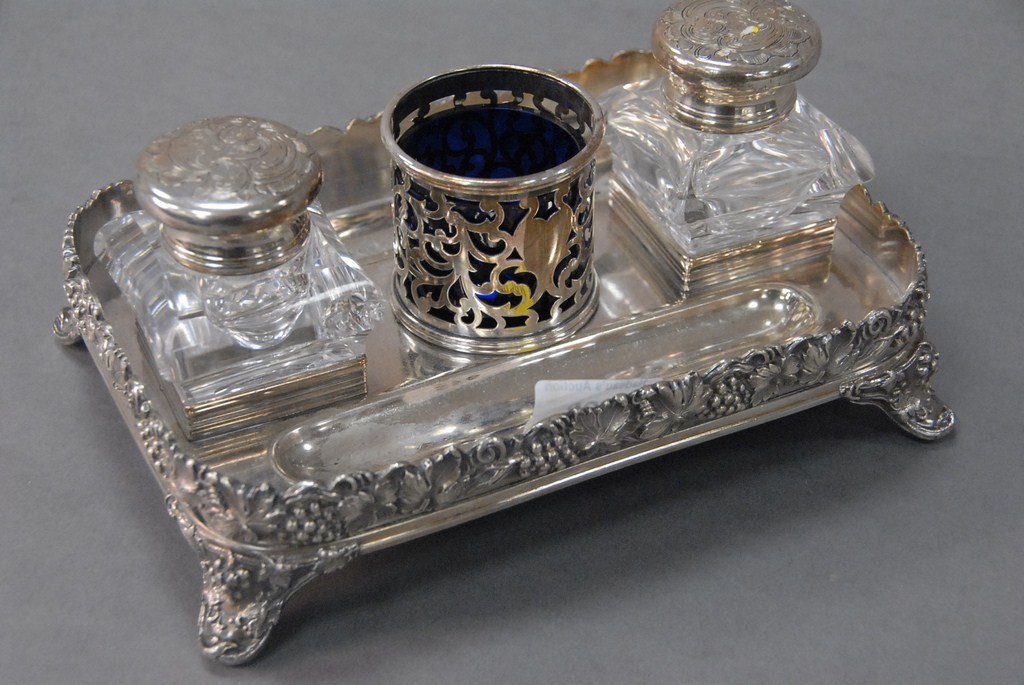 Lot 423: Sheffield silverplated ink set tray with two bottles and cobalt lined pen holder one bottle chipped. Provenance: Estate of Judy Mc…