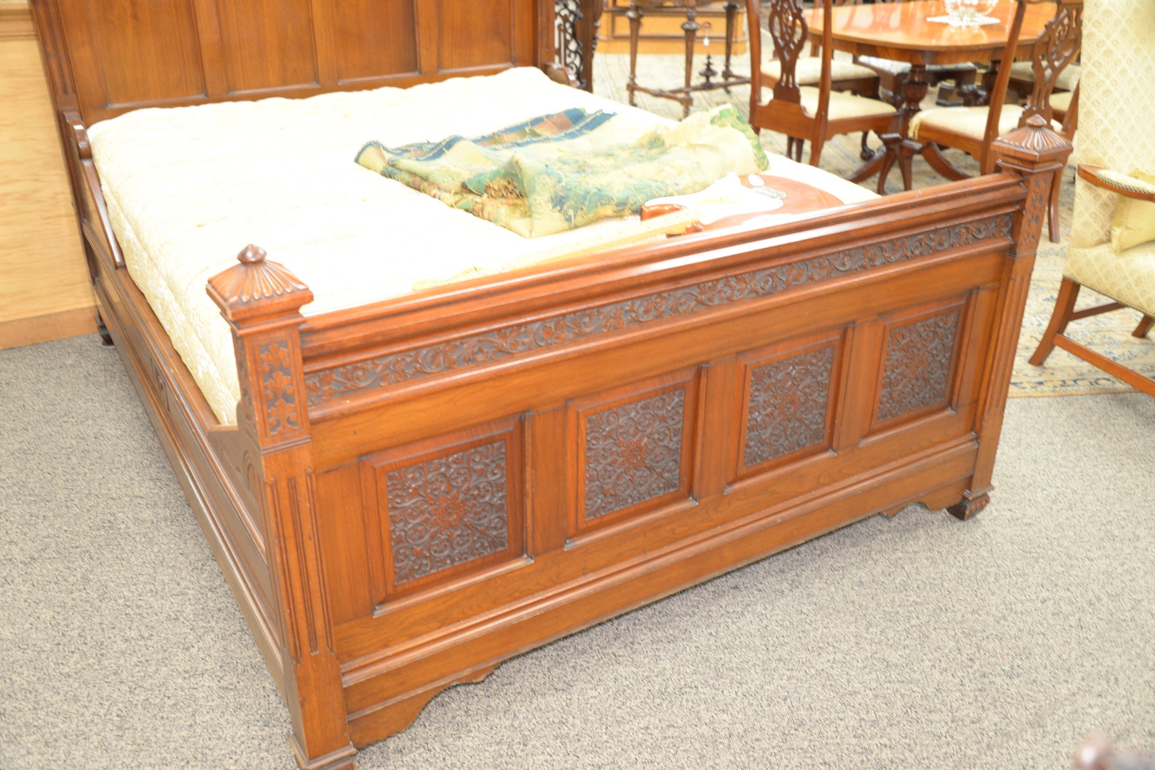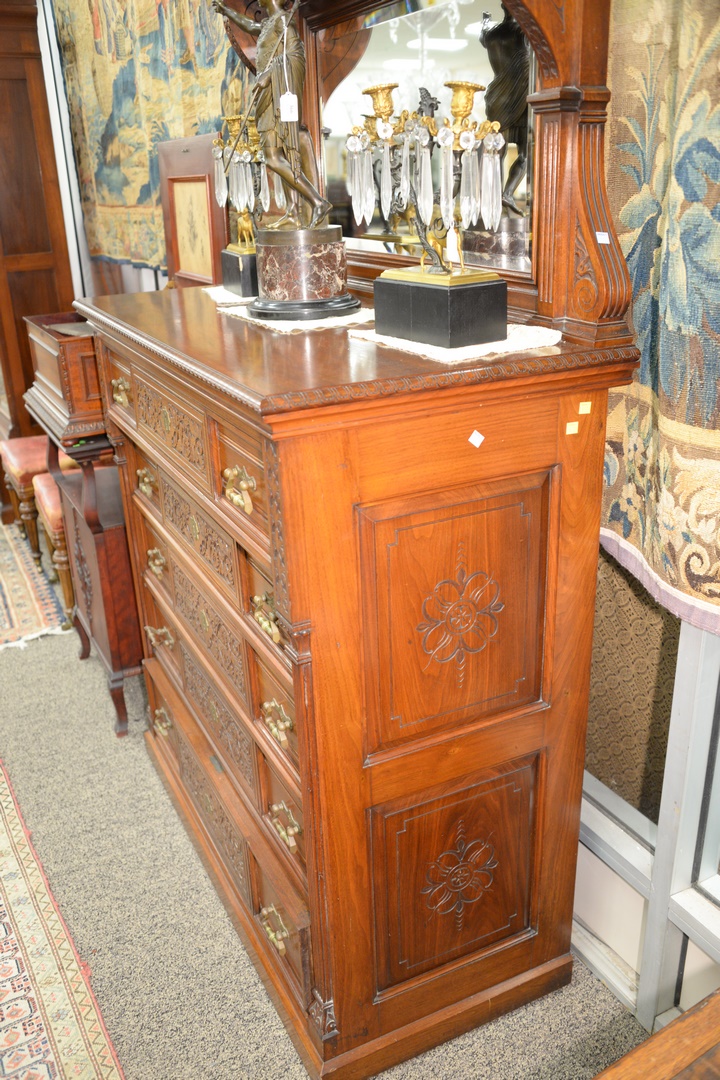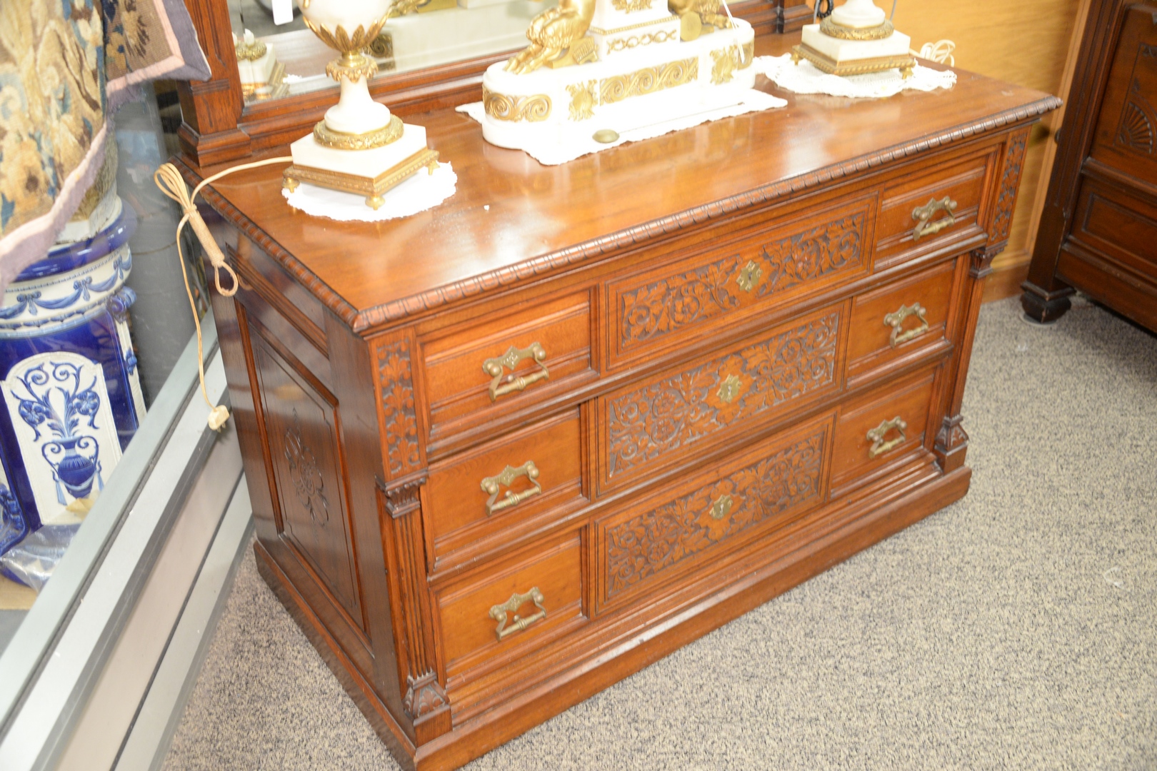 Lot 423: Three Piece Aesthetic Walnut Bedroom Set having carved high back bed, three drawer chest with mirror, five drawer tall chest with…