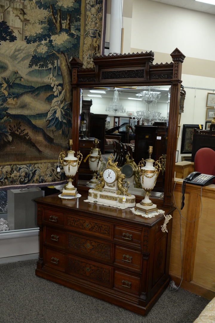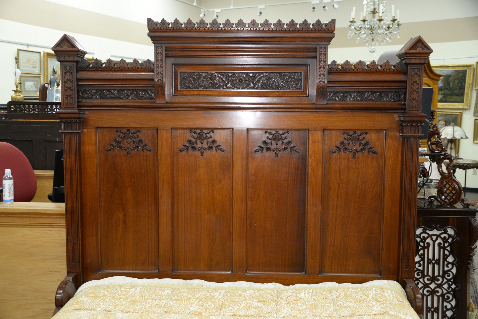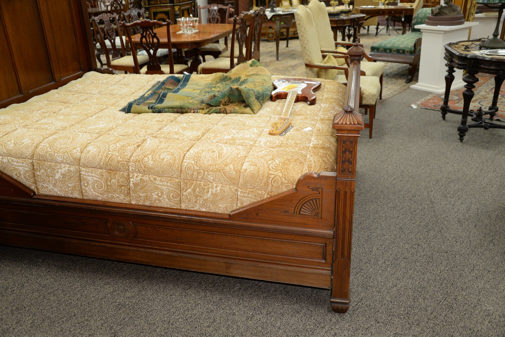 Lot 423: Three Piece Aesthetic Walnut Bedroom Set having carved high back bed, three drawer chest with mirror, five drawer tall chest with…