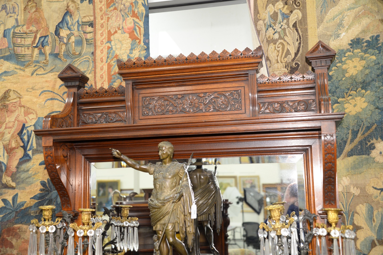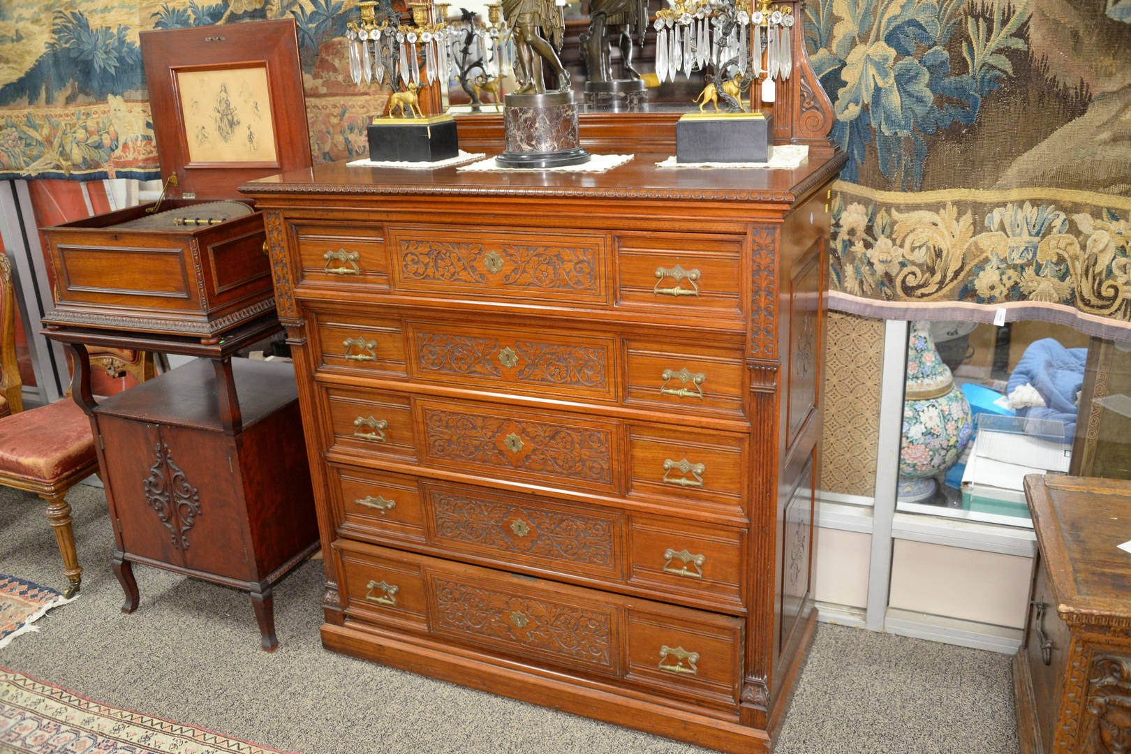 Three Piece Aesthetic Walnut Bedroom Set having carved high back bed, three drawer chest with mirror, five drawer tall chest with mirror and shelf both chests with floral carved side panels, to include cheval mirror with claw feet, takes a standard queen size mattress bed interior 60 x 78, tall chest height 86 inches, chest height 87 inches, bed height 77 inches Provenance: Thirty-five year collection of Dana Cooley, Old Lyme, Connecticut