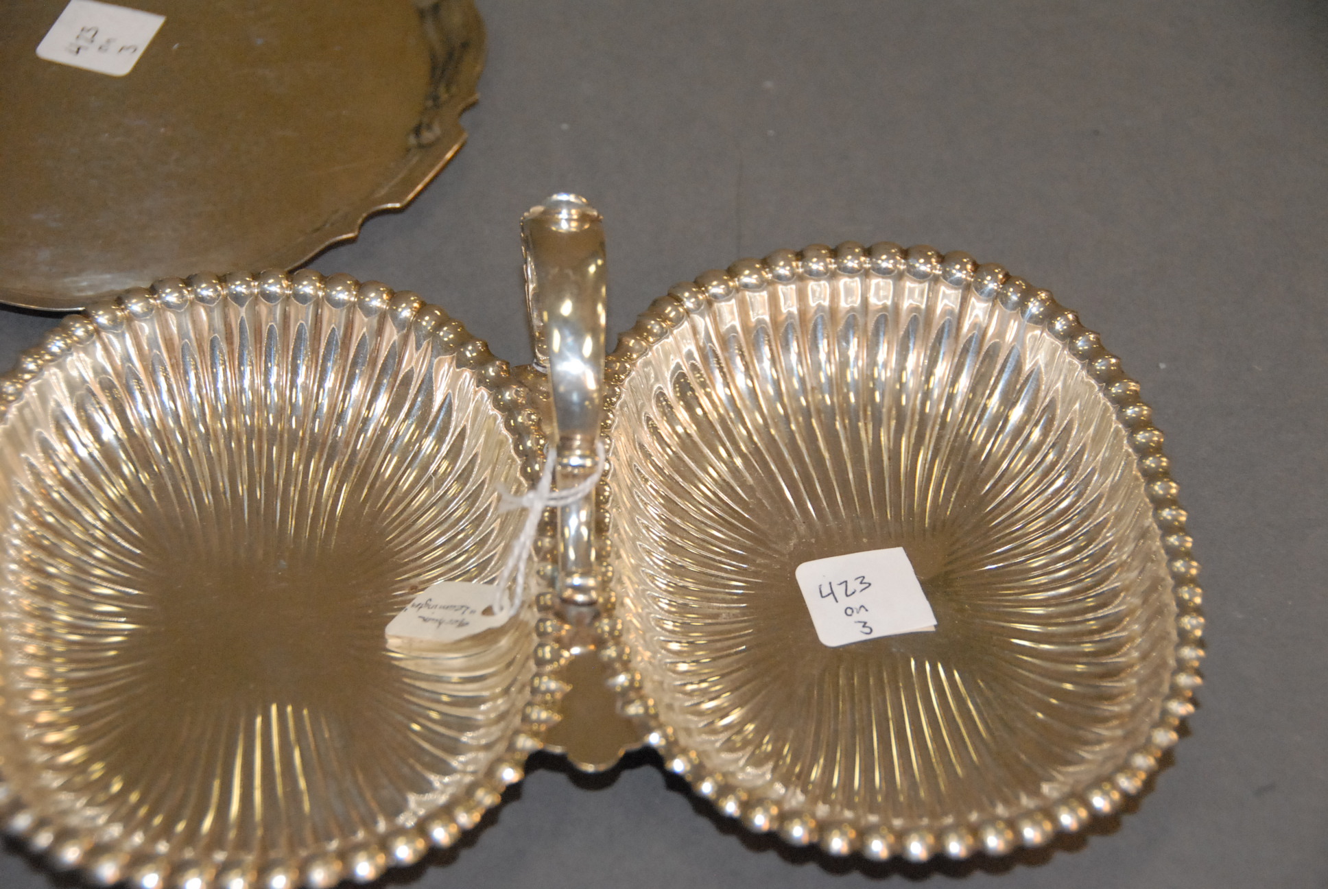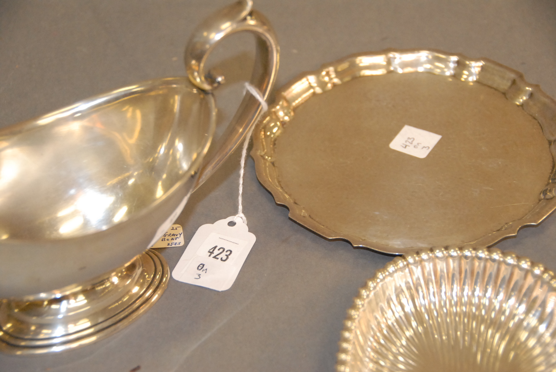 Lot 423: Three sterling pieces Gorham Leamington double dish, gravy boat, hand hammered Gorham salver, 16