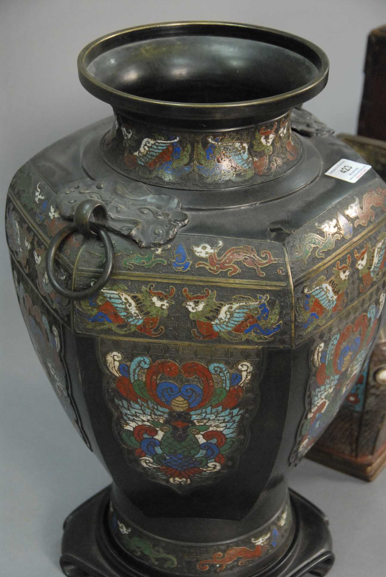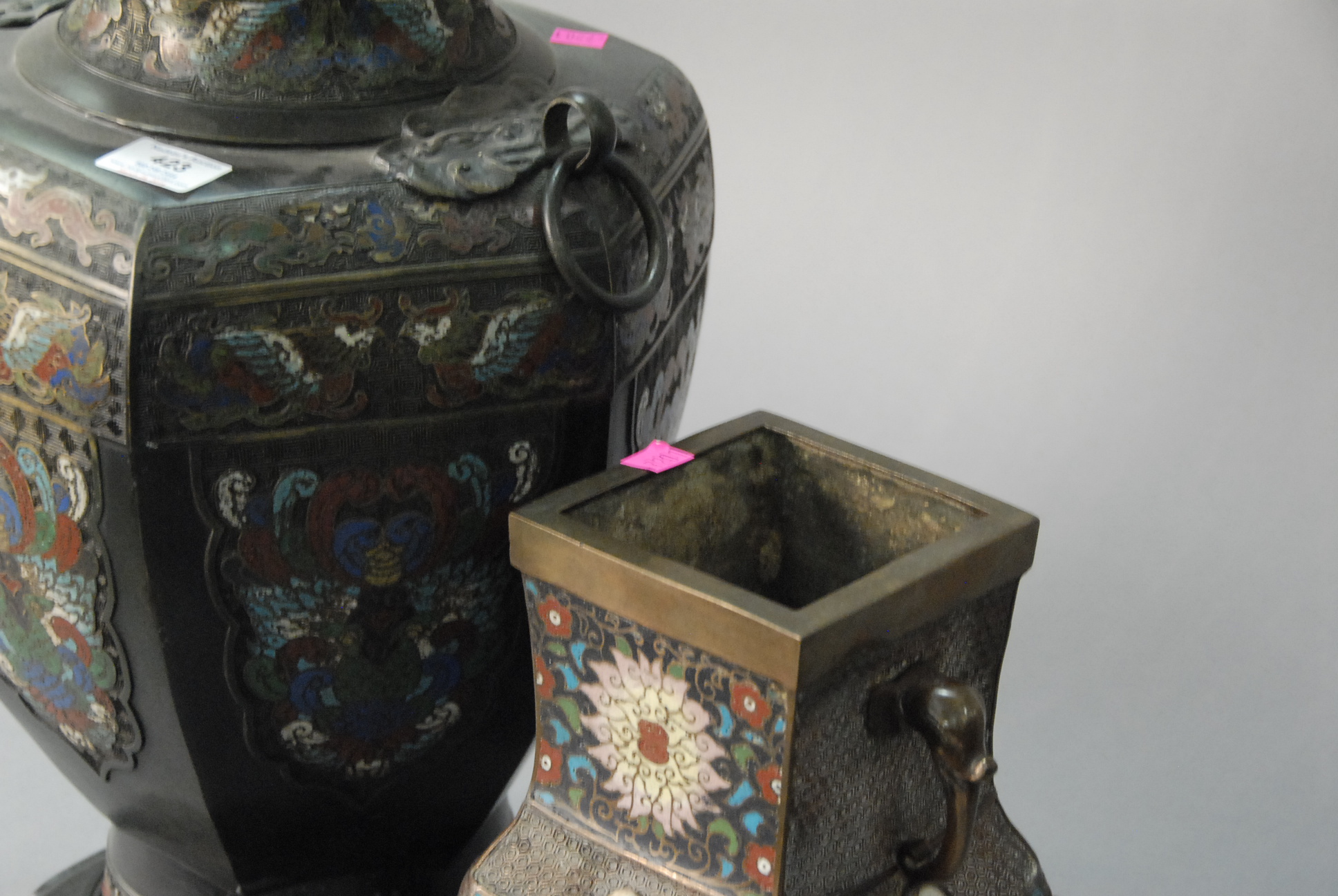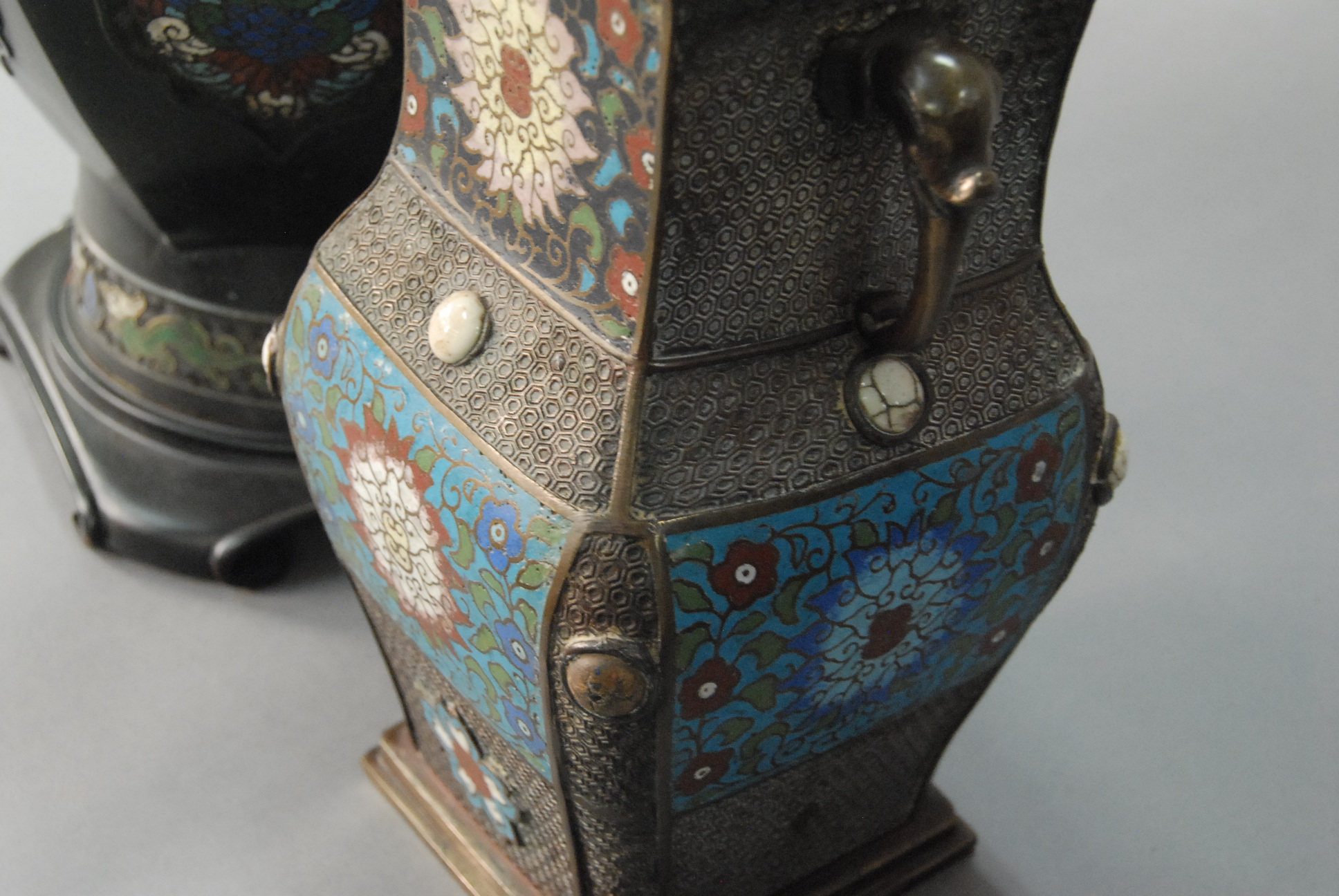 Two champlev vases, one square and one six sided, no bottoms. ht. 12 1/2in. & 18 1/2in.
