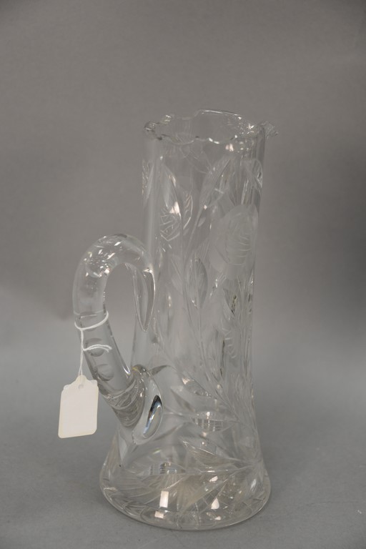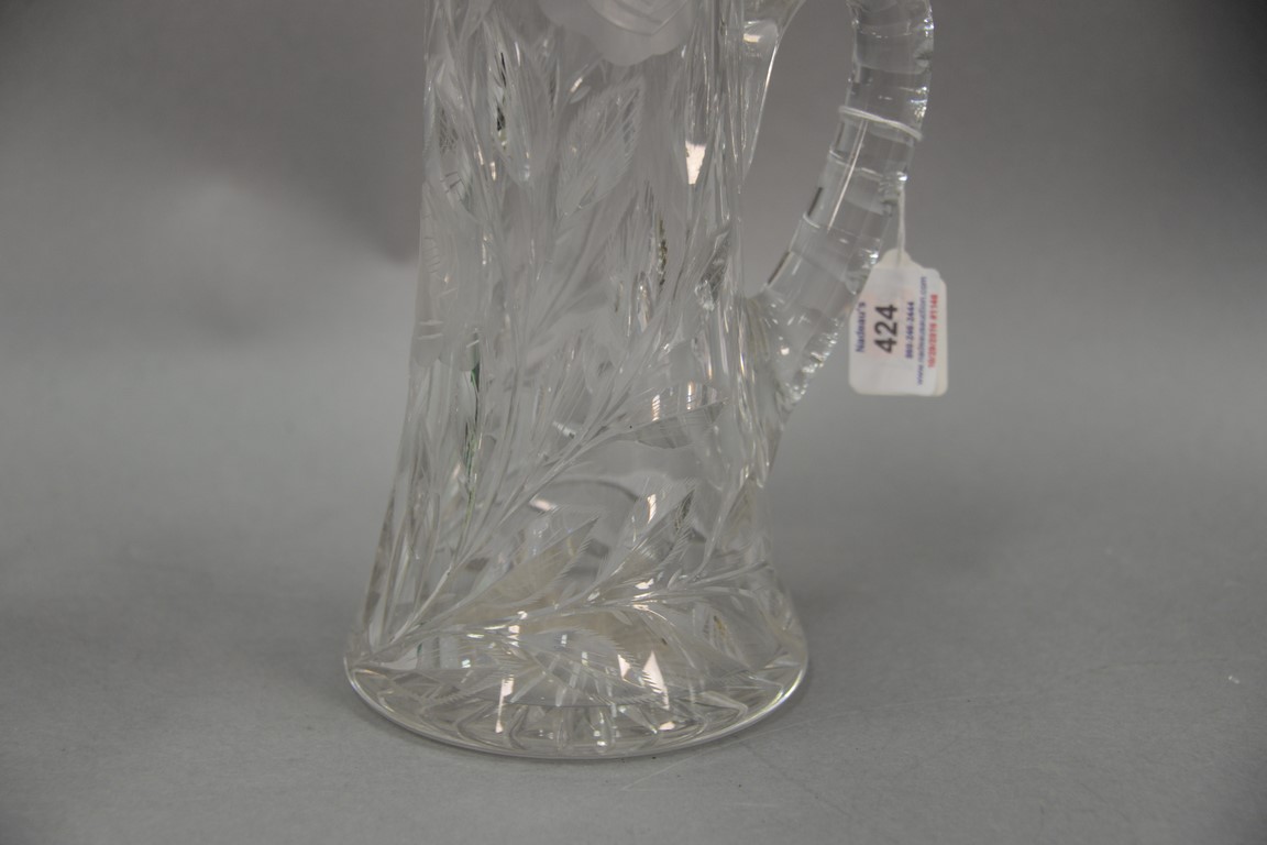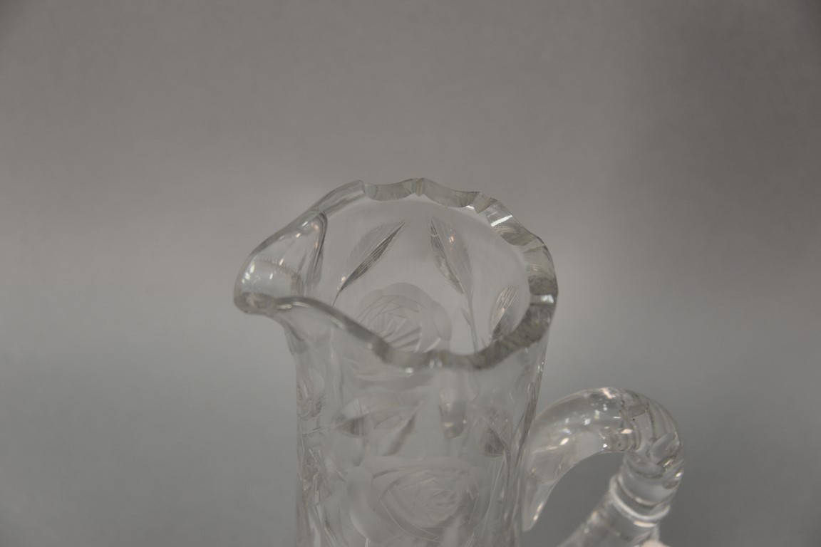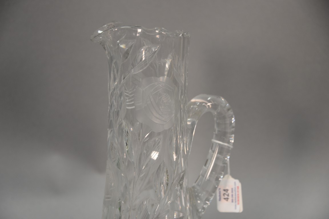 American Brilliant cut glass pitcher with cut and ground roses, black lights apple green. ht. 11 1/2in.