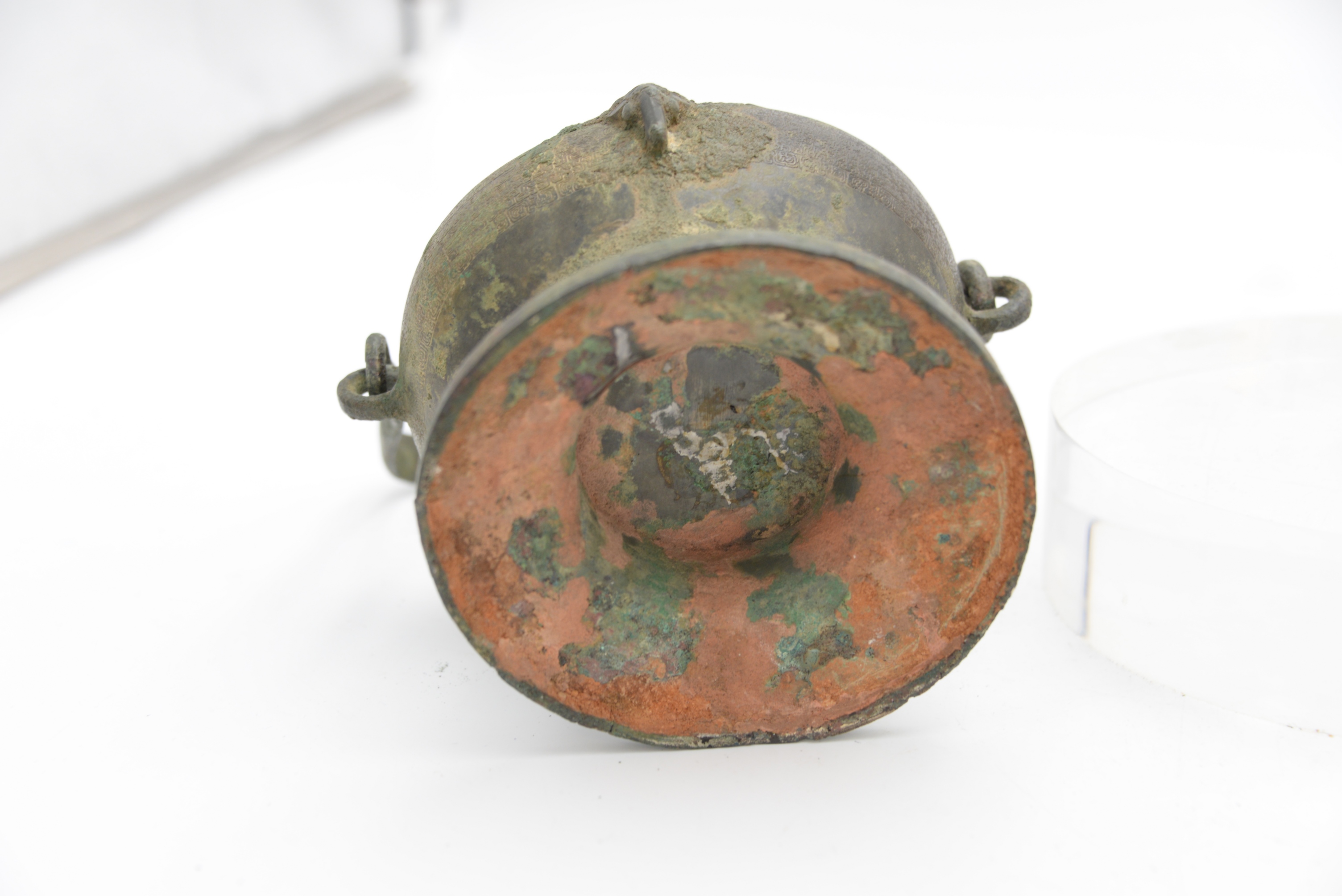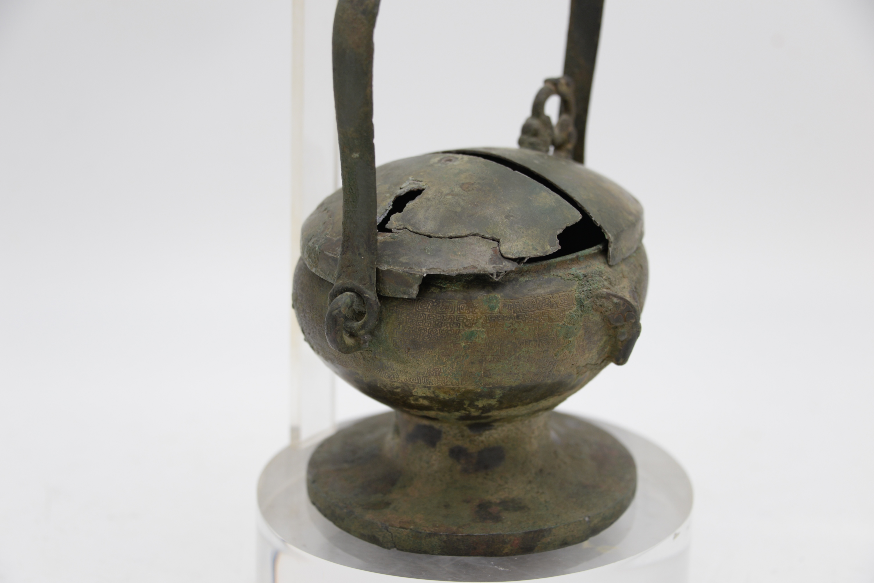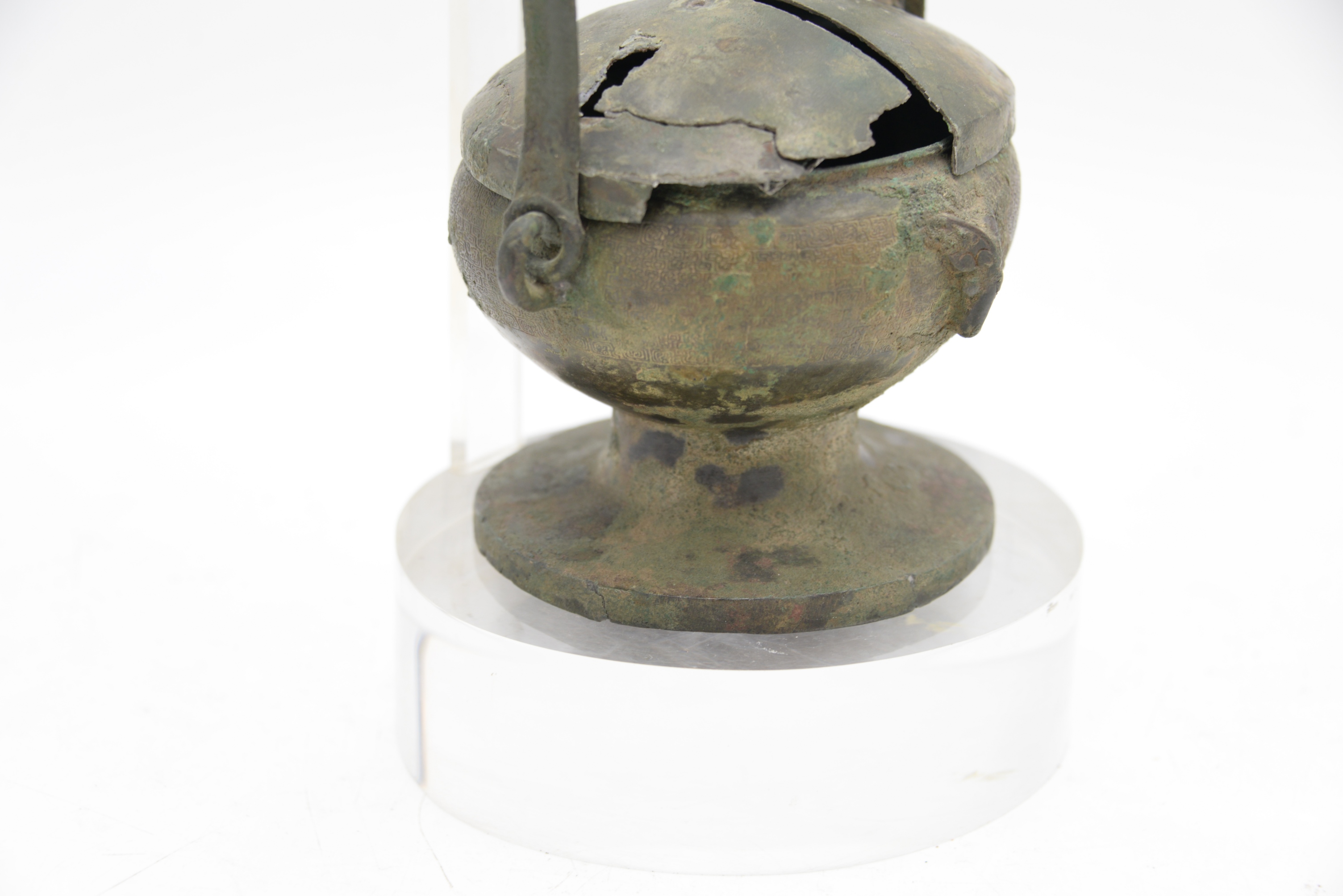 Archaic Bronze Censer with Cover, having animal masks on vermiculated scroll ground body on raised footed base, dome cover with two loop handles (as is) beneath swing carrying handle, height 8 1/2 inches, diameter 6 1/2 inches.