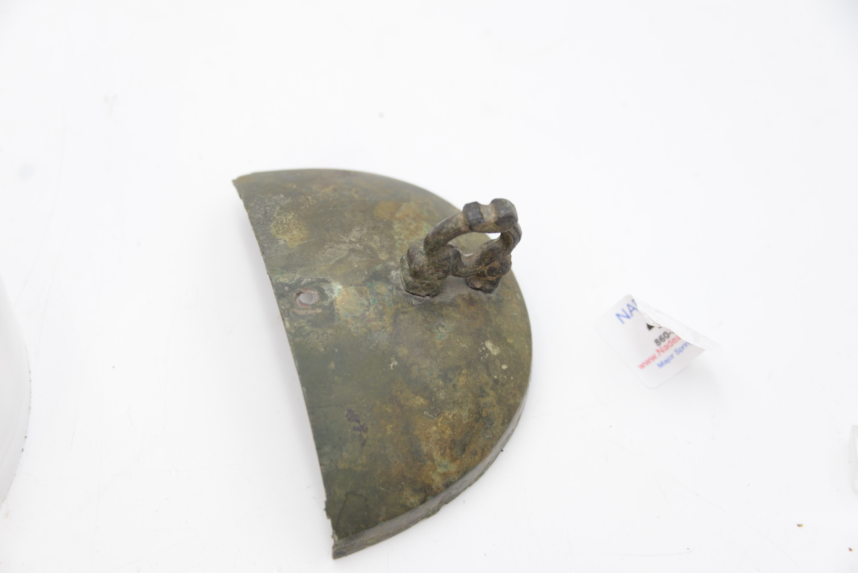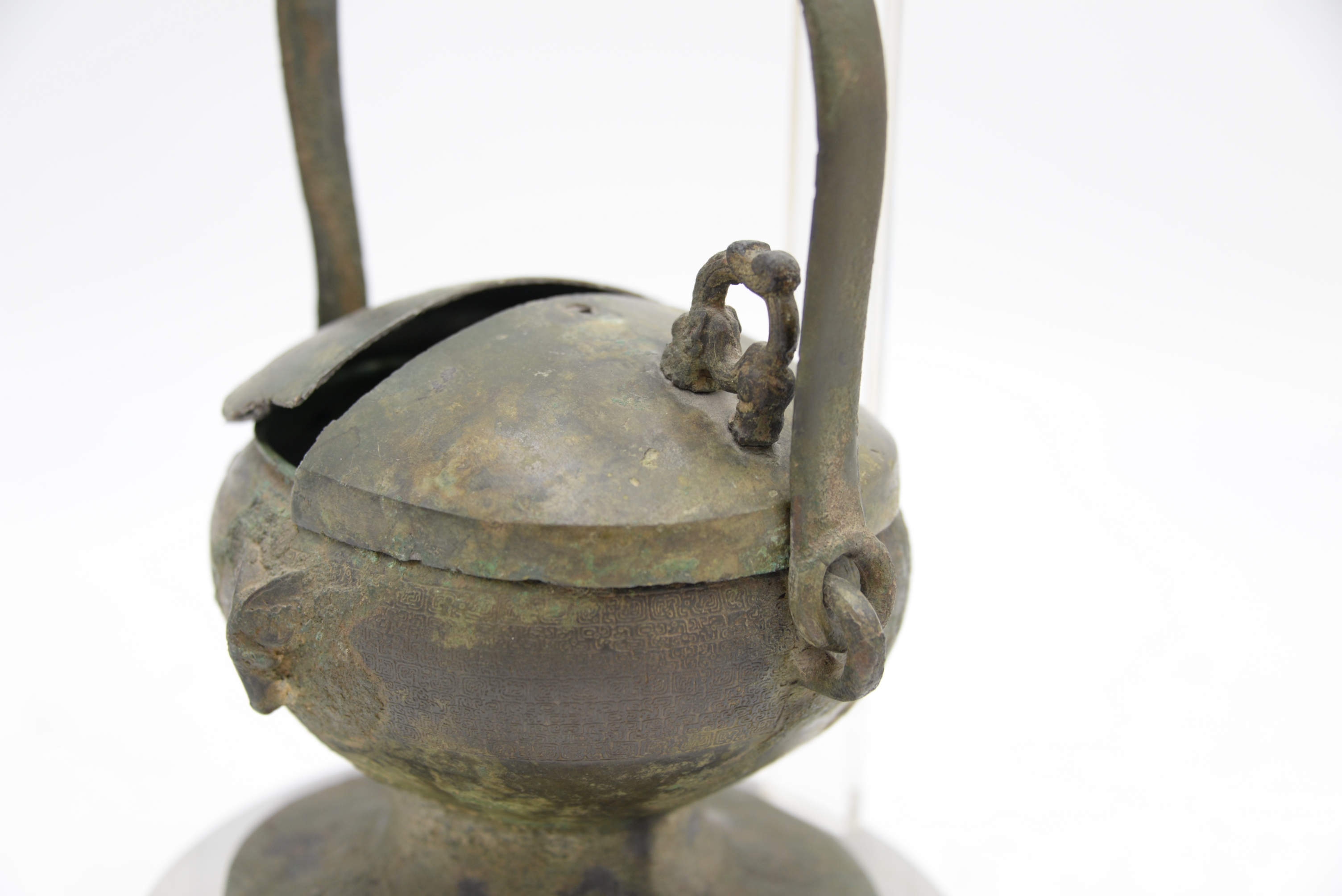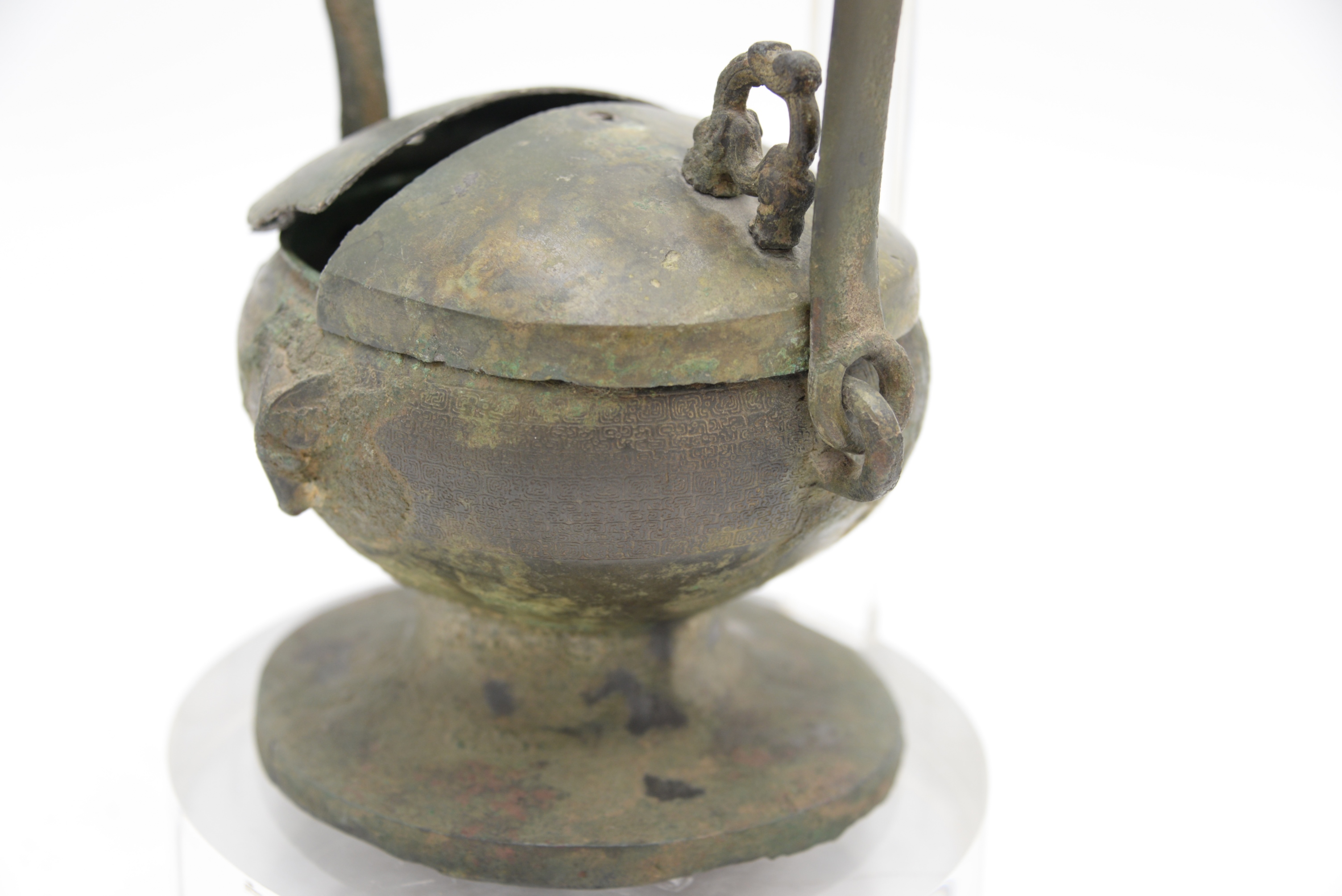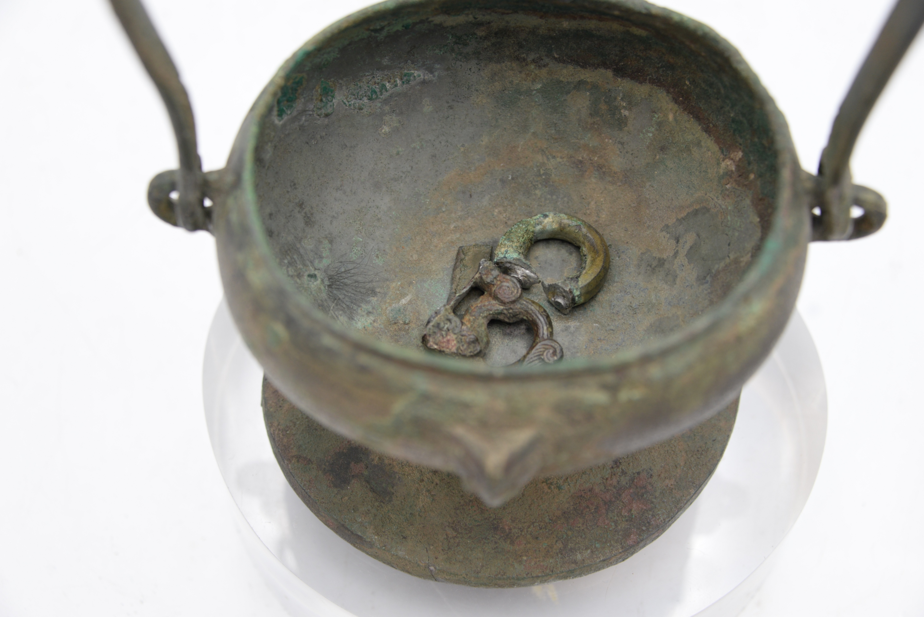 Archaic Bronze Censer with Cover, having animal masks on vermiculated scroll ground body on raised footed base, dome cover with two loop handles (as is) beneath swing carrying handle, height 8 1/2 inches, diameter 6 1/2 inches.