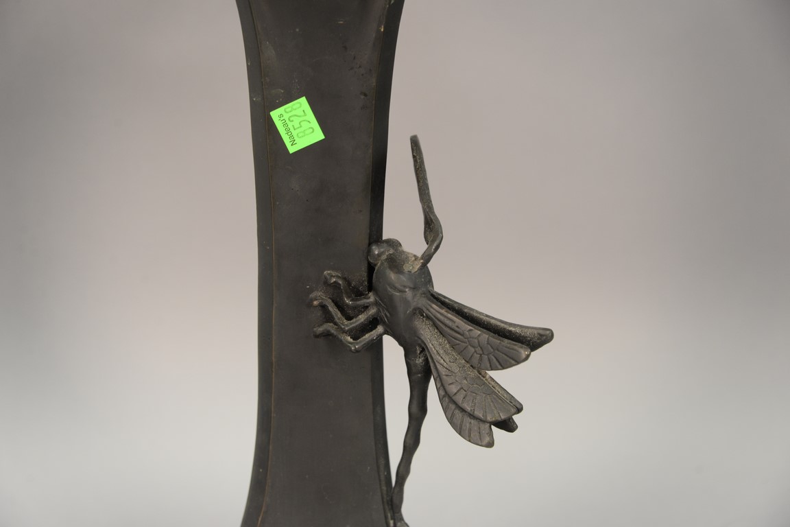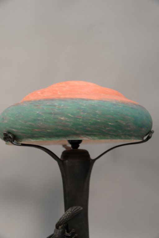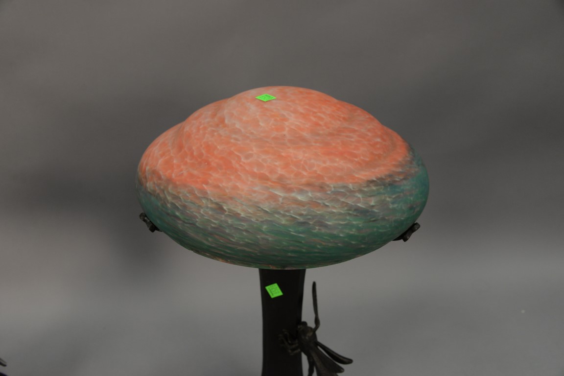 Lot 424: Contemporary table lamp with art glass mushroom form shade on bronze base with dragon fly. ht. 22in.