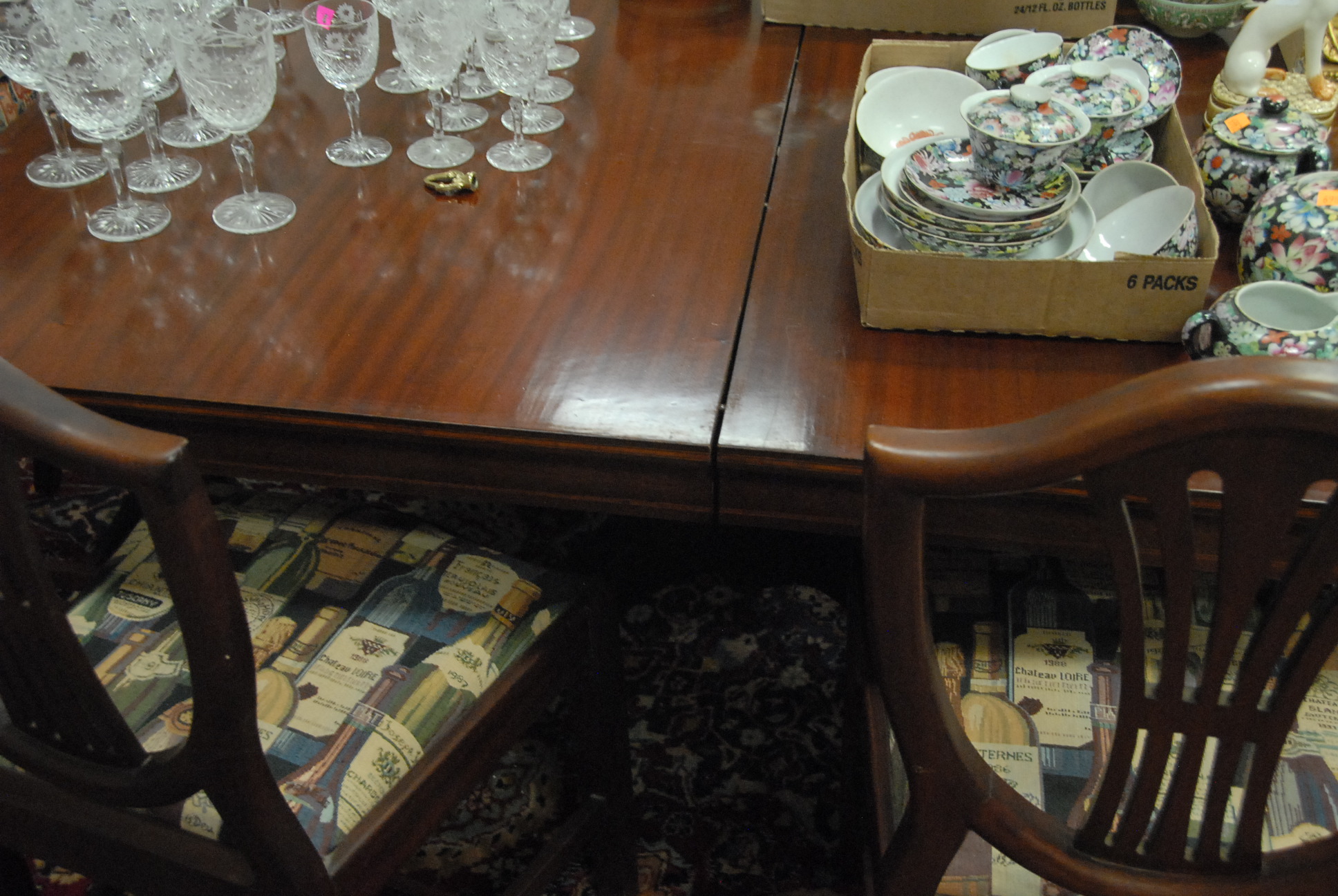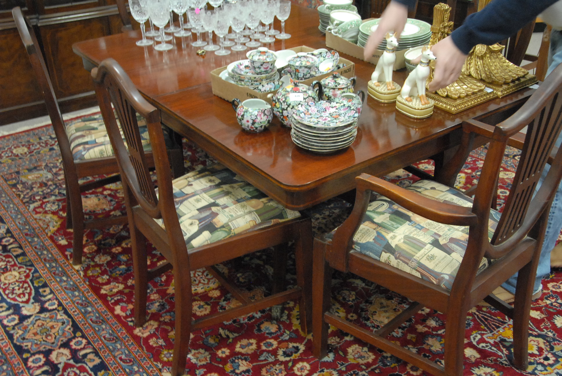 Custom mahogany single pedestal dining table and six chairs, all with bell flower inlays.