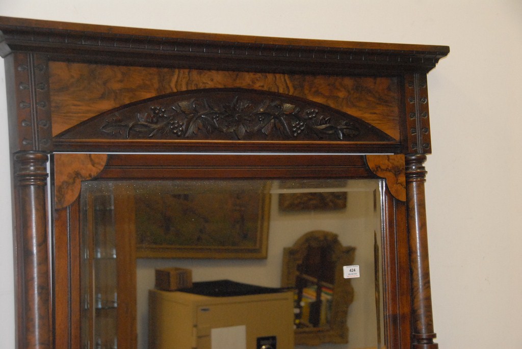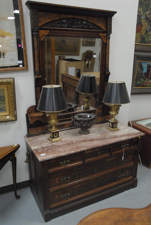 Lot 424: Eastlake Victorian two piece bedroom set, walnut and burl walnut having chest and mirror with brown and white marble top and carved …