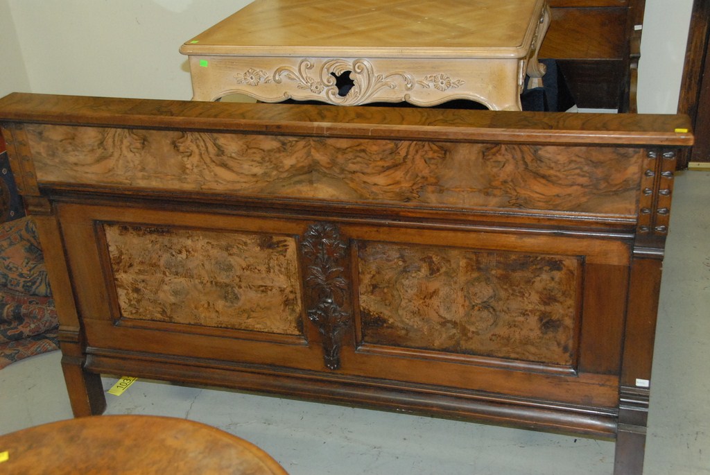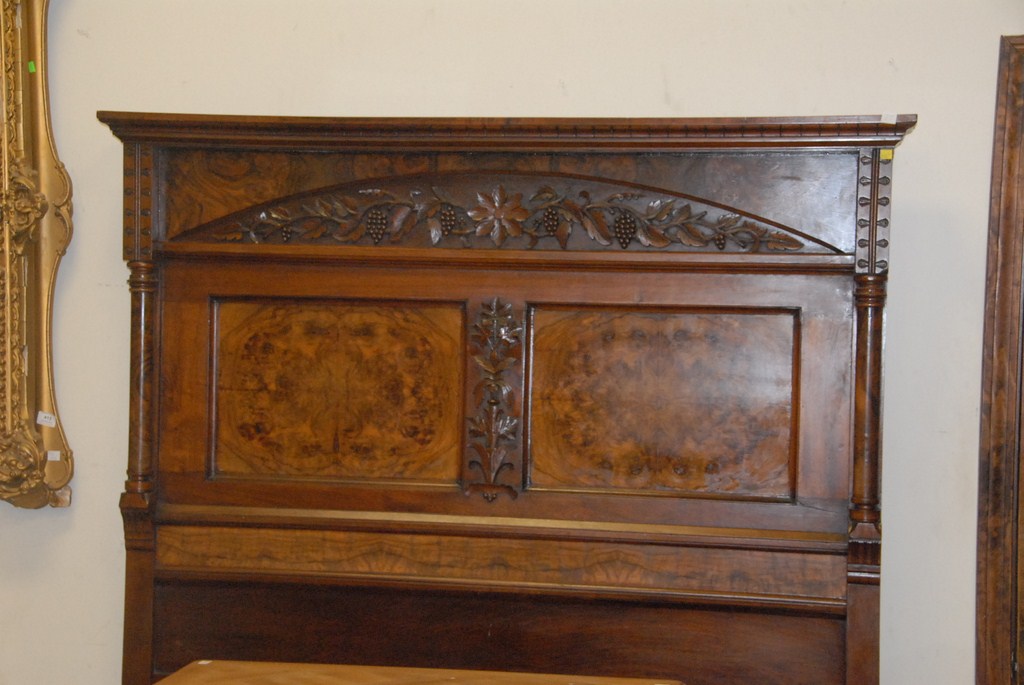 Eastlake Victorian two piece bedroom set, walnut and burl walnut having chest and mirror with brown and white marble top and carved high back Victorian bed. chest: ht. 80in. wd. 48in. bed: ht. 77in.