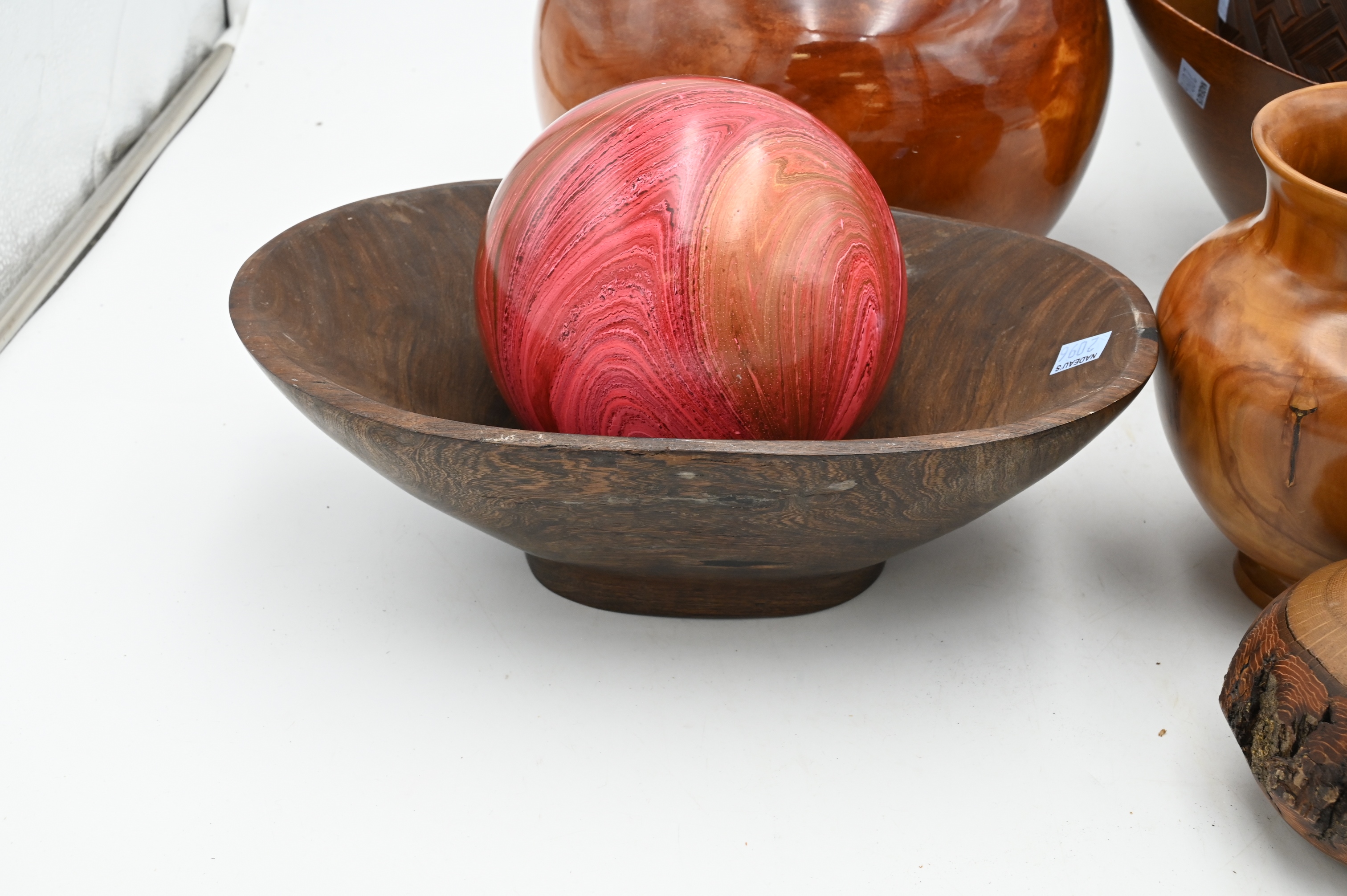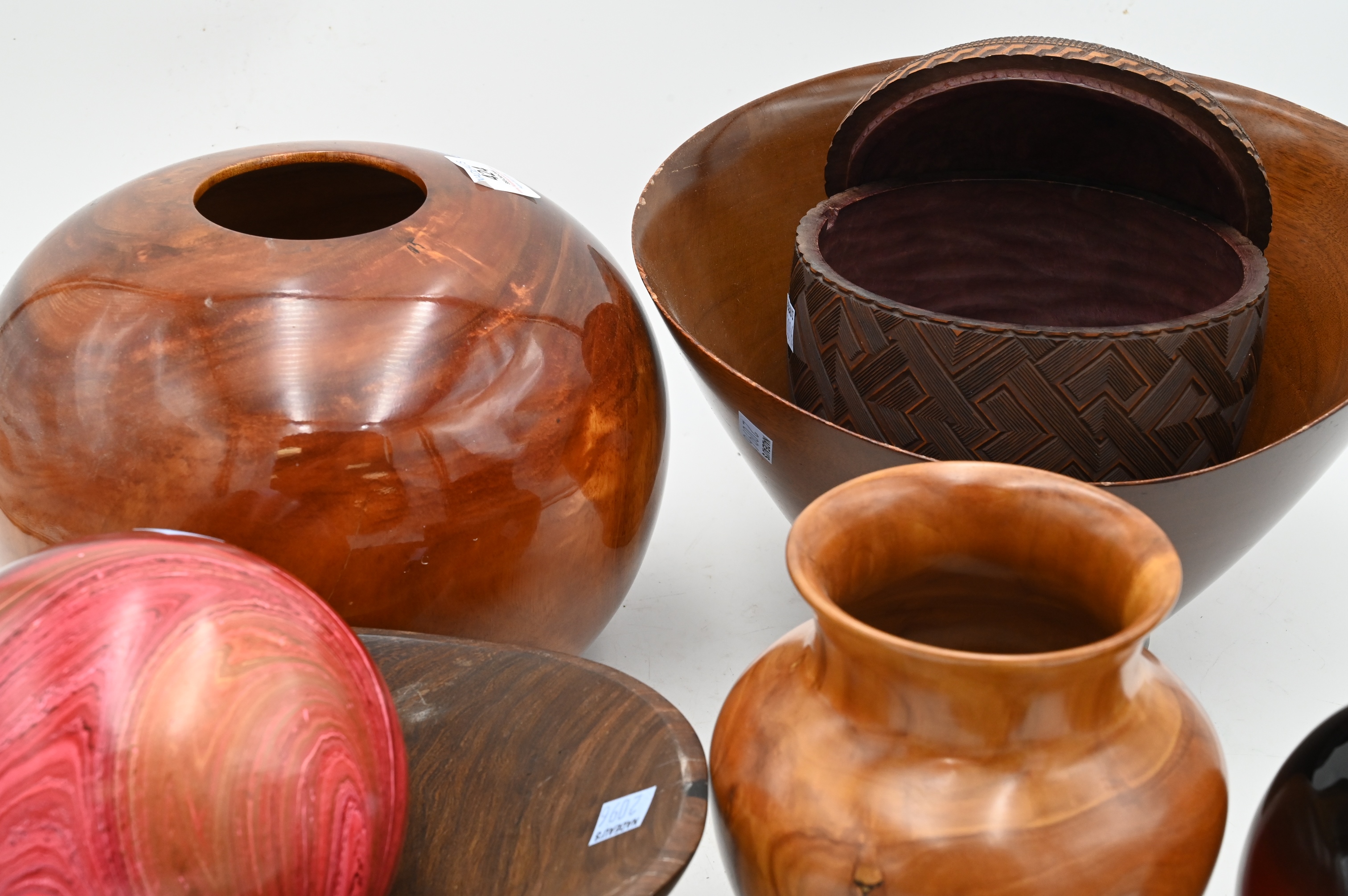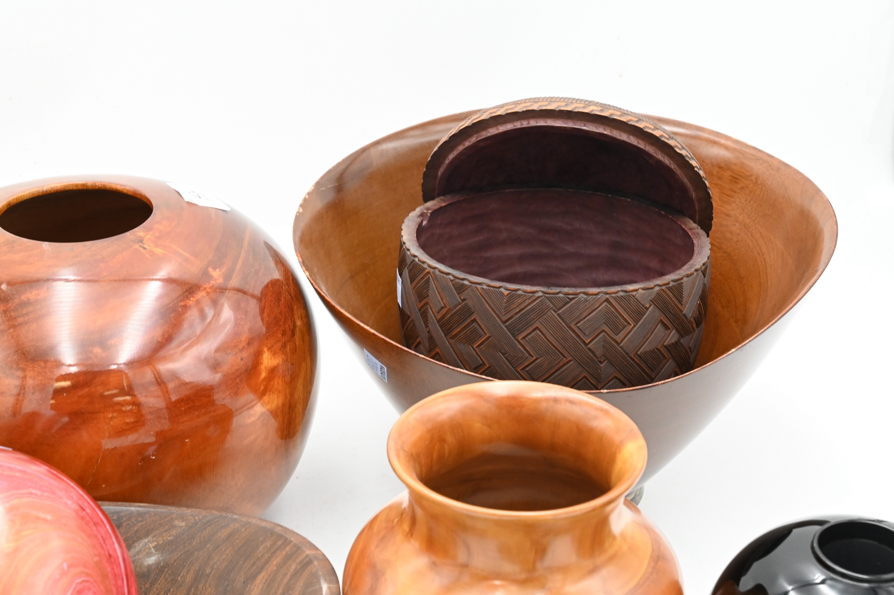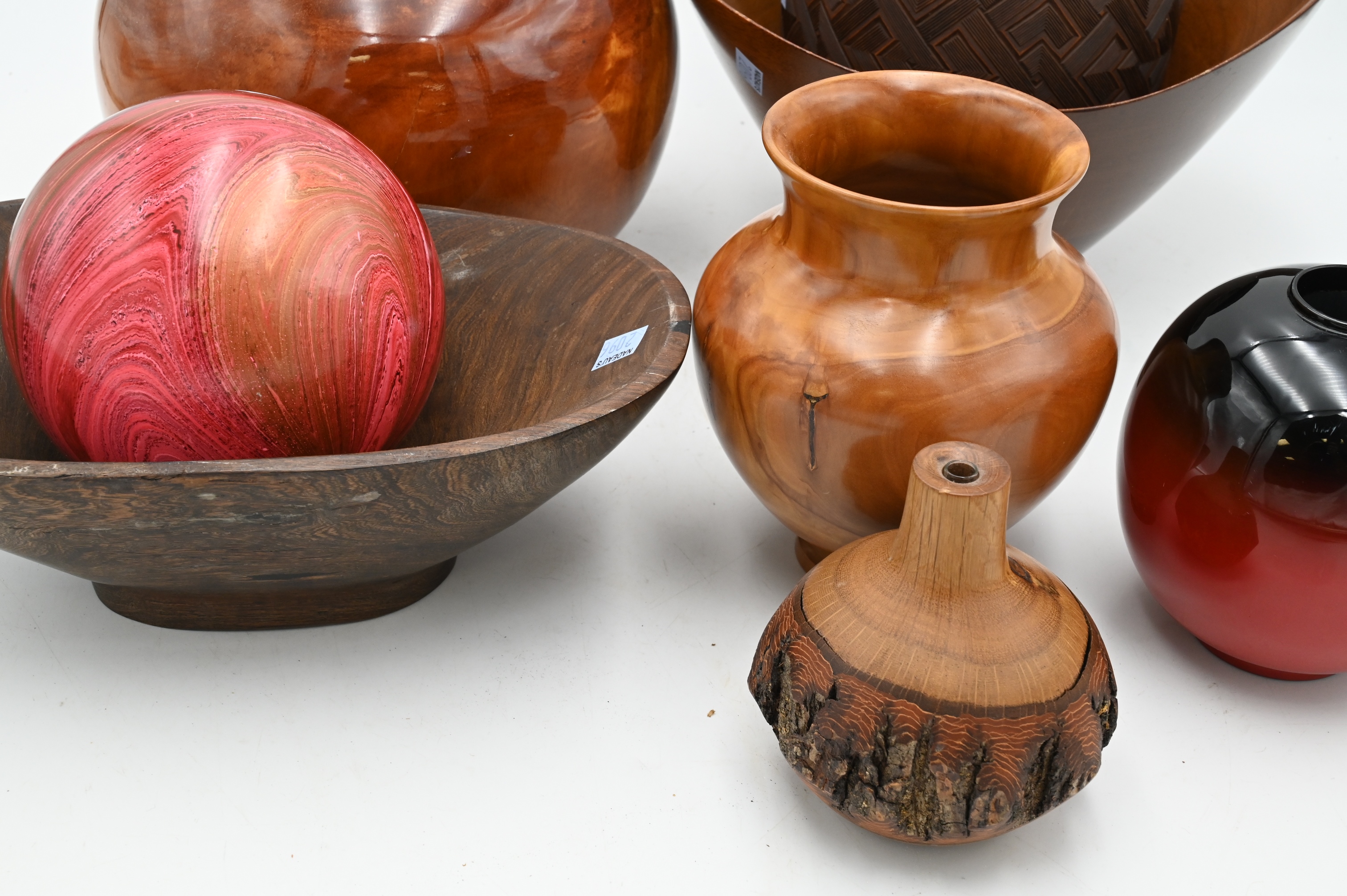 Eight Piece Vessel Lot, to include a large Williams turned vase, rosewood carved bowl, turned bowls, etc.., tallest height 8 inches.