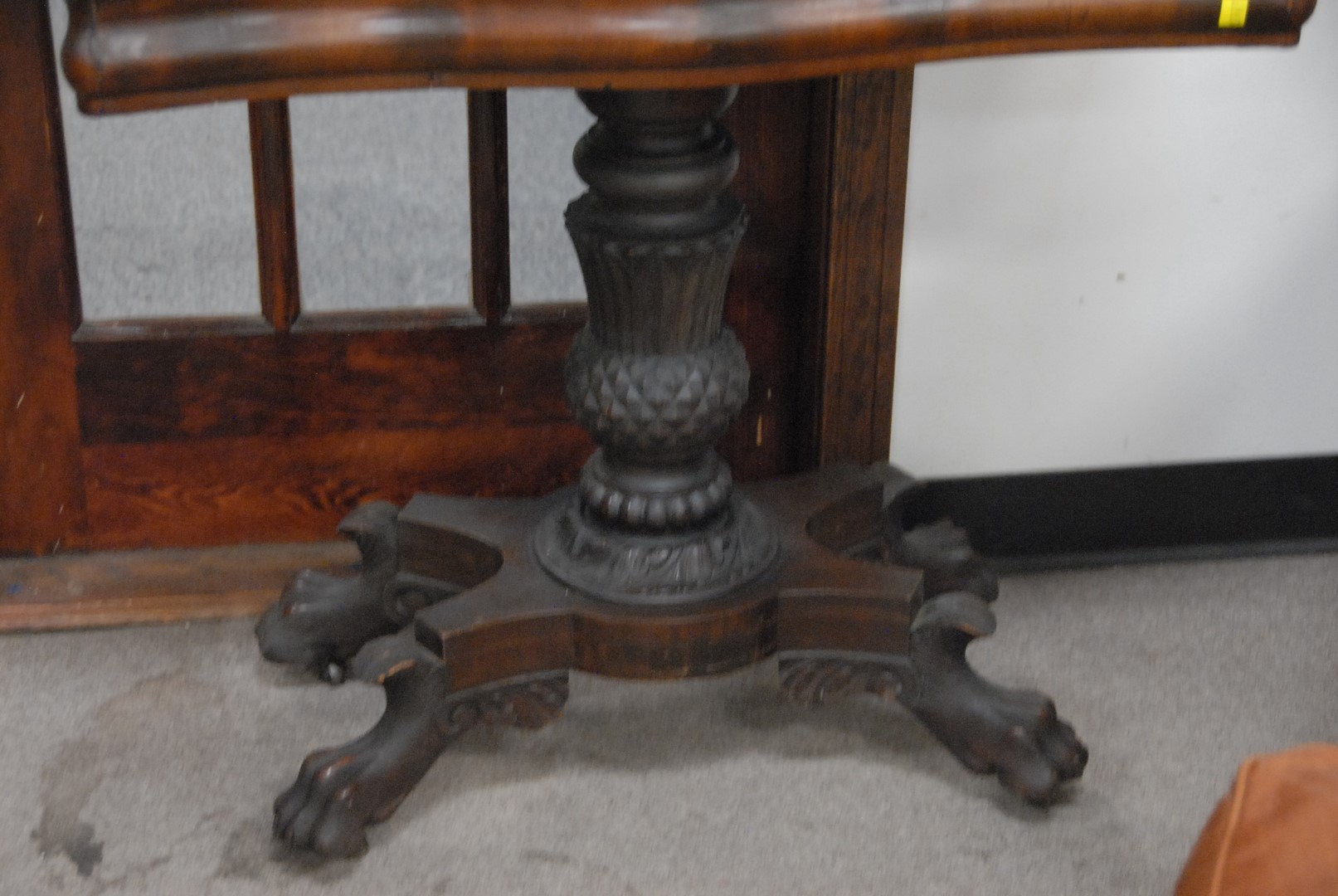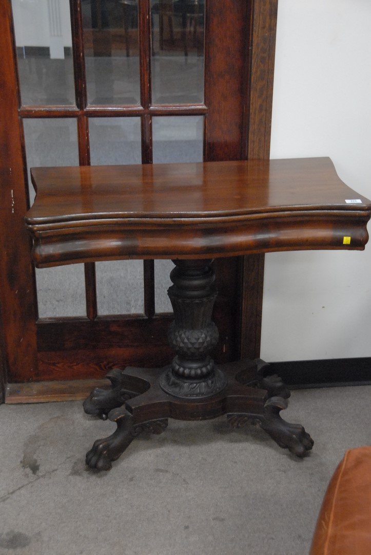 Federal style mahogany game table with carved paw feet. ht. 34 in. wd. 31 1/2in.