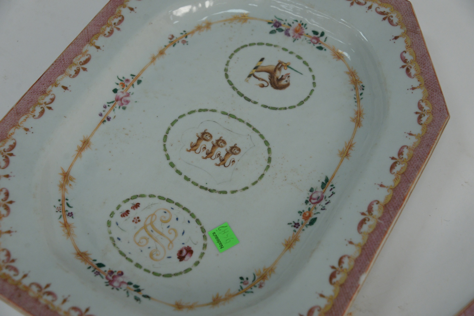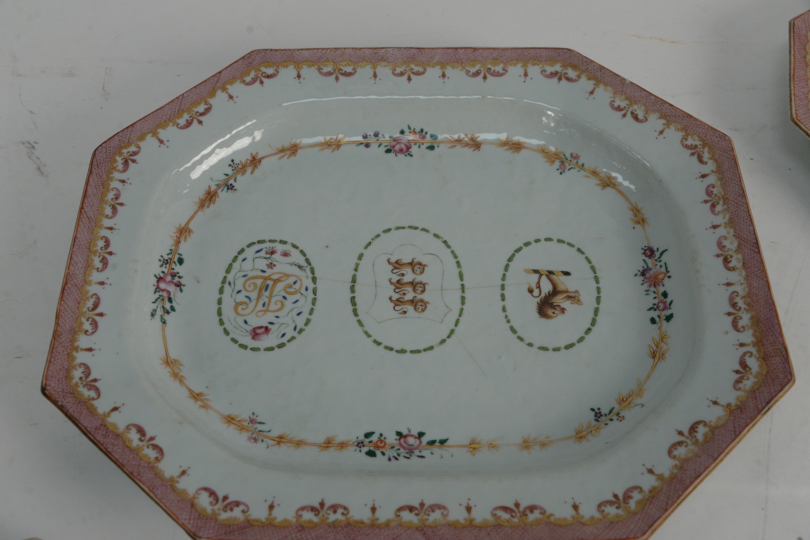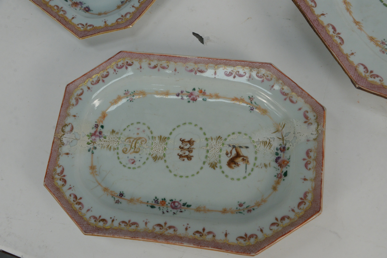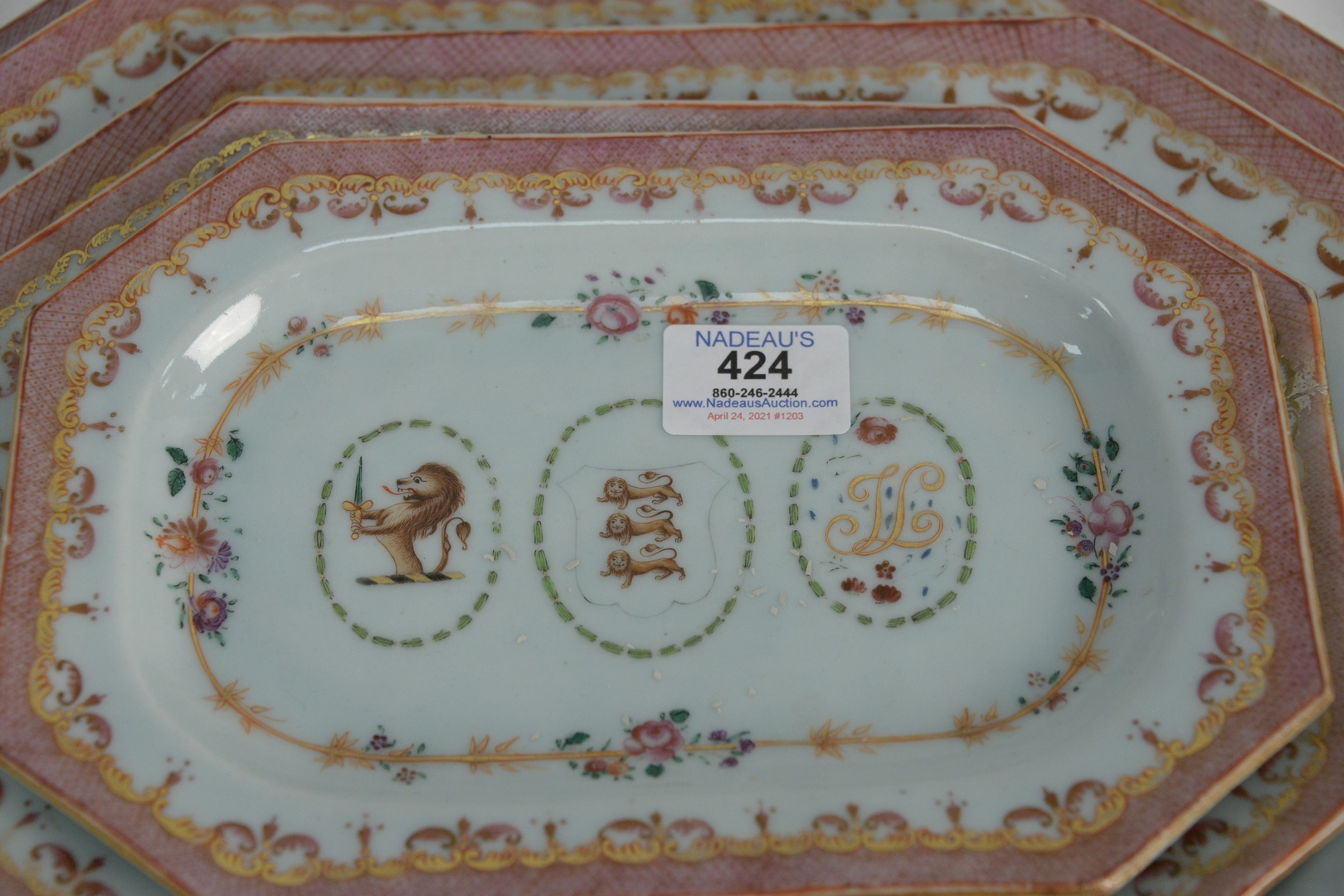 Lot 424: Five Piece Nest of Chinese Export Armorial Porcelain Serving Trays, Qing Dynasty, Qianlong period, each painted with the Arms of Ludlow and with the initials J.L., circa 1775 or later, sizes ranging from 9 3/4 x 6 1/2 to 16 x 12 1/2.