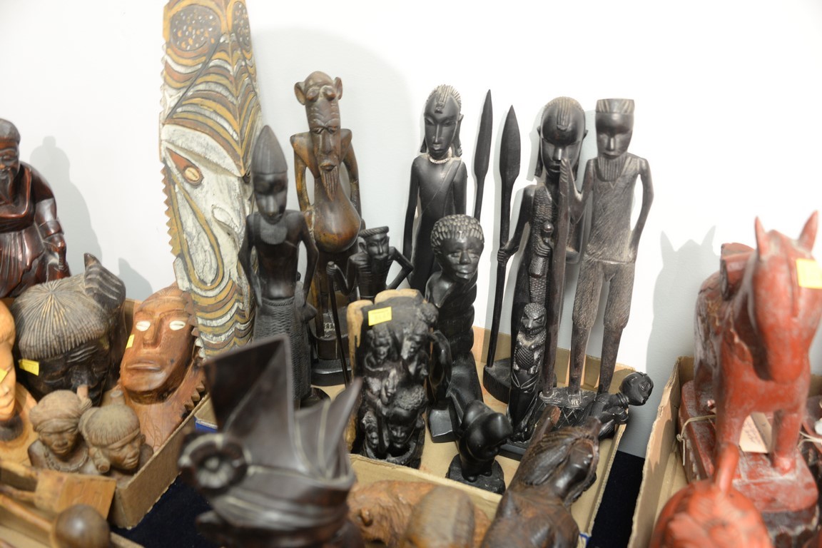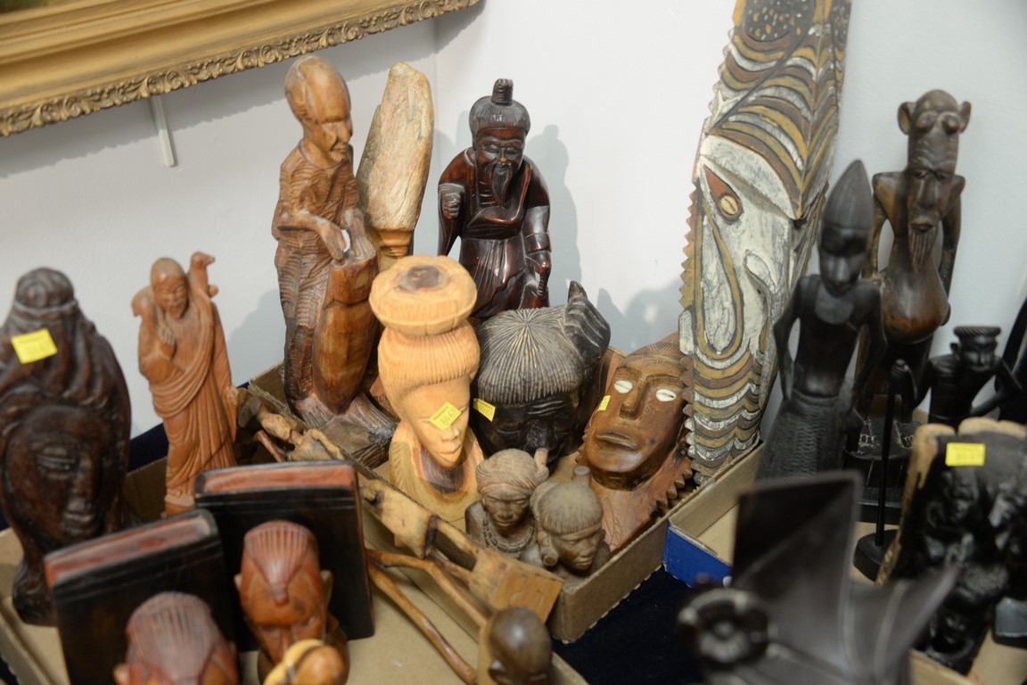 Lot 424: Four box lots to include pair of hand carved African hardwood busts, Bali Indonesian carved bust of a man, Rosewood bust, Asian figu…