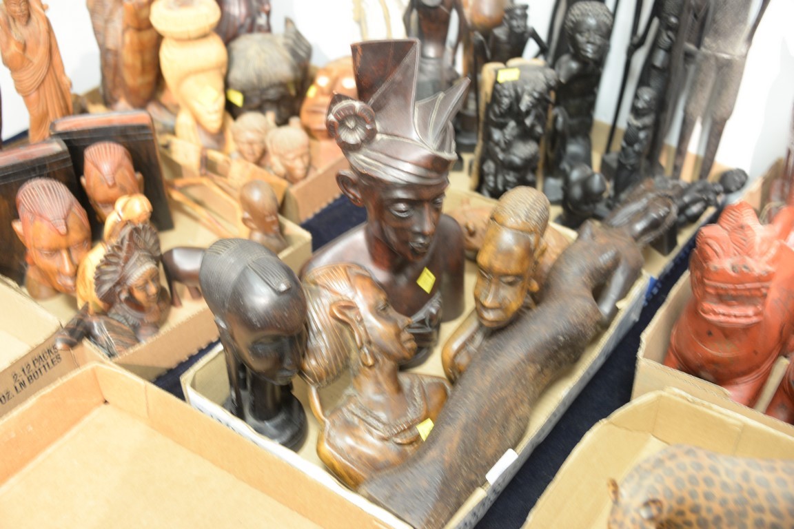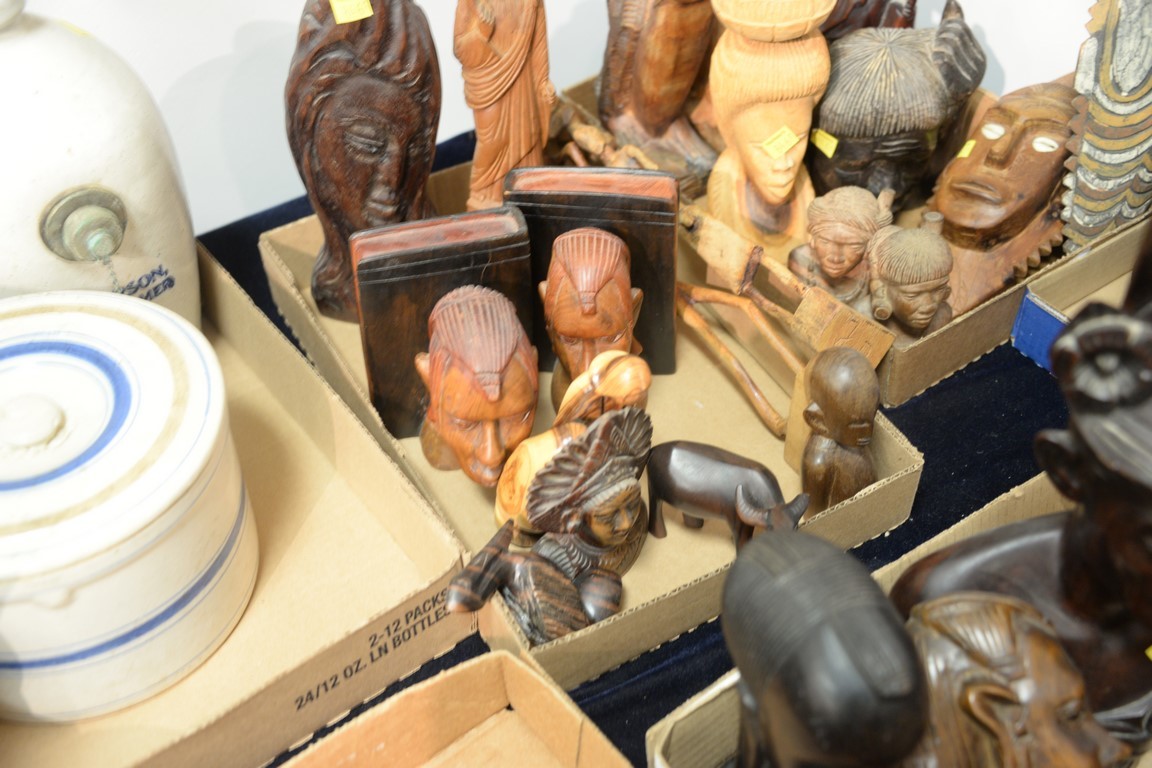 Four box lots to include pair of hand carved African hardwood busts, Bali Indonesian carved bust of a man, Rosewood bust, Asian figures, etc. Provenance: Estate of Arthur C. Pinto, MD