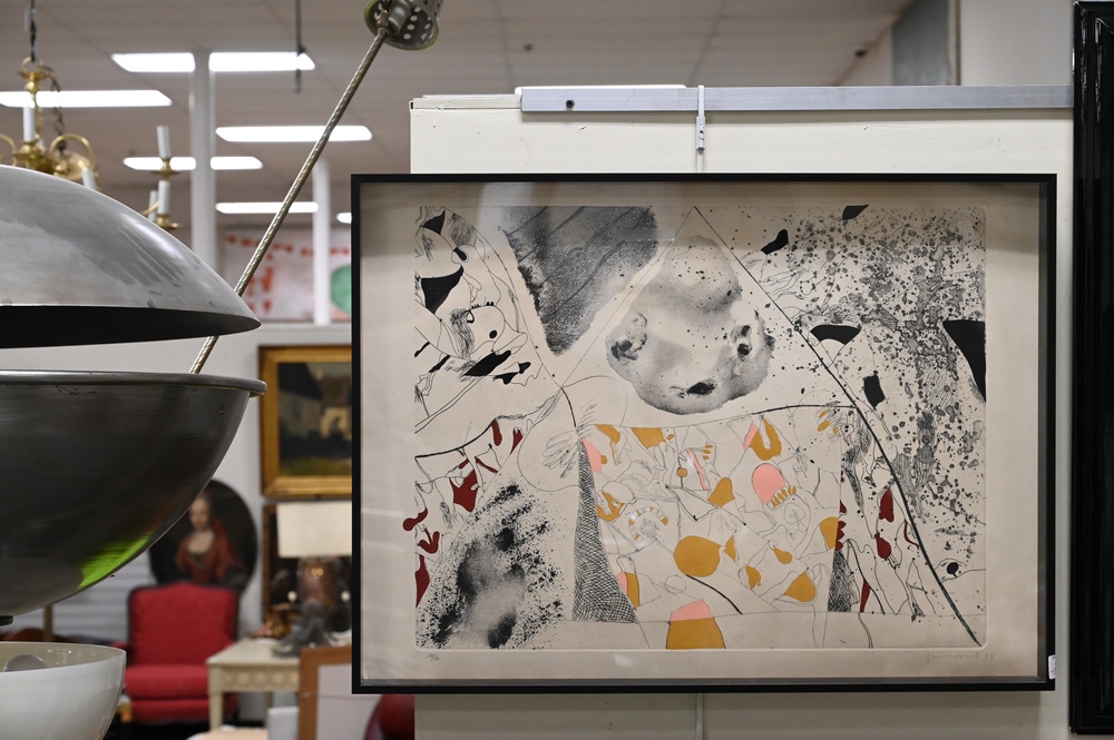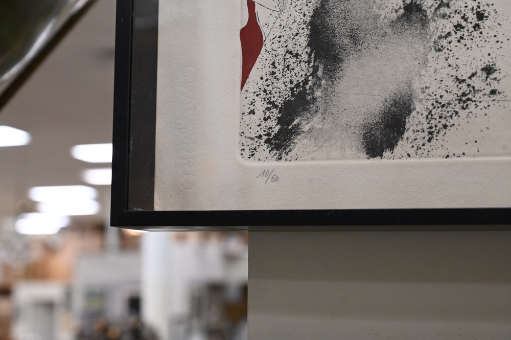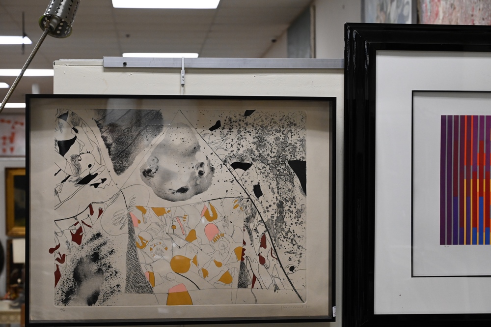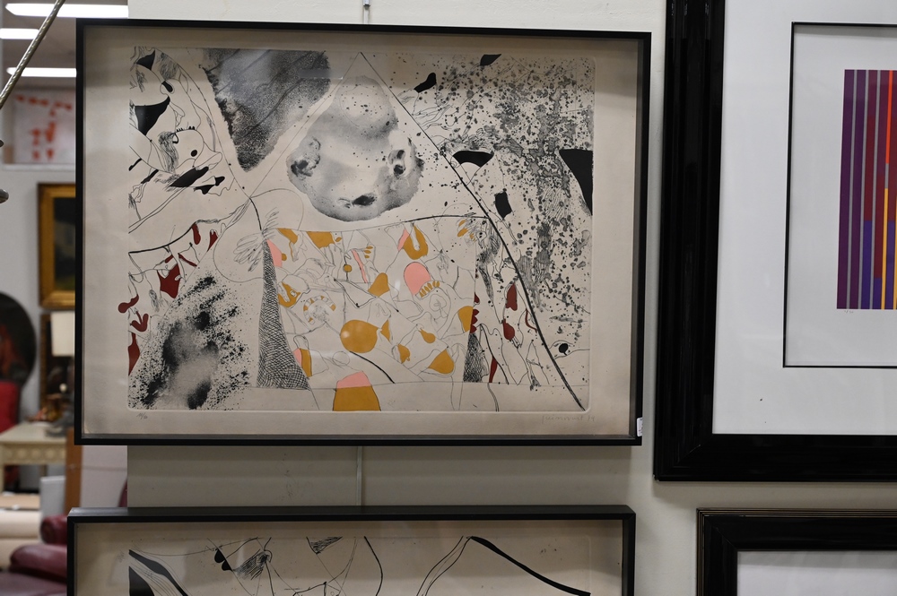 Lot 424: Josep Guinovart Y Bertran (Spanish, 1927-2007), Untitled abstraction, gouache and etching on paper, signed, dated and numbered in pencil through the lower margin 10/50 Guinovart 74′, River Gallery Letter on verso, image size 18.5″ x 24.5″.
