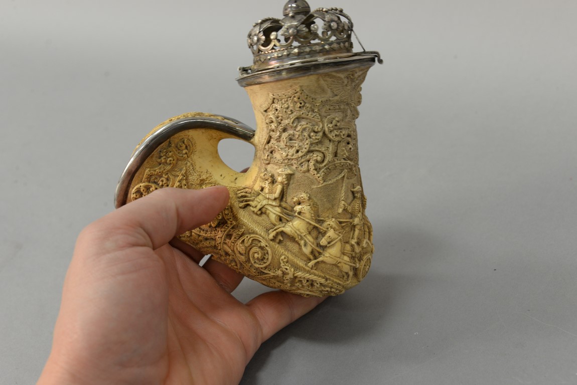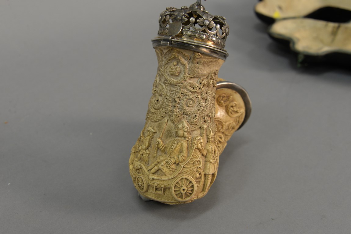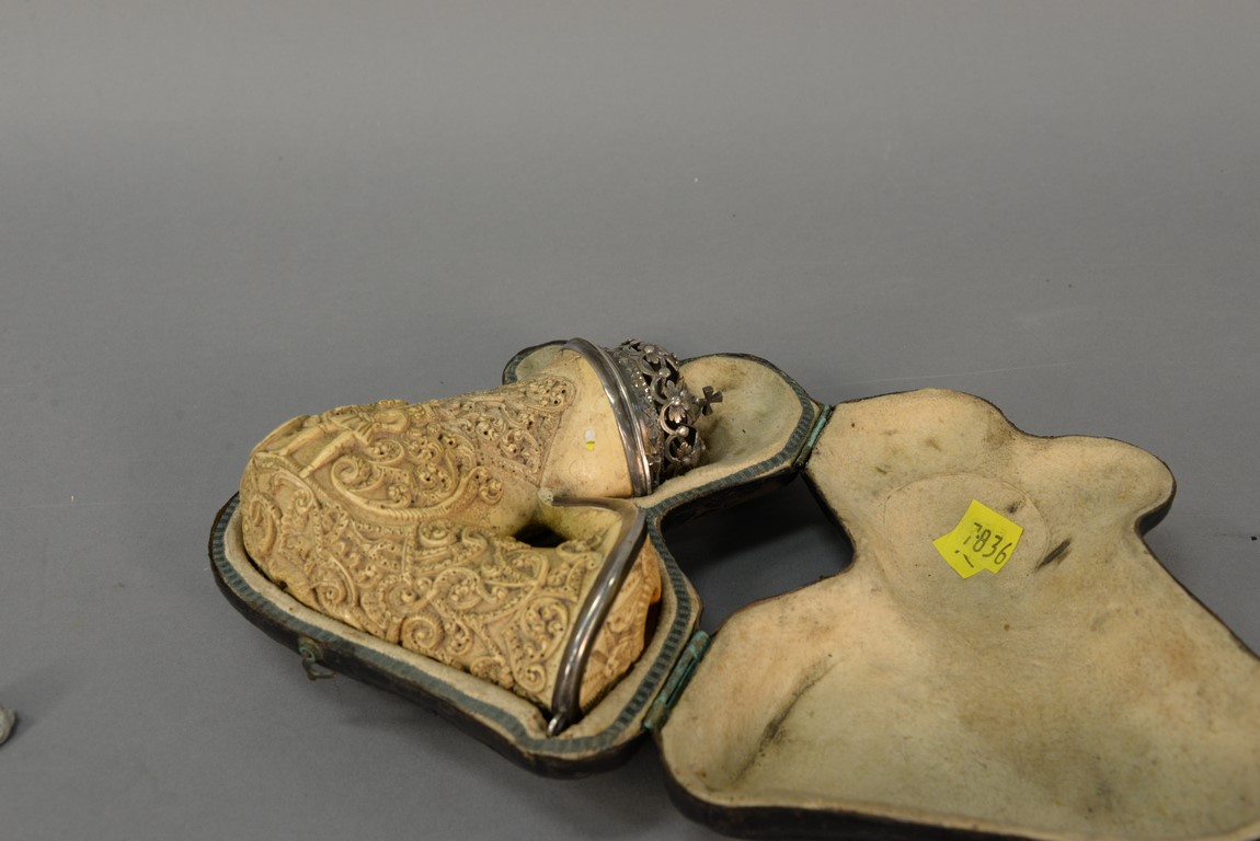 Lot 424: Large Meerschaum pipe depicting Royalty in horse drawn coach and silver crown top in fitted case. lg. 5 in. ht. 6 in.