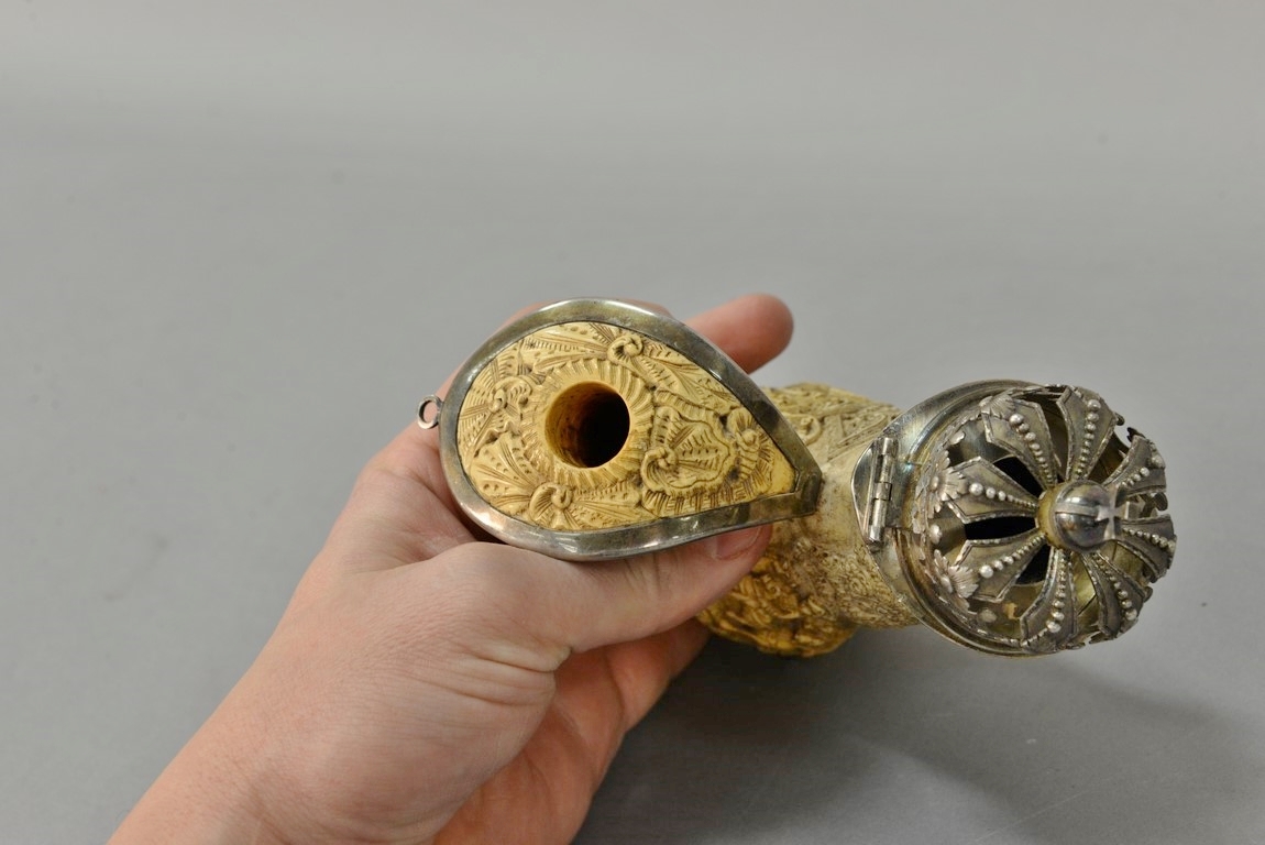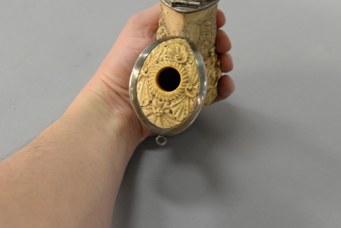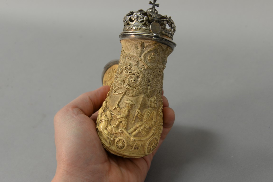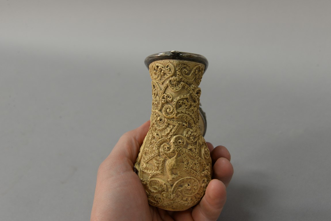 Lot 424: Large Meerschaum pipe depicting Royalty in horse drawn coach and silver crown top in fitted case. lg. 5 in. ht. 6 in.