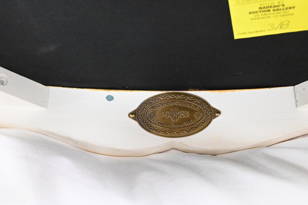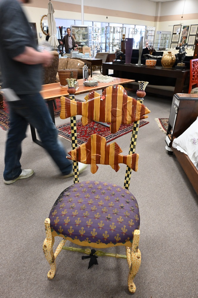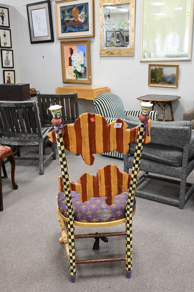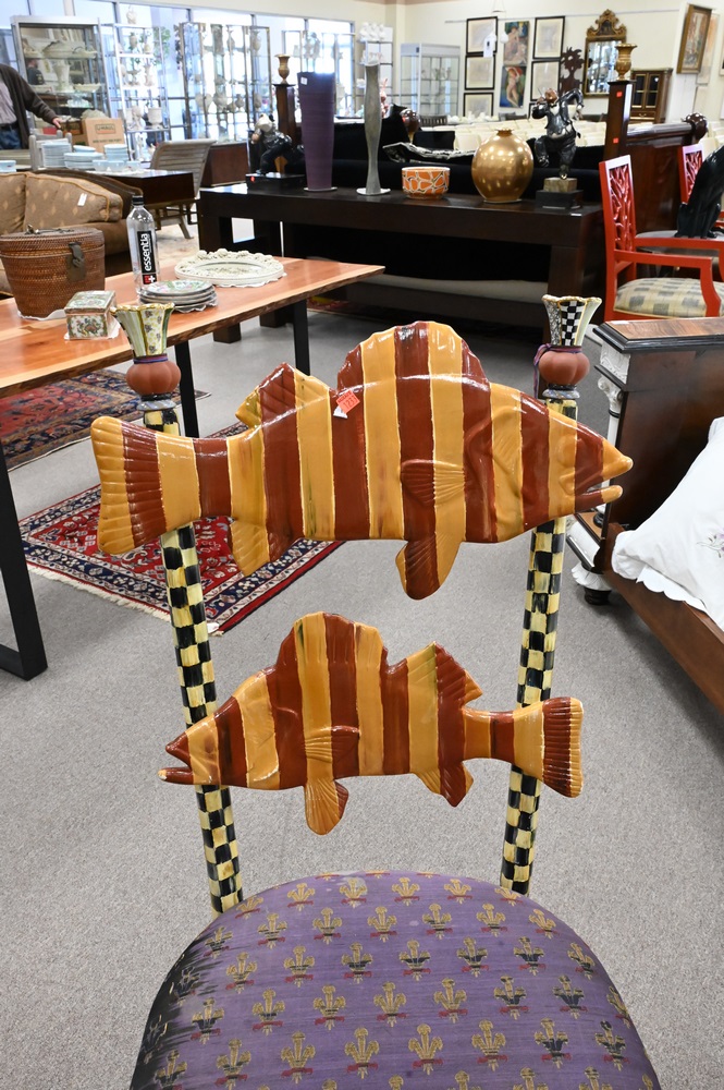 Lot 424: Mackenzie Childs “Fish” Chair, having painted fish back with ceramic finials, height 44 inches.