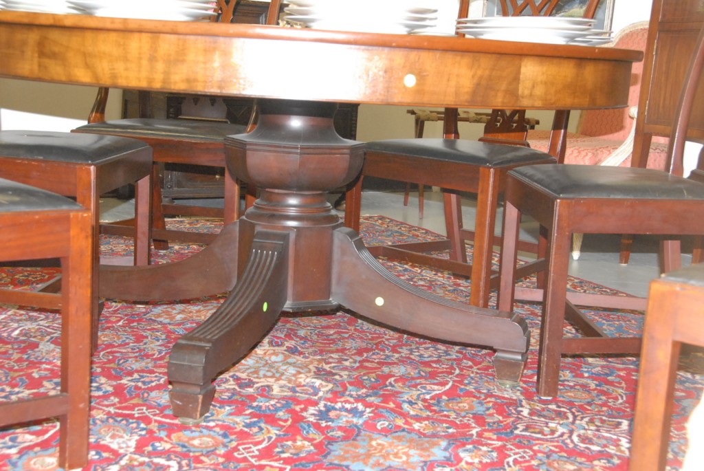 Margolis mahogany round dinging table with large pedestal base with drop down center legs and rack of five 12in. leaves. height 30in. diameter 5ft. opens to 120in.