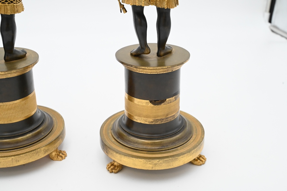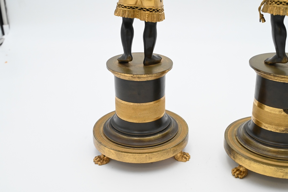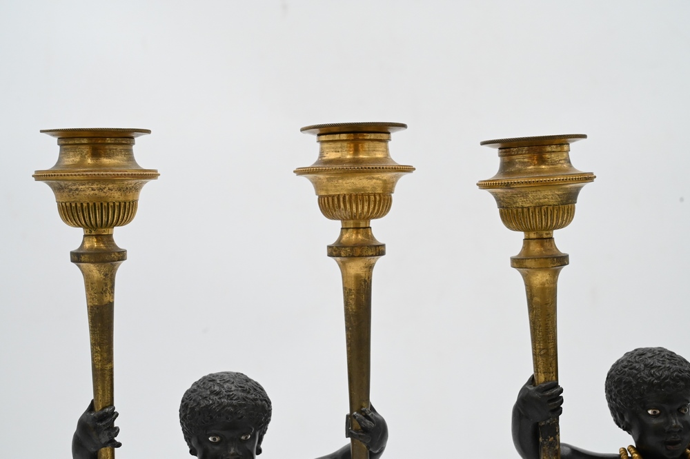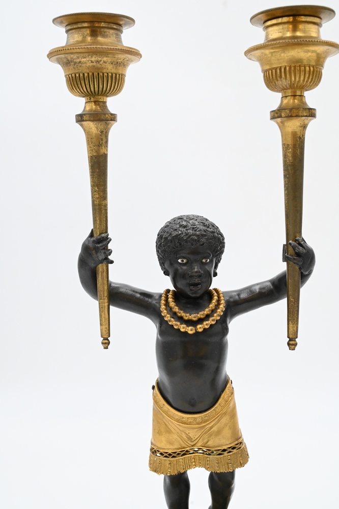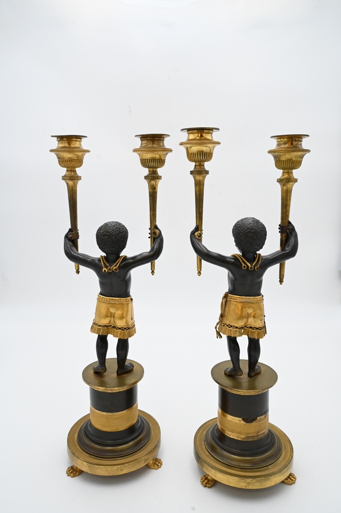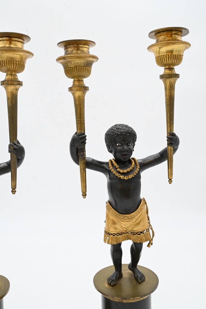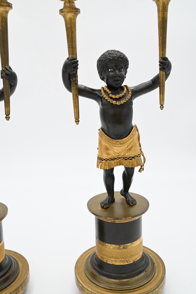Lot 424: Near Pair of Directoire Ormolu and Patinated Bronze Candelabras, Aubon Sauvage, each modeled as Blackamoor holding two torches with …
