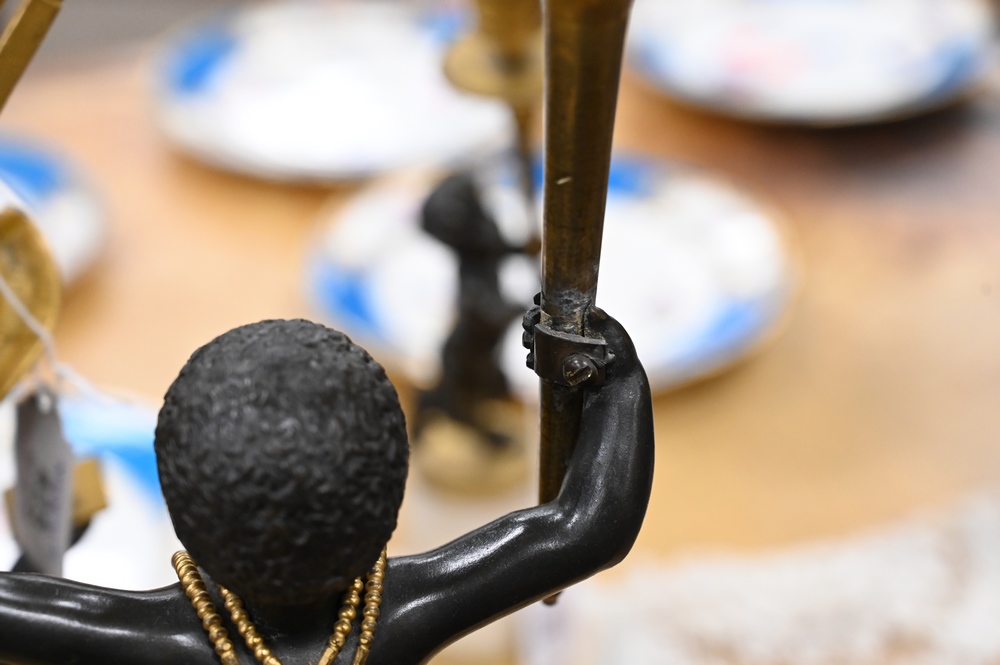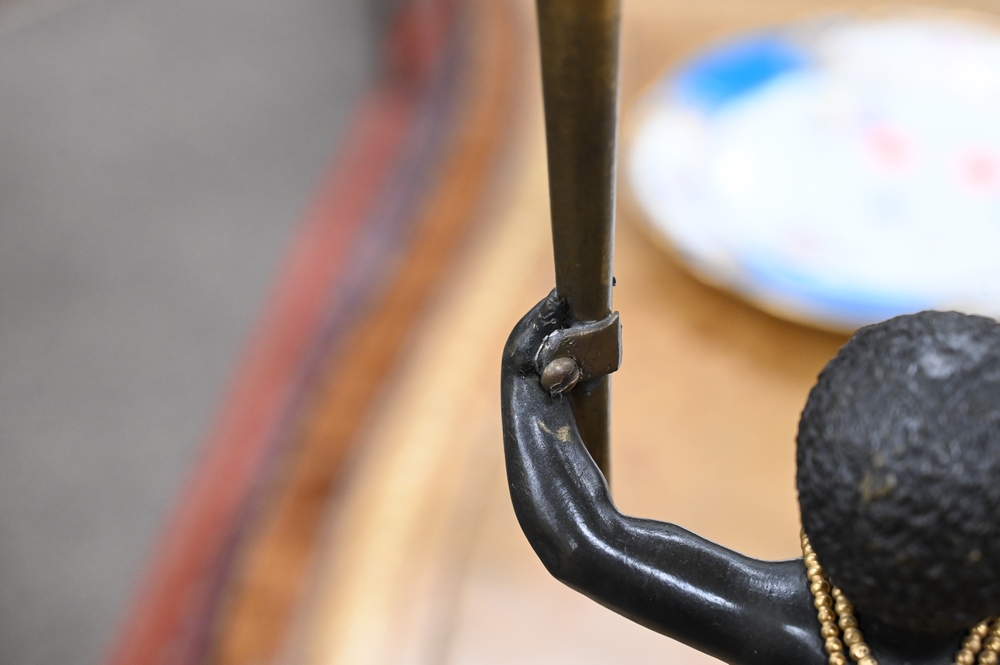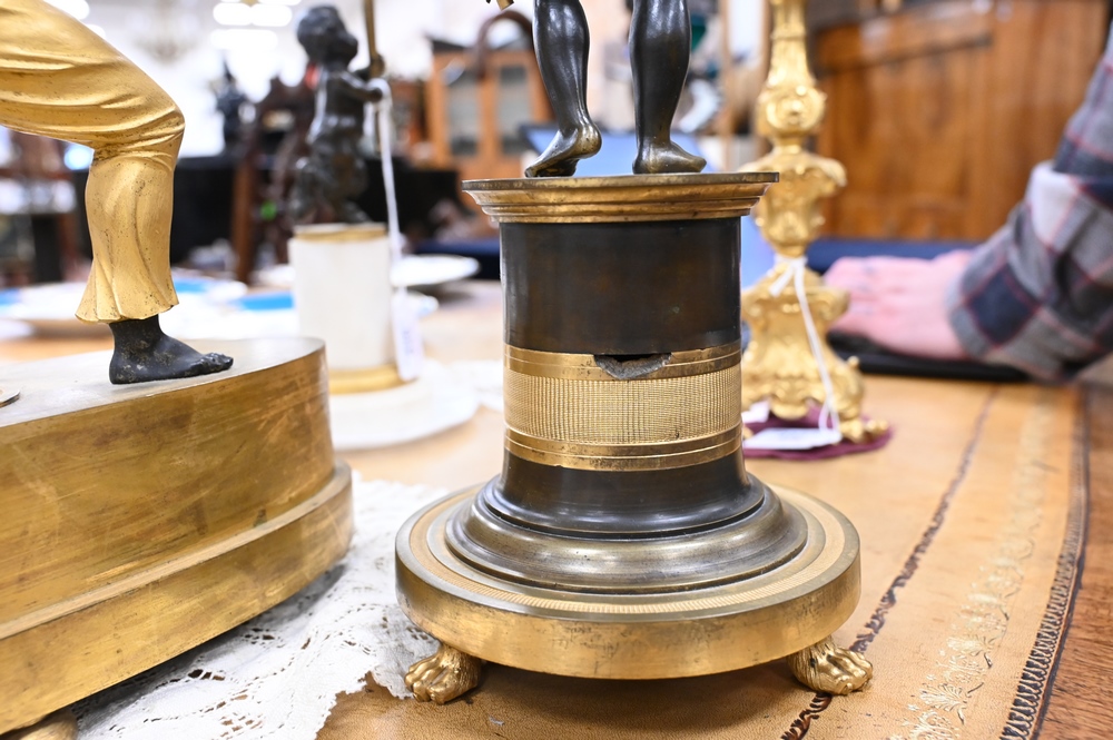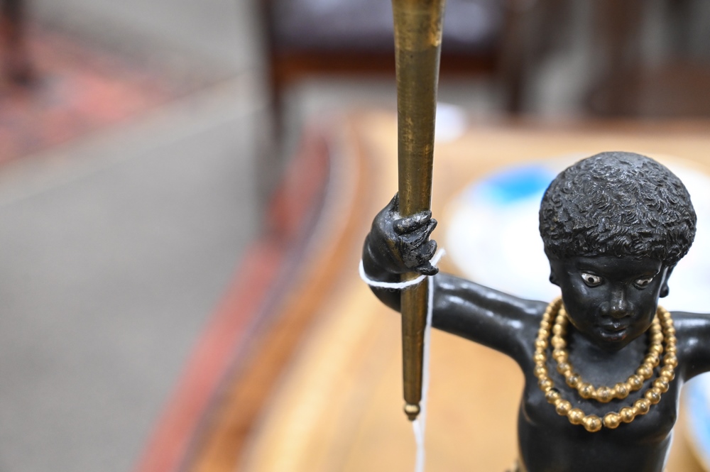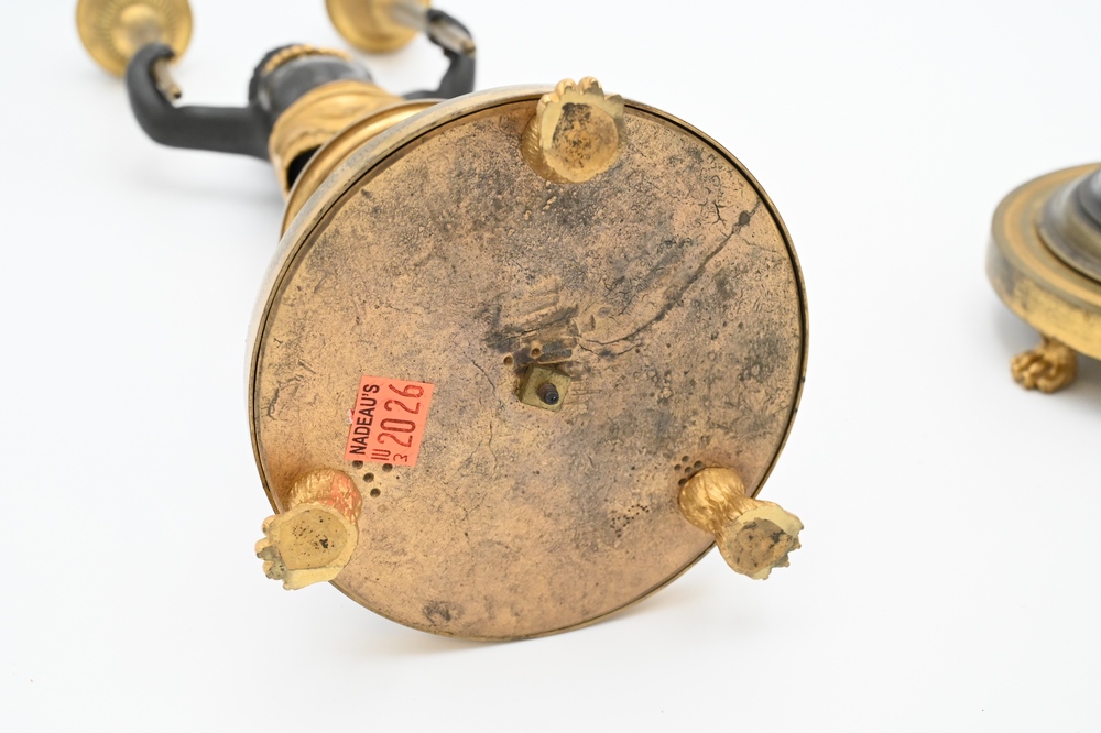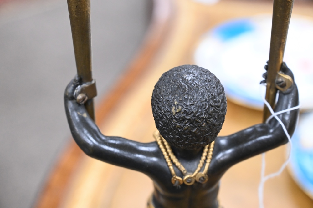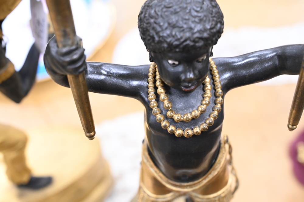 Lot 424: Near Pair of Directoire Ormolu and Patinated Bronze Candelabras, Aubon Sauvage, each modeled as Blackamoor holding two torches with …