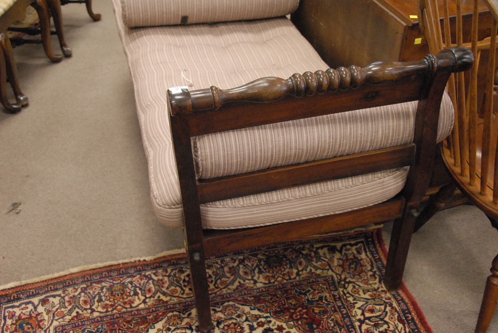 Lot 424: Rosewood daybed with custom cushion and round pillows, 19th century. ht. 34 in. lg. 74 in. dp. 25 1/2 in.