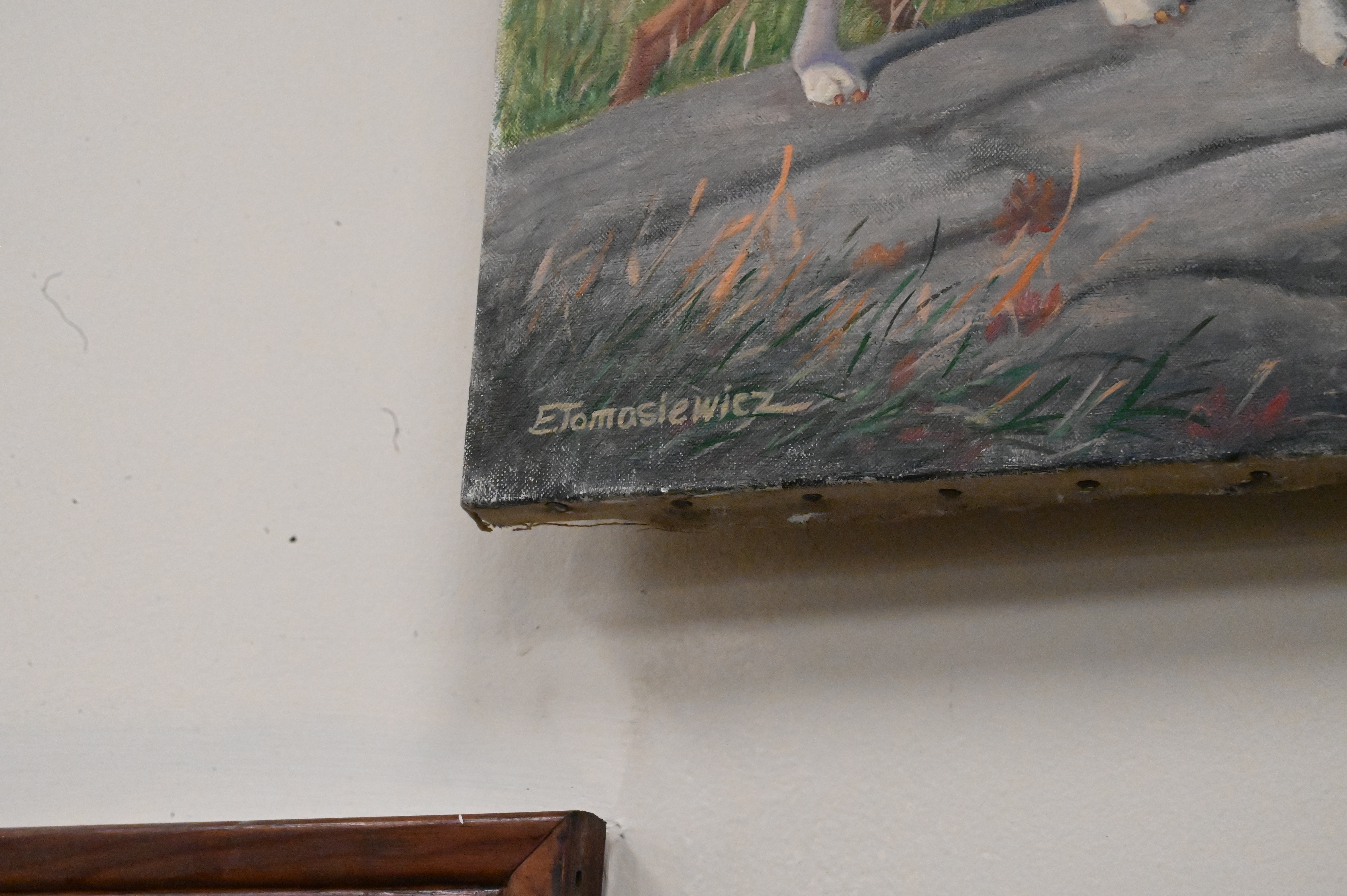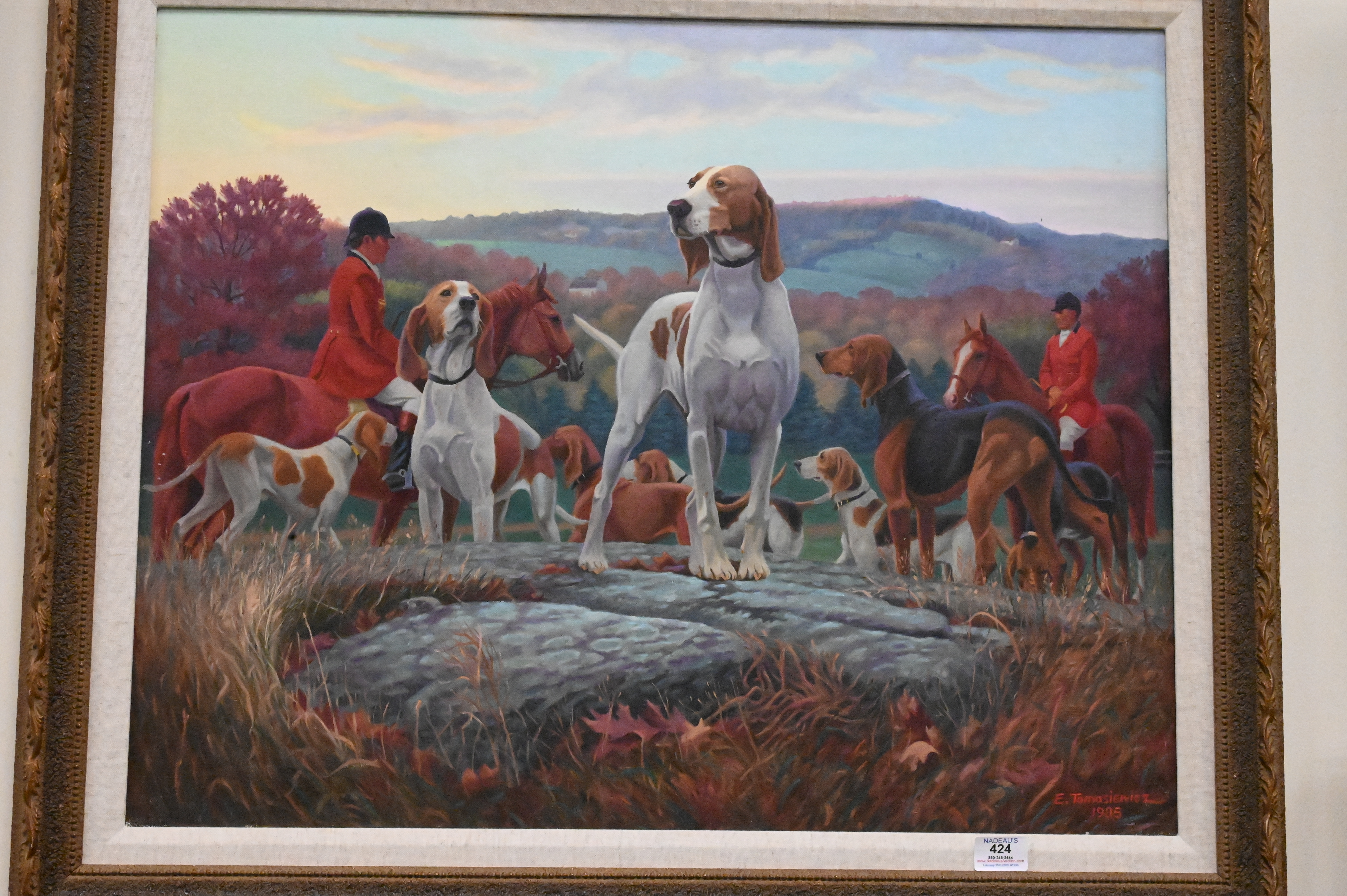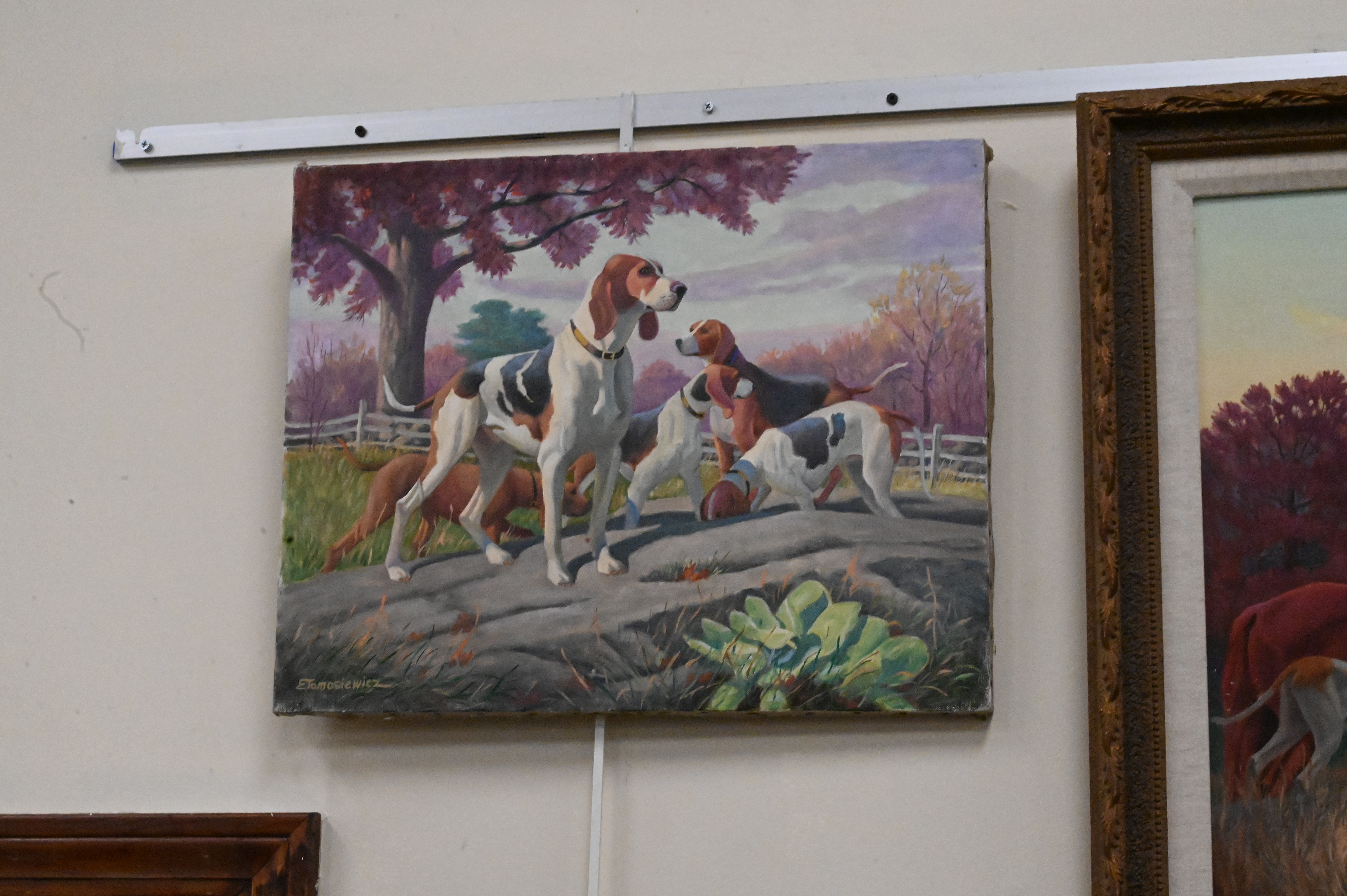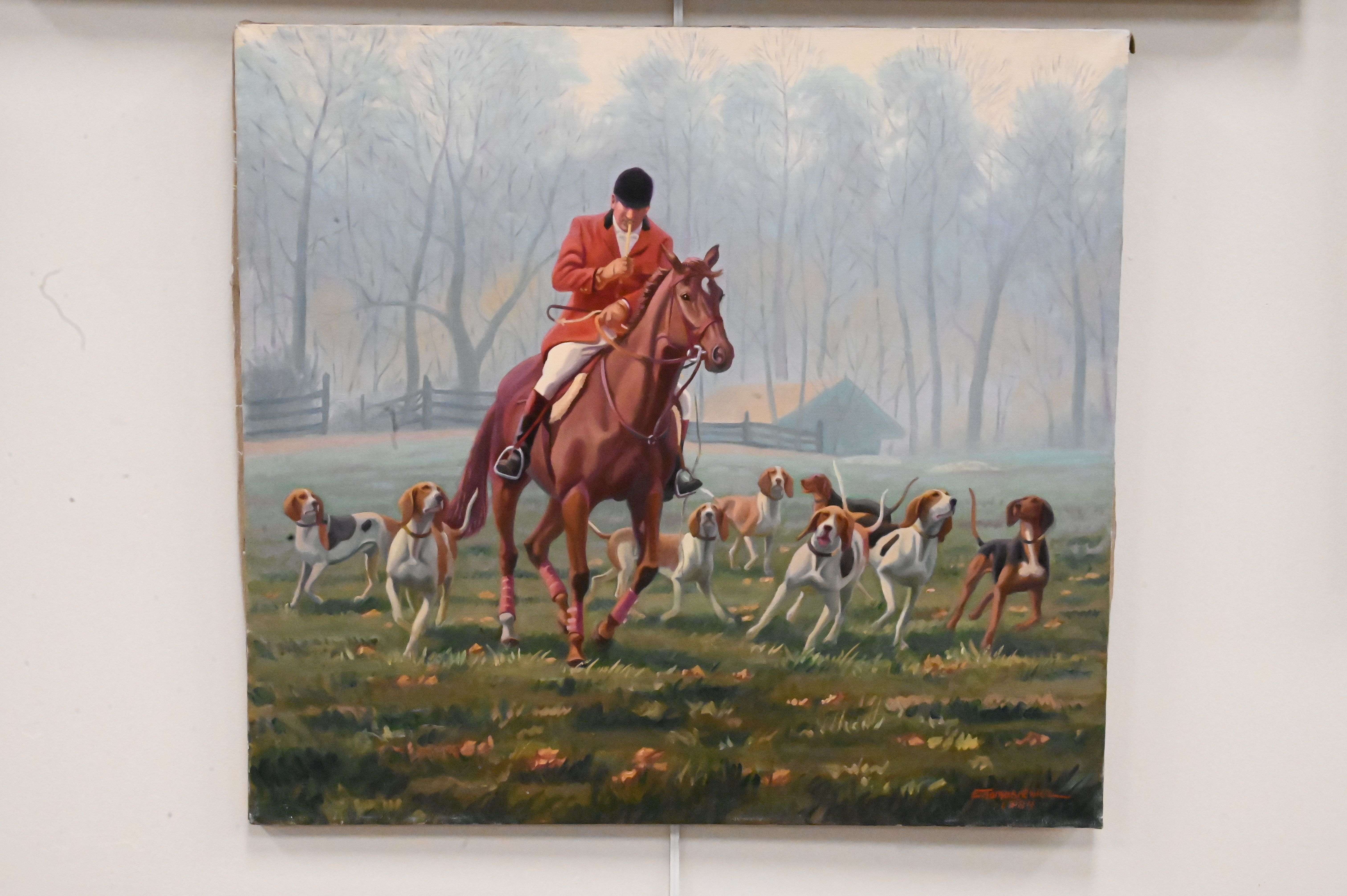 Set of Three Edward Tomasiewicz (1919 – 2006) Paintings, oils on canvas, equestrian scene, horse training, along with two fox hunts with hounds, signed E. Tomasiewicz, 24″ x 30″.