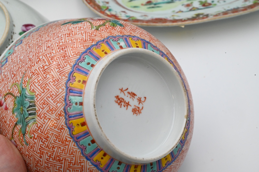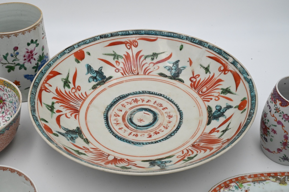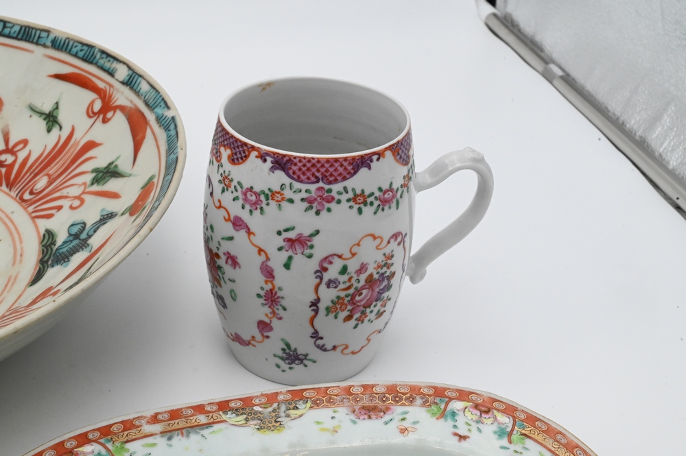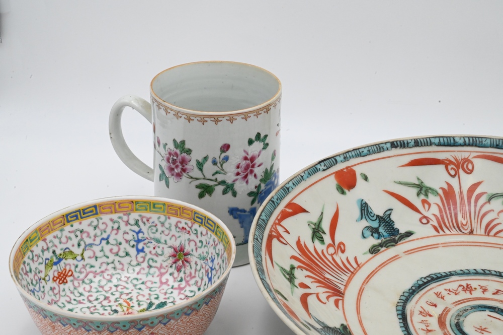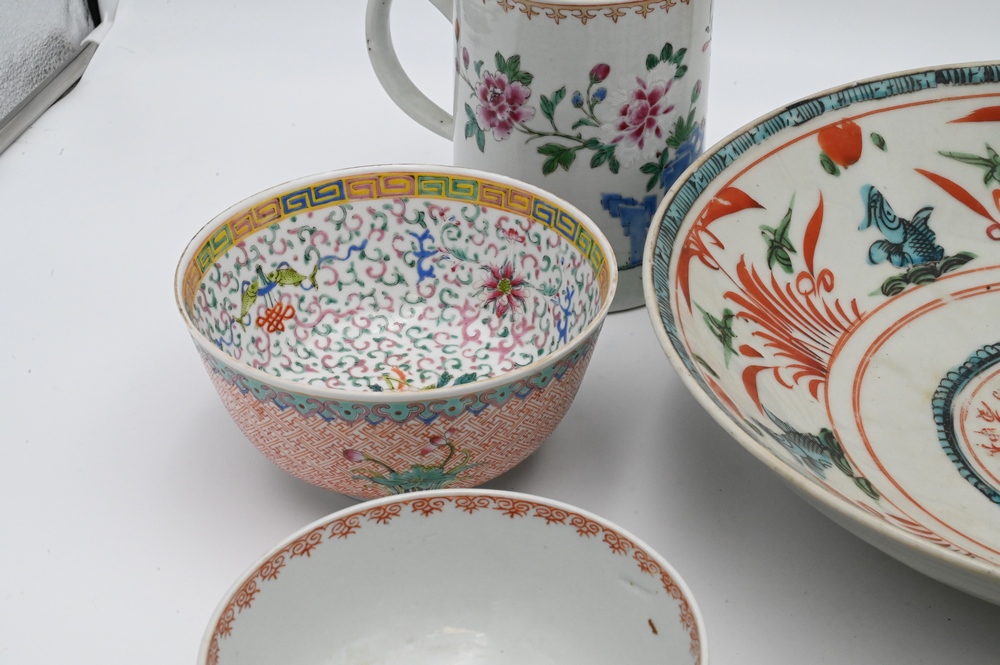 Seven Piece Group of Chinese Porcelain, to include a Chinese Export tankard, Famille Rose bowl with scrolling vines and blossoming flowers; etc.